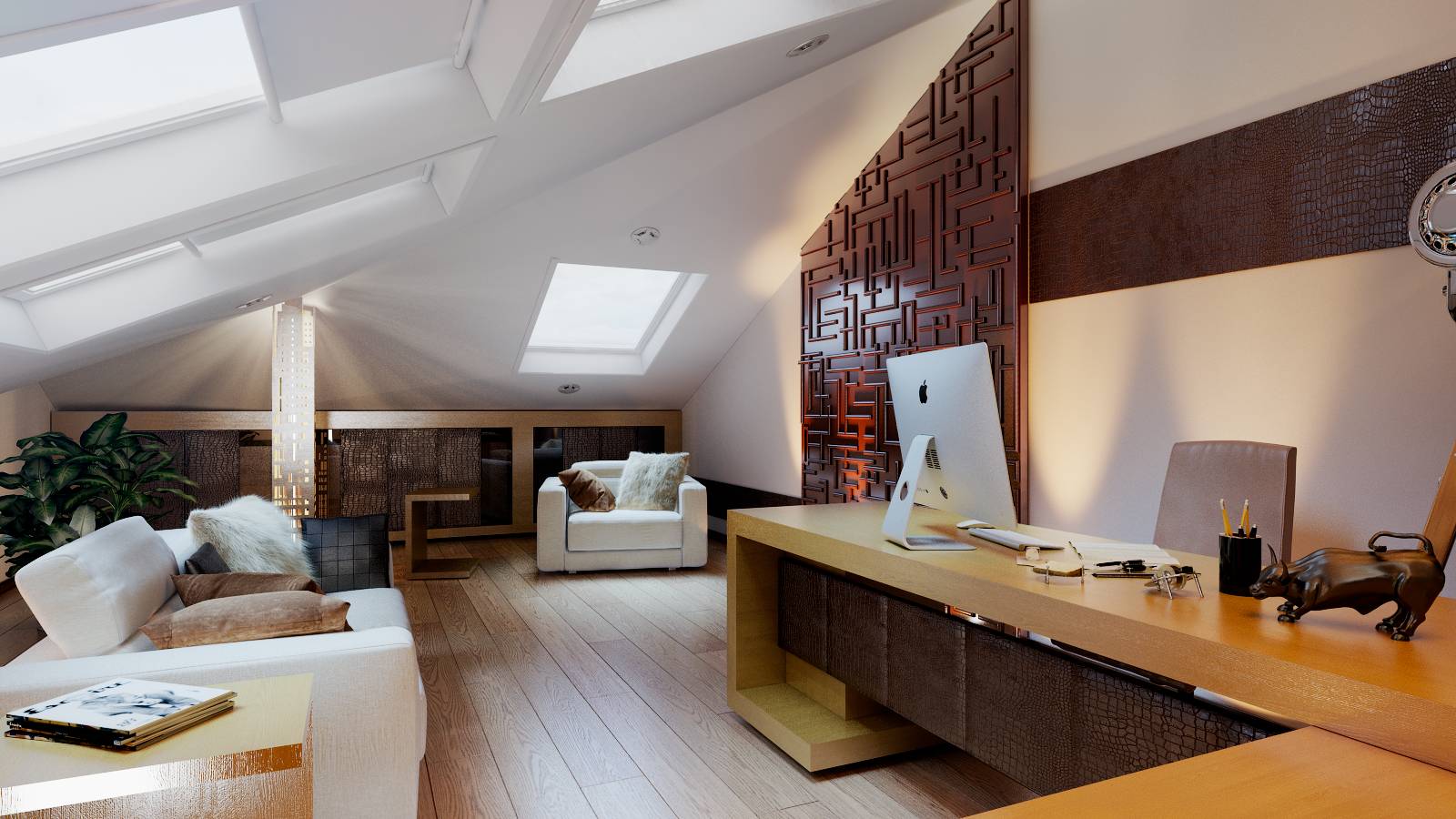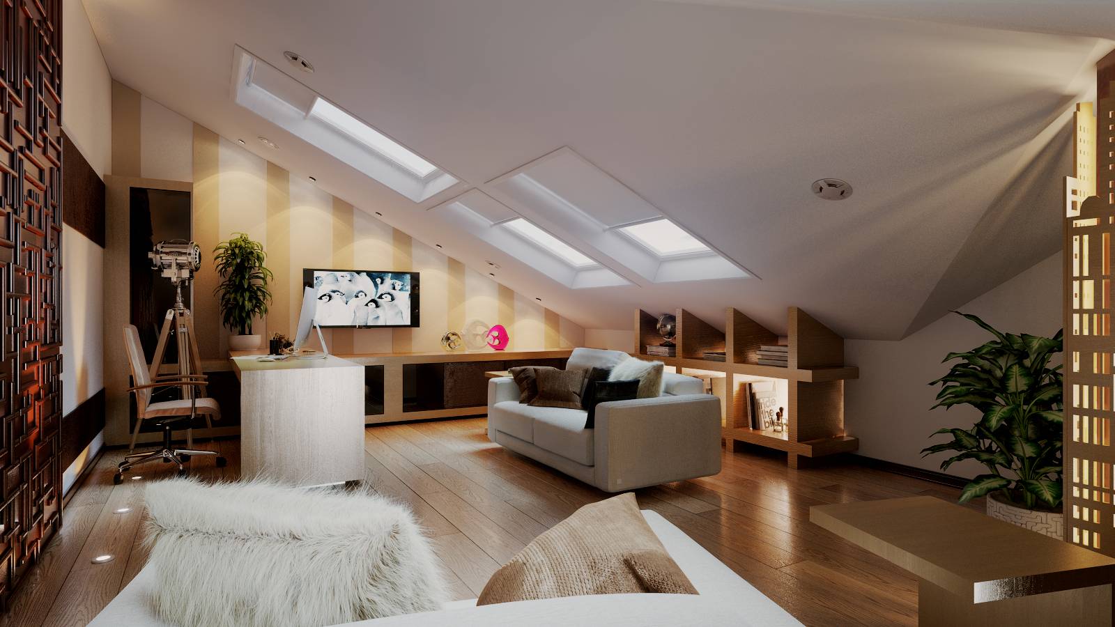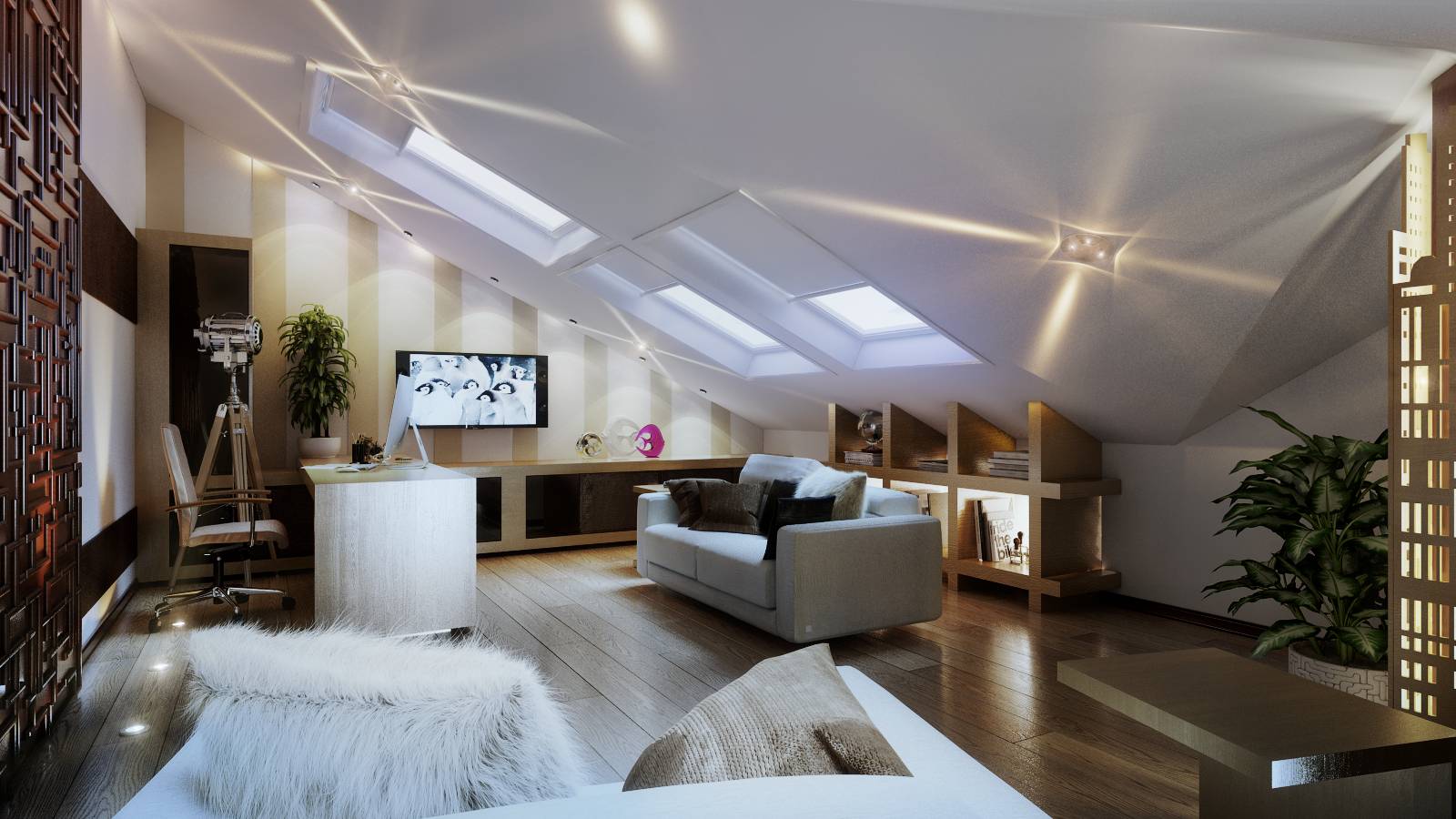 Пол выложен паркетной доской, полосатые обои на одной из стен поддерживают его цветовую гамму пола. Мансардные окна оборудованы белыми в тон потолка ролл-ставнями с дистанционным управлением. На перекрестье кровельных скатов разместился напольный светильник, который напоминает ночной небоскреб. Свет от него интересно преломляется на потолочных плоскостях.