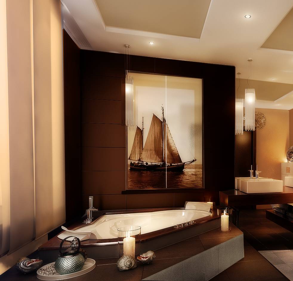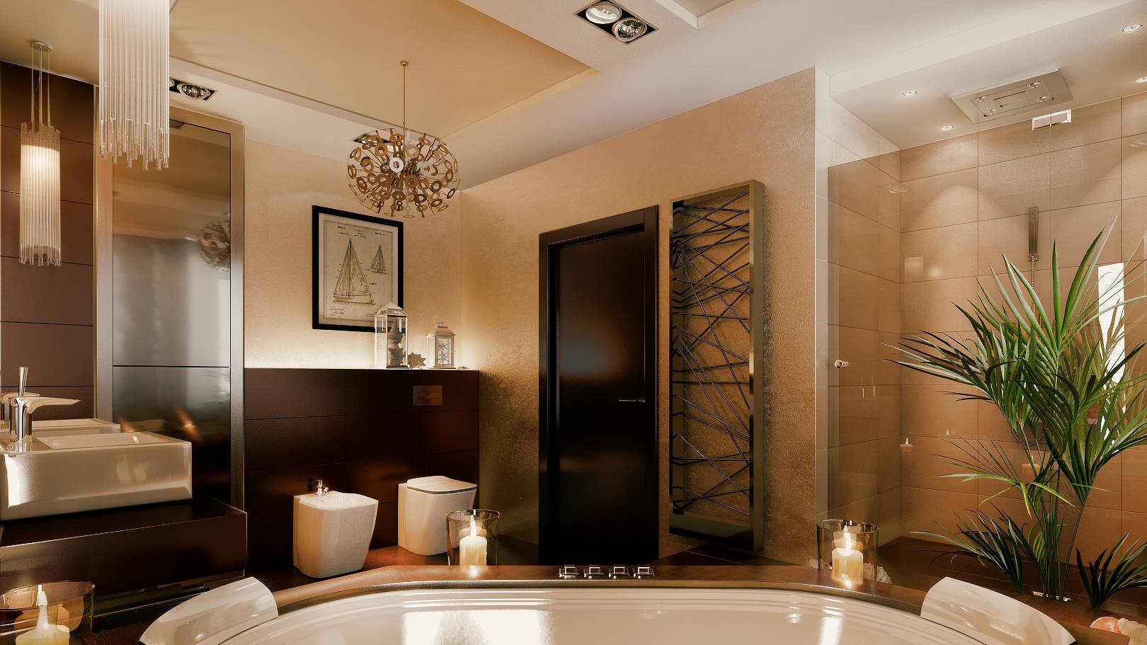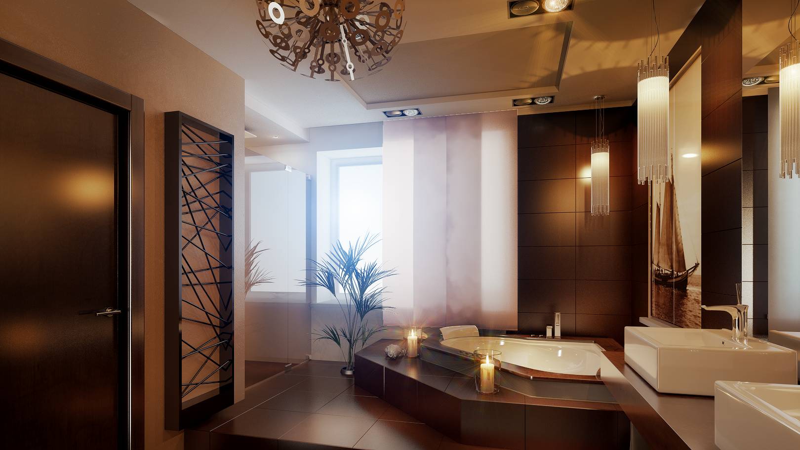 В интерьере комнаты также доминируют коричневые цвета: пол, стены и подиум ванны облицованы плиткой. Стену над ванной украшает фотопанно в режиме сепия с изображением парусника. На красивом контрасте с темной фактурой стена во входной зоне отделана влагостойкой перламутровой штукатуркой. Зона умывальников оформлена зеркальным полотном, дизайн кубических раковин продолжает концепцию прямолинейной геометрии. На одном уровне с купелью, чуть выше основного уровня пола, располагается ниша с душем, отгороженная прозрачными перегородками.