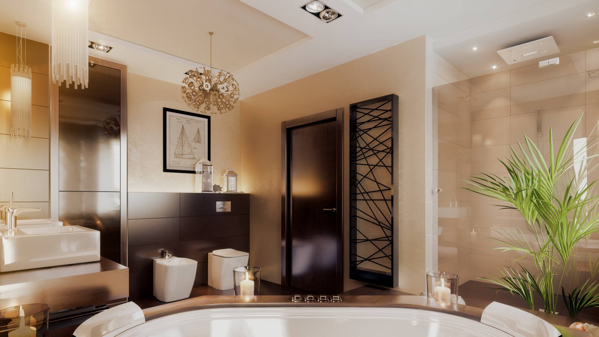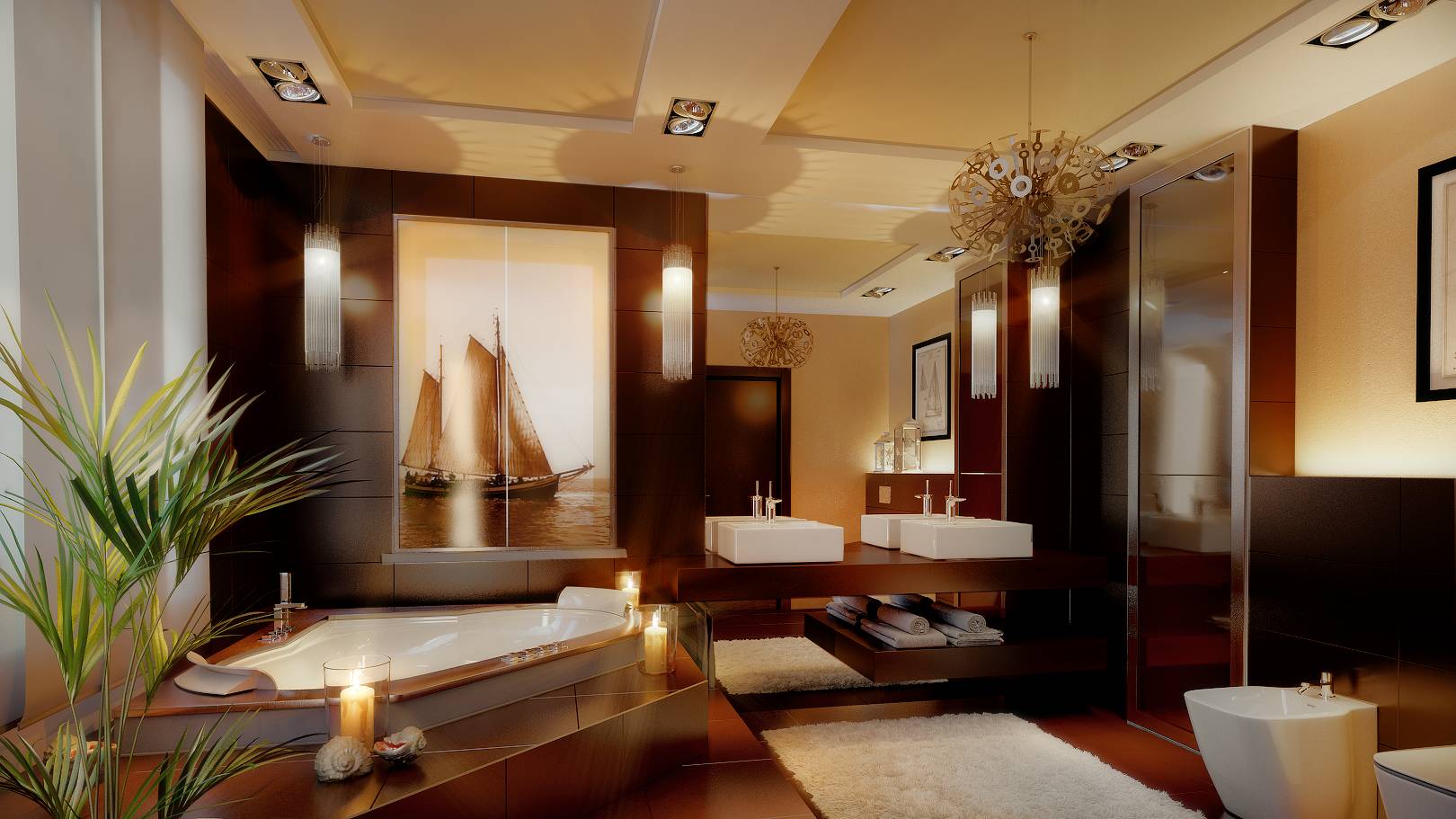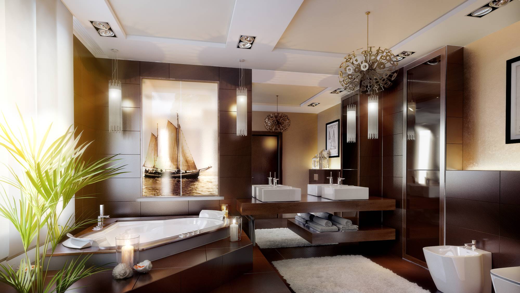 В интерьере комнаты также доминируют коричневые цвета: пол, стены и подиум ванны облицованы плиткой. Стену над ванной украшает фотопанно в режиме сепия с изображением парусника. На красивом контрасте с темной фактурой стена во входной зоне отделана влагостойкой перламутровой штукатуркой. Зона умывальников оформлена зеркальным полотном, дизайн кубических раковин продолжает концепцию прямолинейной геометрии. На одном уровне с купелью, чуть выше основного уровня пола, располагается ниша с душем, отгороженная прозрачными перегородками.