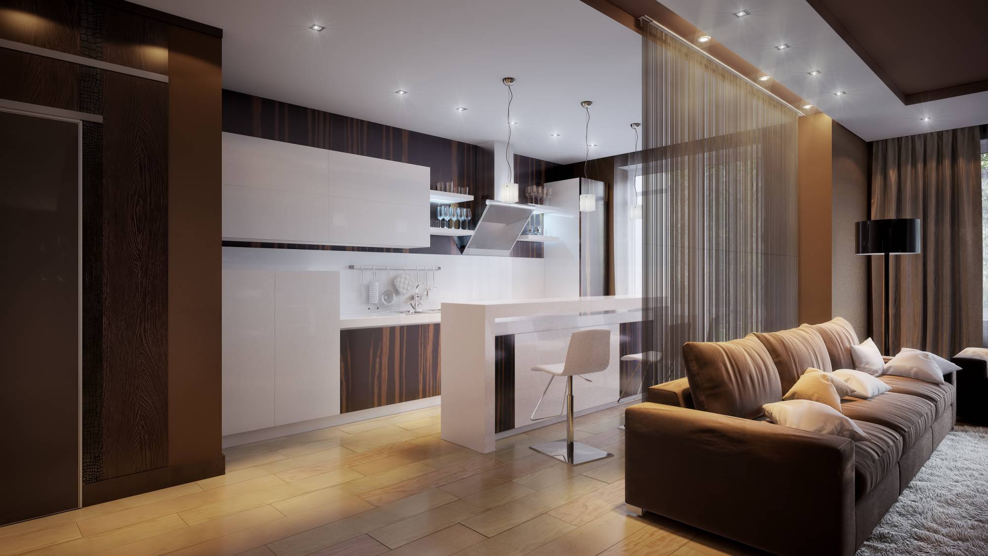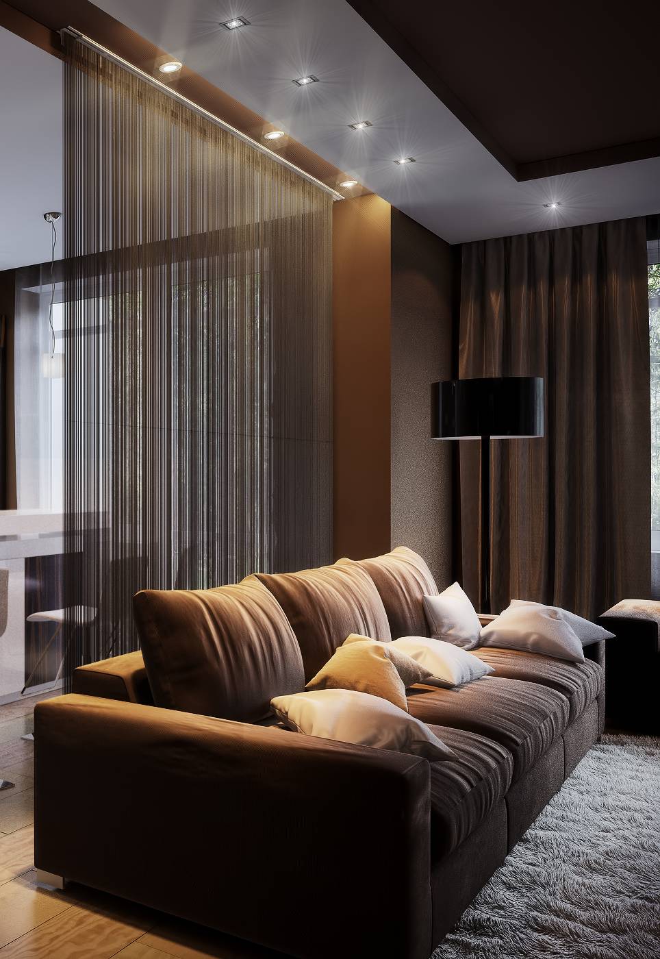 Декоративная штора-перегородка из множества коричневых нитей, подвешенная за спинкой дивана, условно отделяет место отдыха от кухни.