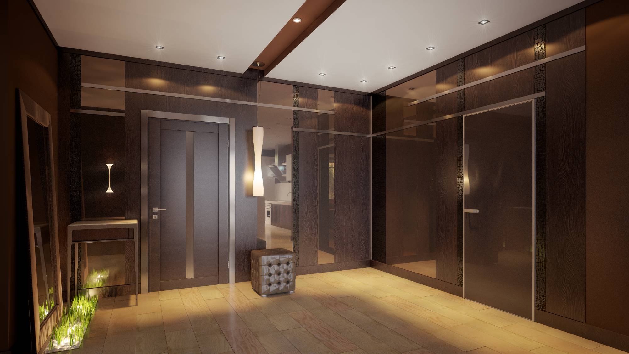 Густой коричневый цвет стен разбавлен металлическими профилями наличников входной и межкомнатной двери. Прислоненное к стене зеркало в окрашенной раме подсвечено напольной нишей с искусственной зеленью.