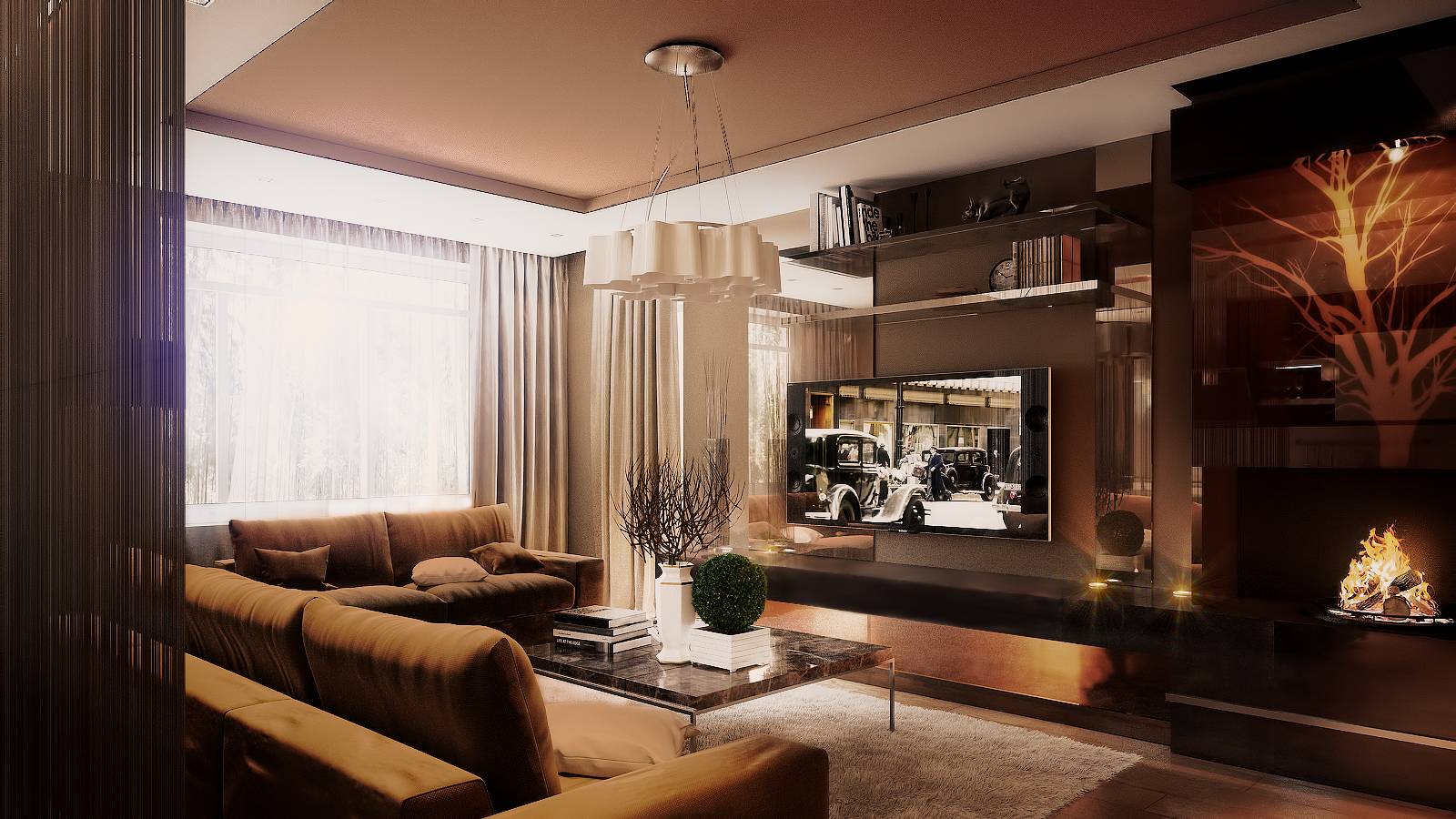 Диванную группу составляют два светло-коричневых дивана со спинками-подушками. Перед ними журнальный столик на прямых металлических ножках и столешницей под мрамор. Под ногами пушистый светло-бежевый ковер. Центральная часть подвесного потолка также окрашена в теплый коричневый оттенок, по периметру оставленного белым короба встроена точечная подсветка. Основной светильник – люстра с фантазийным абажуром.