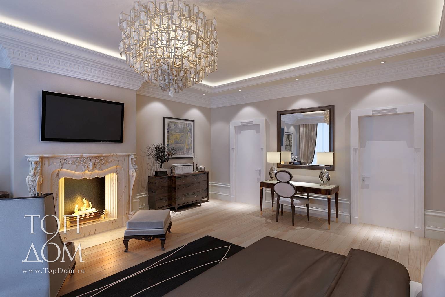 В интерьере доминируют классические элементы. Понизу идет высокий плинтус, потолок украшен пышными многослойными карнизами и подсветкой. Межкомнатные двери оформлены наличниками с классическими пилястрами, каминный портал – пышным резным декором.