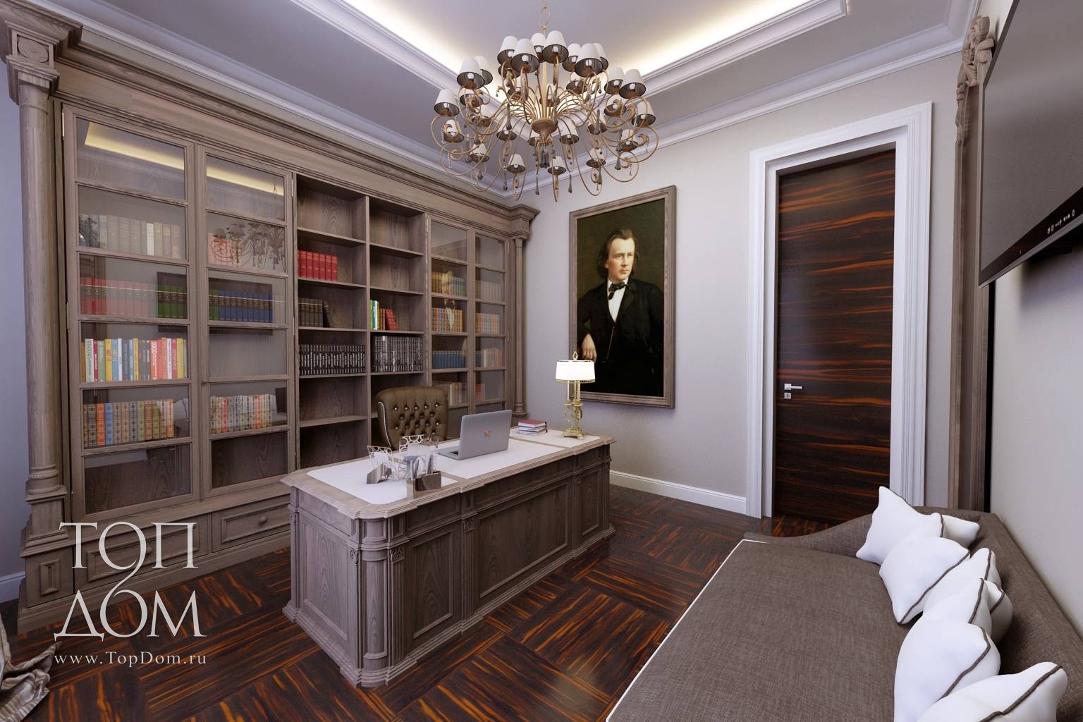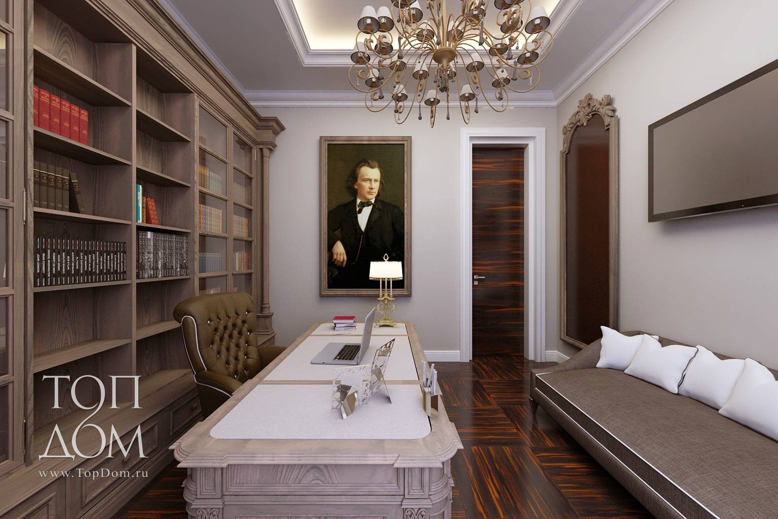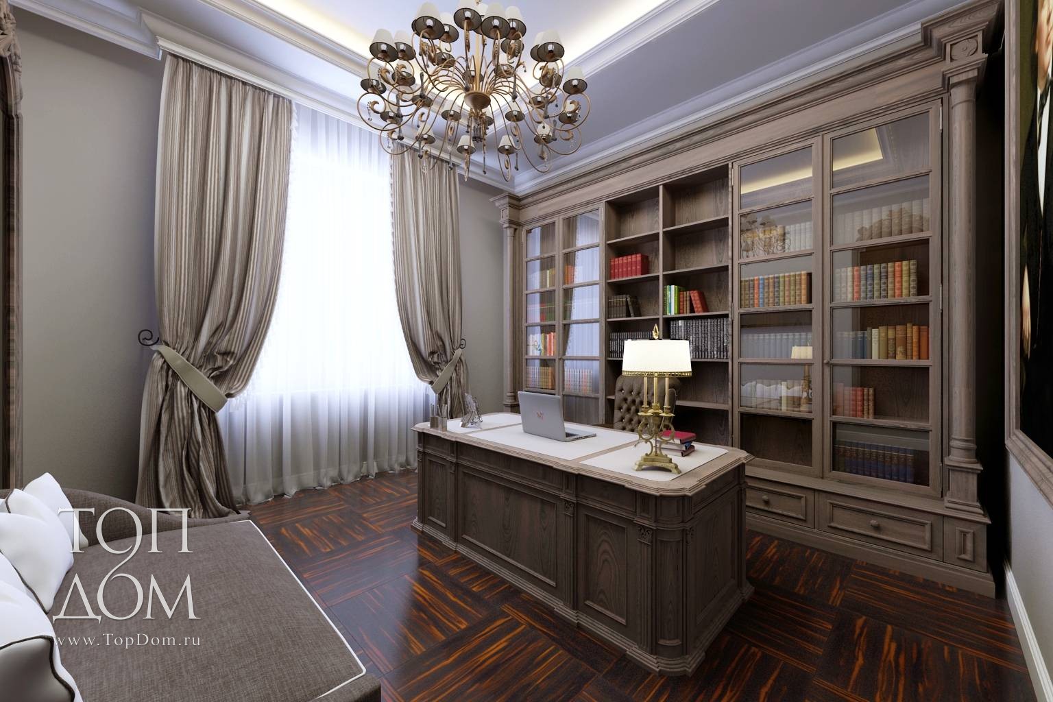 Прямоугольная планировка комнаты позволила одну из стен полностью закрыть классической консолью с книжными шкафами из тонированного темно-серого дерева. Тон посветлее выбран для монолитного рабочего стола, украшенного миниатюрными пилястрами. В серой гамме выдержаны диван и резные рамы зеркал, шторы в вертикальную полоску.