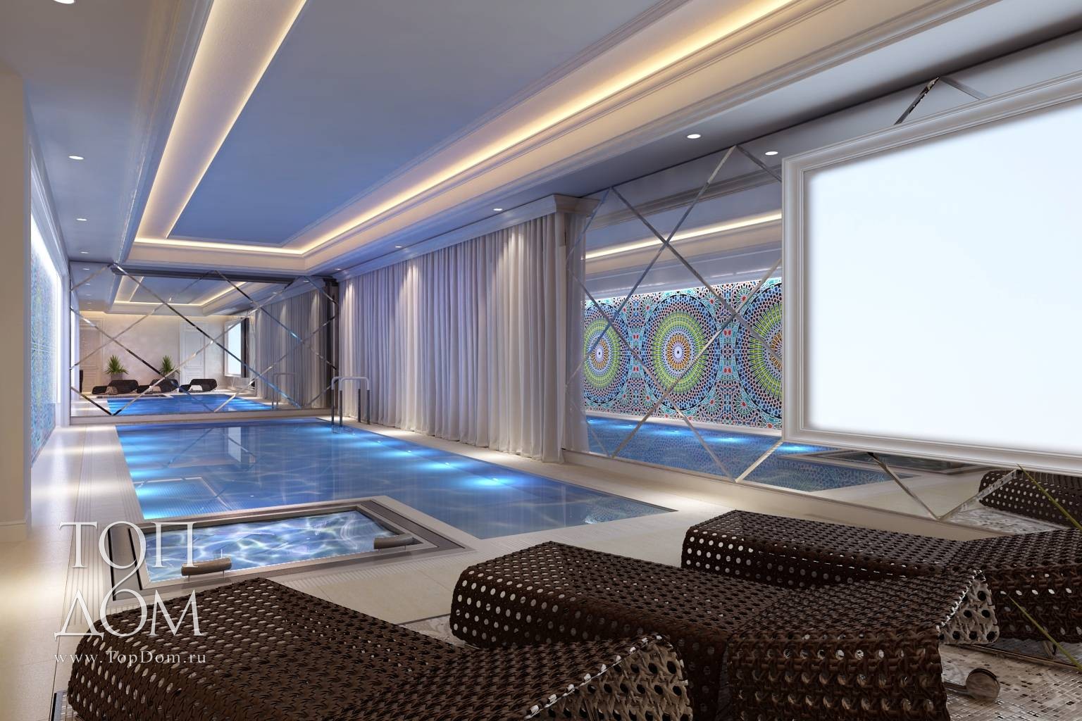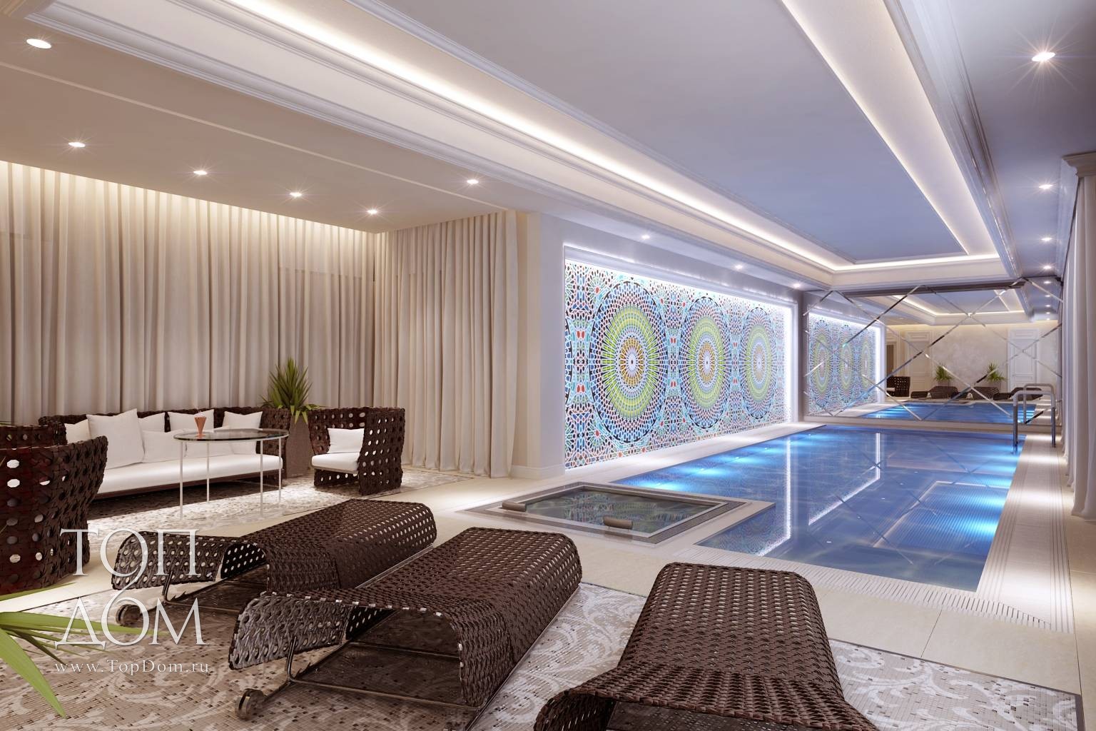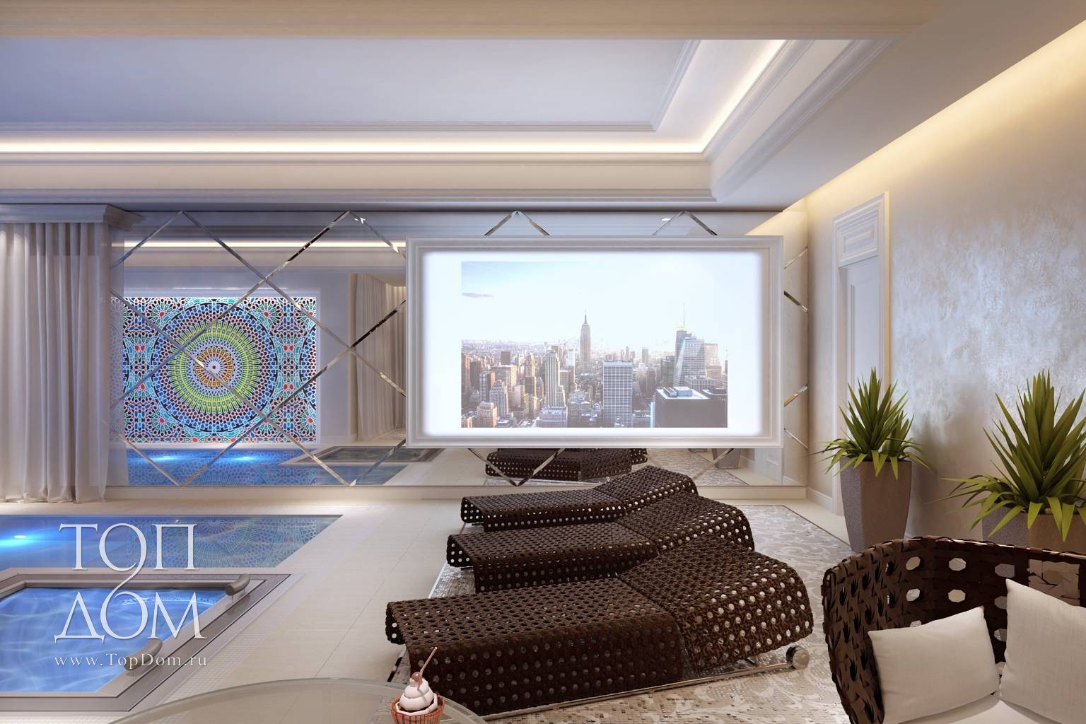 Нейтральный бежевый фон использован и здесь. Красивым контрастом смотрится темно-коричневая плетеная мебель. Одна из стен выложена пестрым мозаичным орнаментом, закарнизная подсветка делает полотно еще ярче. Облицовка стен огромными зеркальными полотнами с фацетом привносит в интерьер блеск и создает расширяющий эффект.