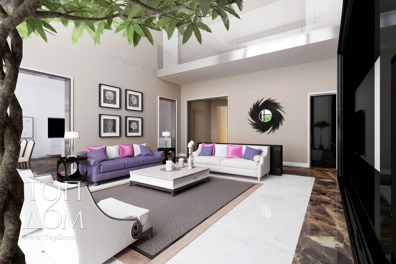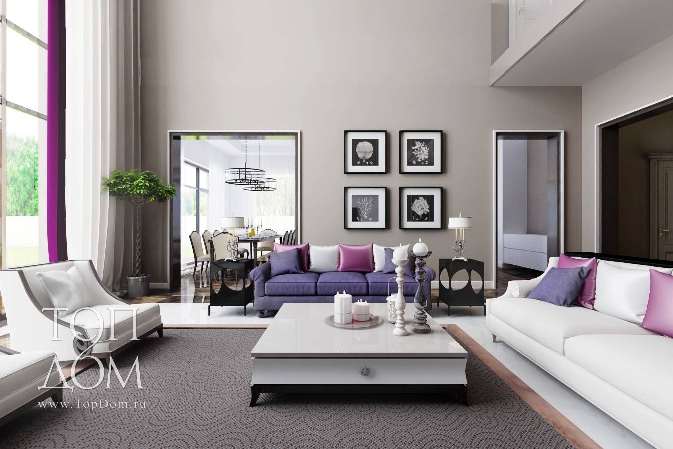 Основу группы составляют серо-голубой и белый диваны на фигурных ножках, их однотонность успешно компенсируется множеством подушек белого, голубого, фиалкового оттенка. Спиной к окну развернуты два белых кресла с низким сиденьем и деревянными деталями, окрашенными в серый цвет. В такой же манере выполнен низкий кофейный столик с квадратной лакированной столешницей. Акцентирует внимание на сером цвете узорчатый ковер. Бледным бежевым оттенком окрашены стены, они задают умиротворяющий нейтральный фон.