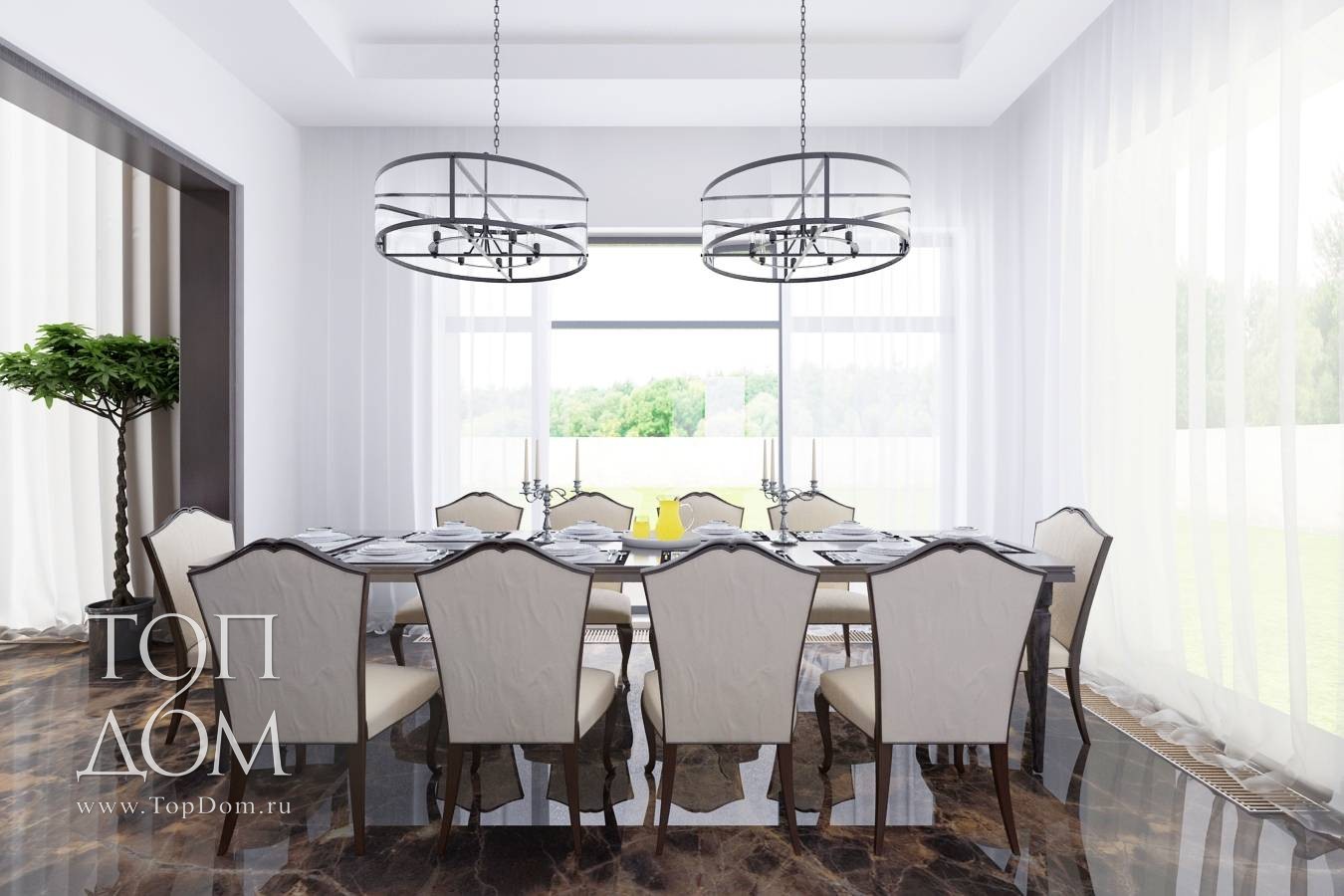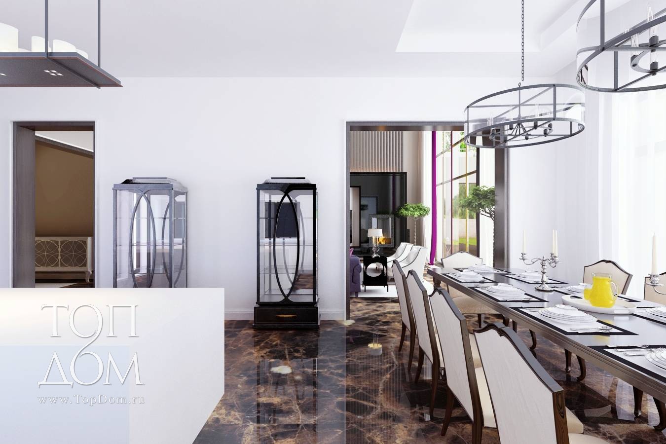 Стилистическая цельность интерьера воплощается в единстве напольного покрытия гостиной и столовой. Мраморная текстура плитки – колористическая база для белых гладких стен и потолка, обивки стульев. Торжественность обстановки поддерживают белоснежные воздушные шторы. Две подвесные люстры с лампами-свечами, заключенные в округлые прозрачные плафоны, дополняются витринами.