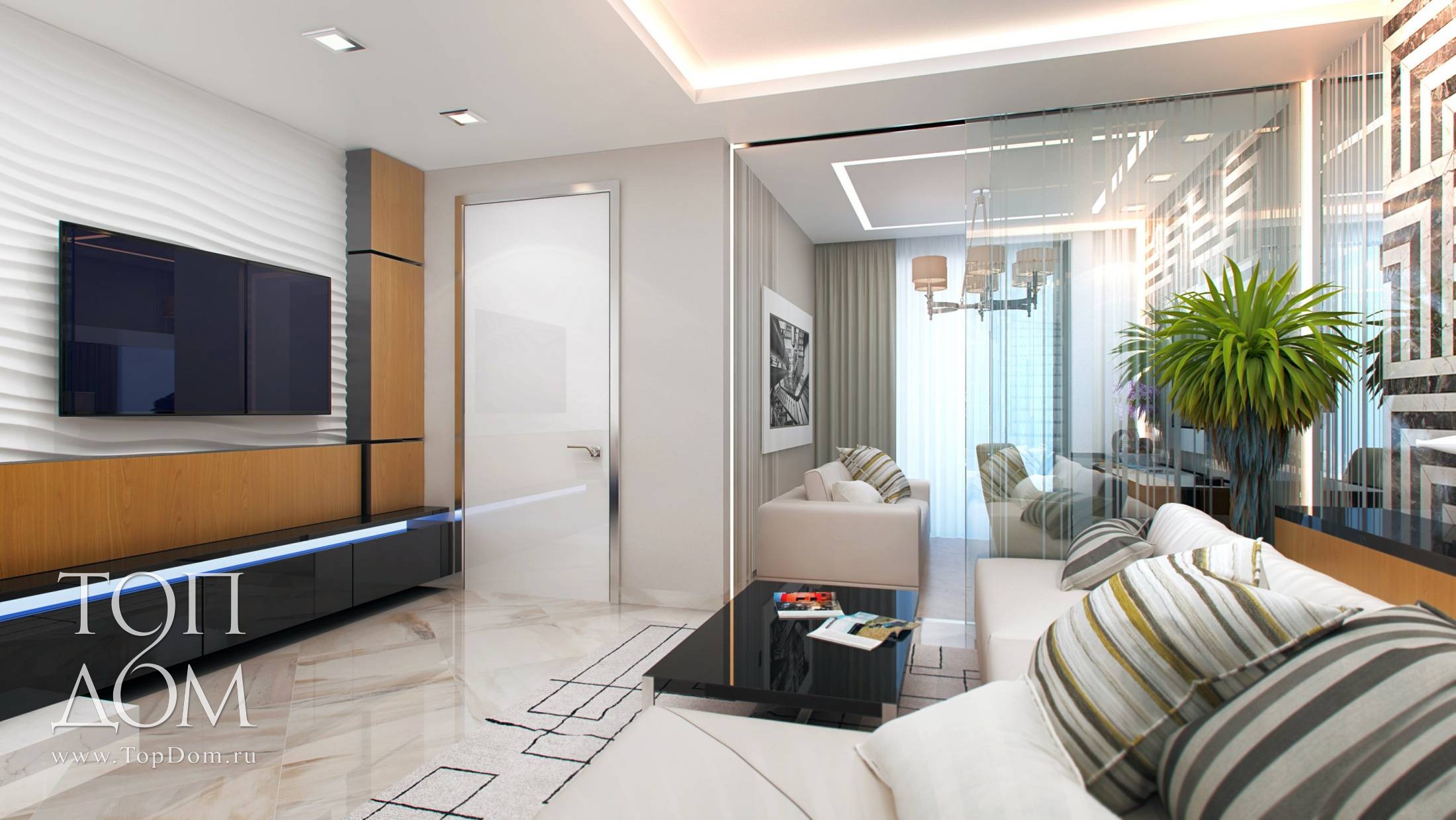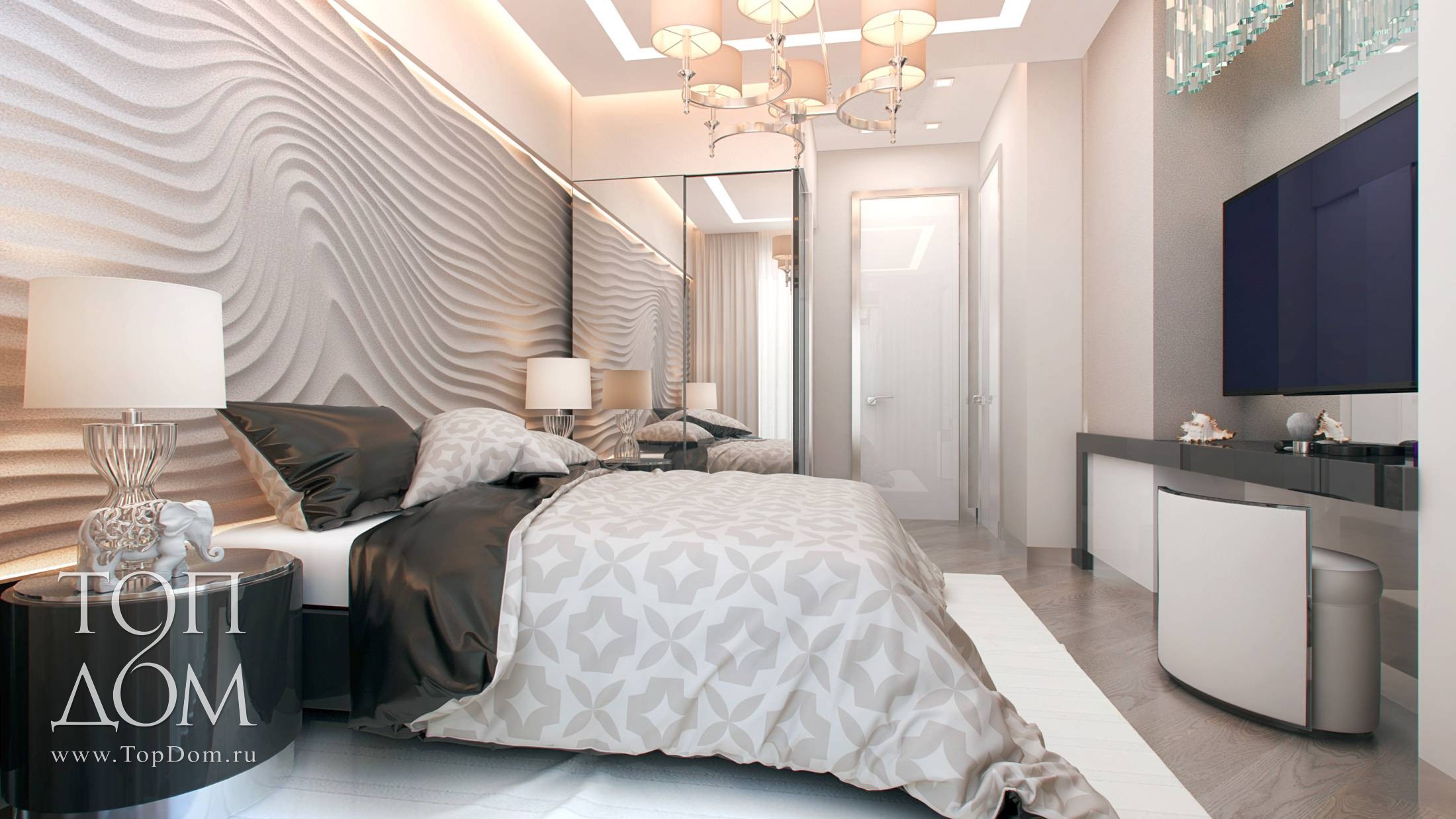 Повторение декораторских приемов присутствует и в дизайне второй спальни: стена за изголовьем отделана объемной росписью волнами, как в гостиной, зона ТВ выделена подвеской из прозрачных пластин. Интерьер спальни выдержан в светлой серо-белой гамме. Встроенный платяной шкаф полностью зеркальный, благодаря чему он служит зеркалом как со стороны спального места, так и на выходе из комнаты.