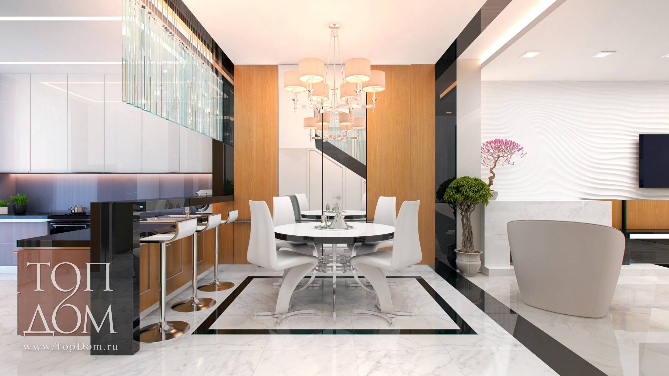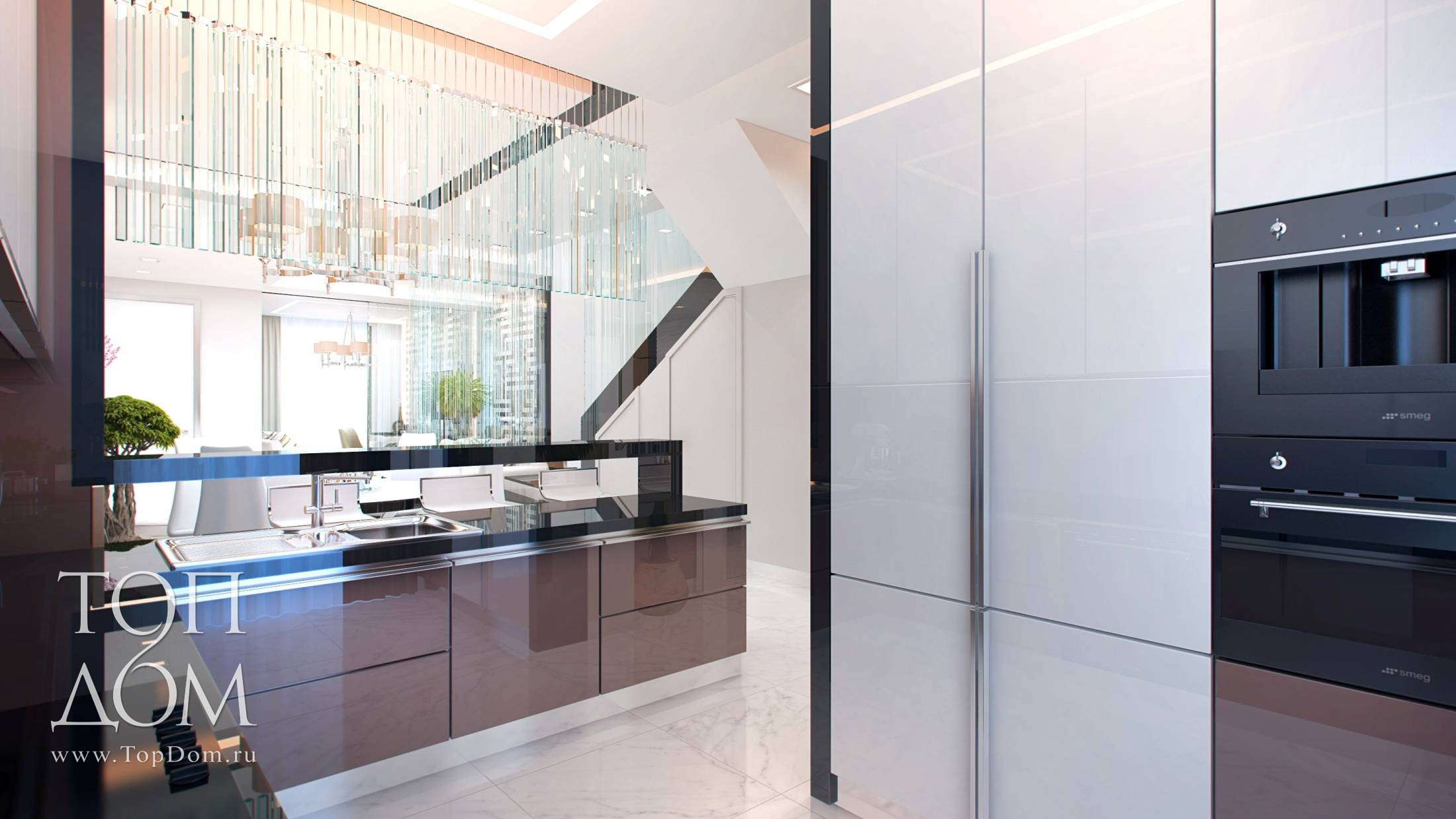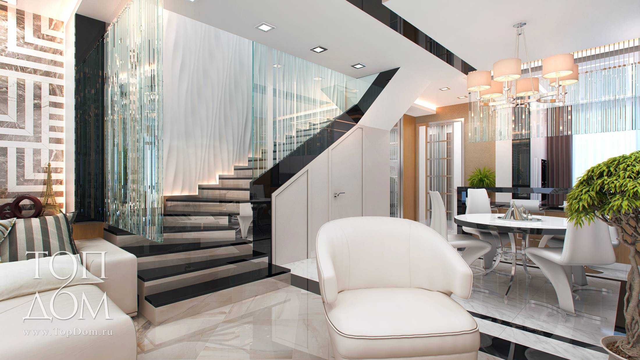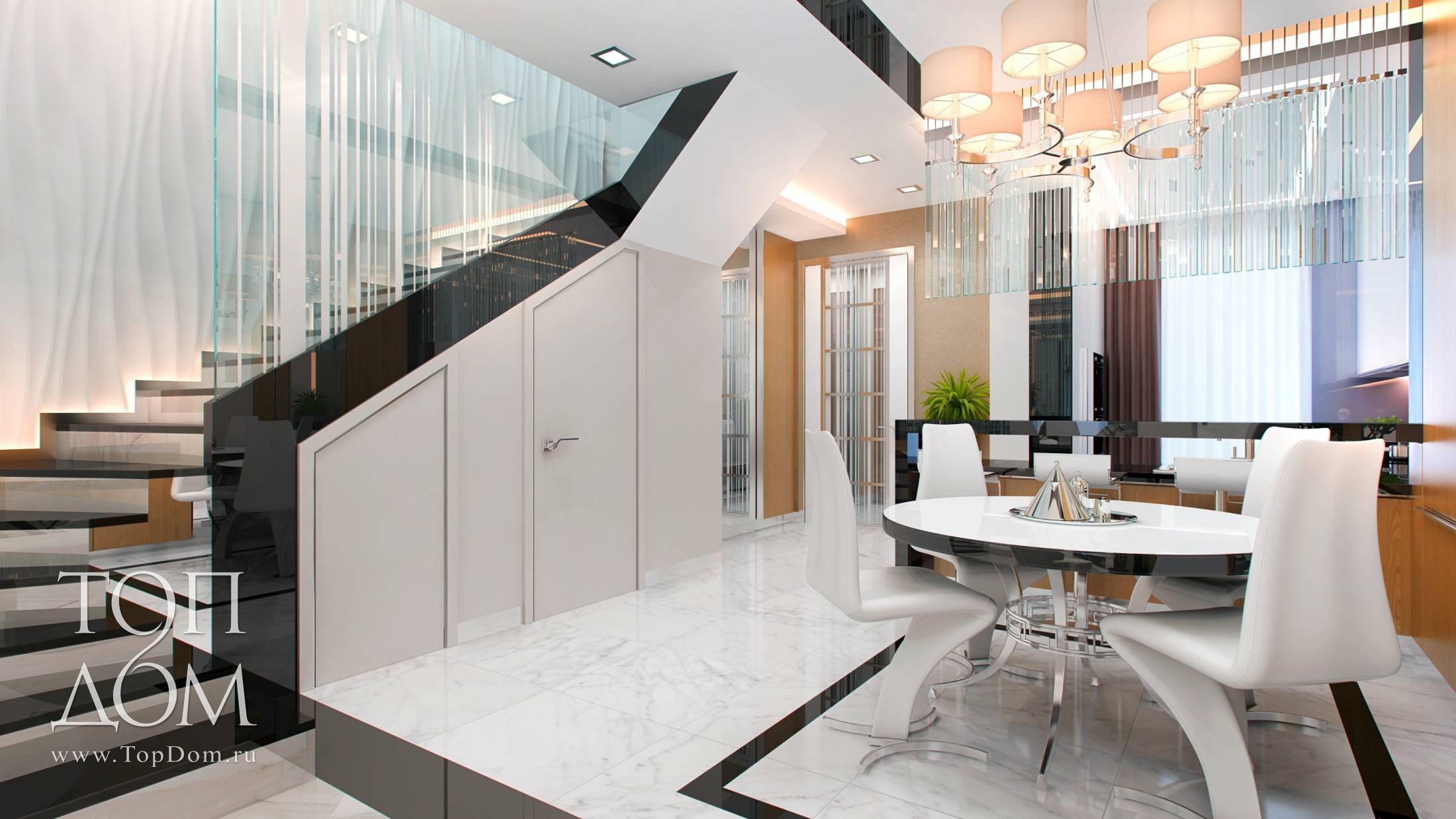 Дизайн-проект интерьера дома строится на сочетании белых и черных лакированных поверхностей с прозрачными перегородками и зеркальными вставками, за счет чего создается ощущение открытого светлого пространства.