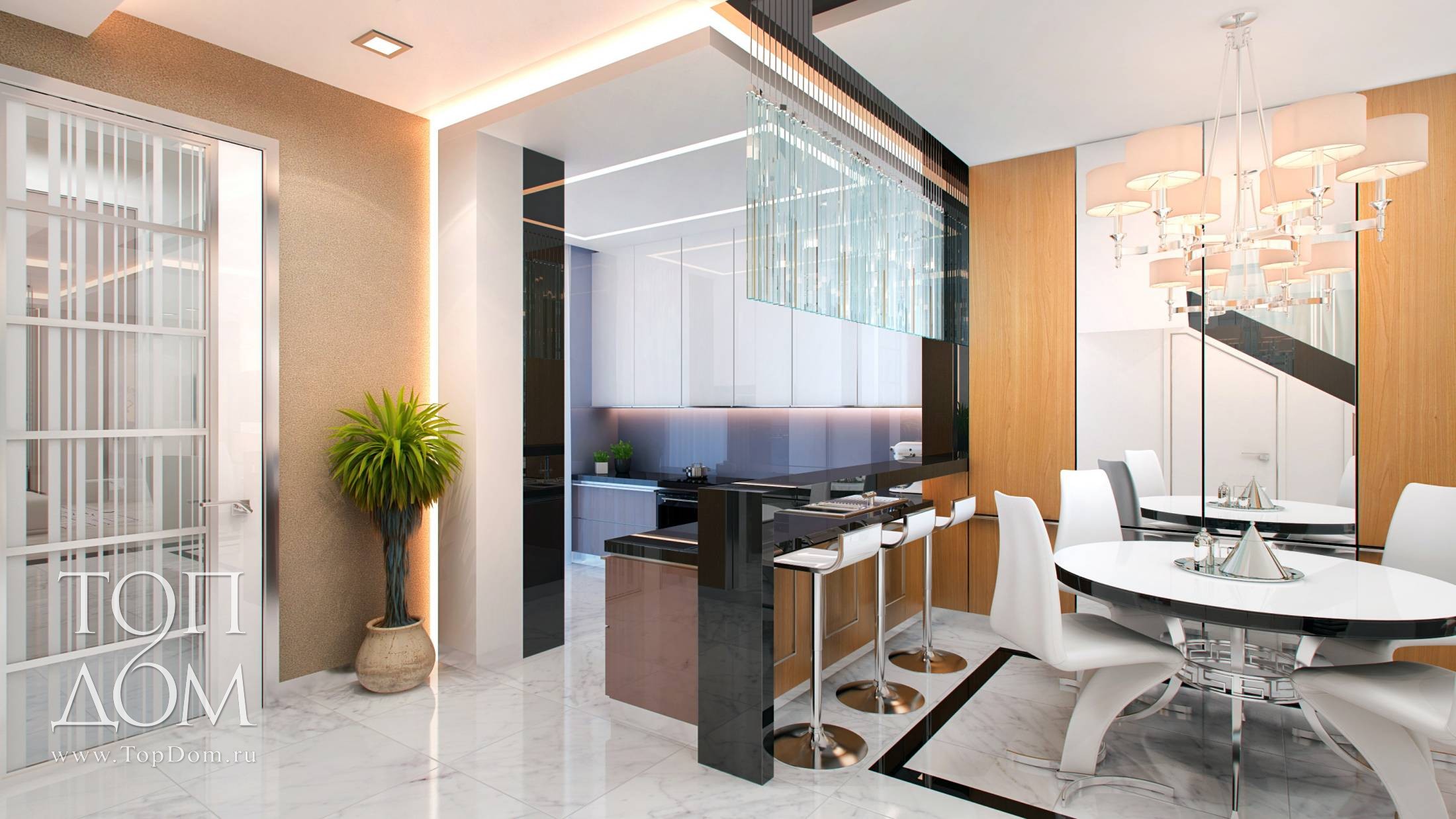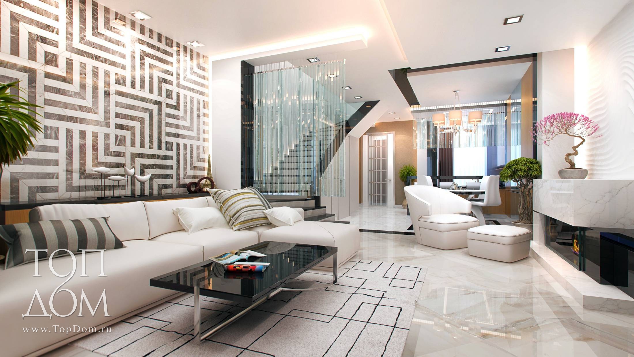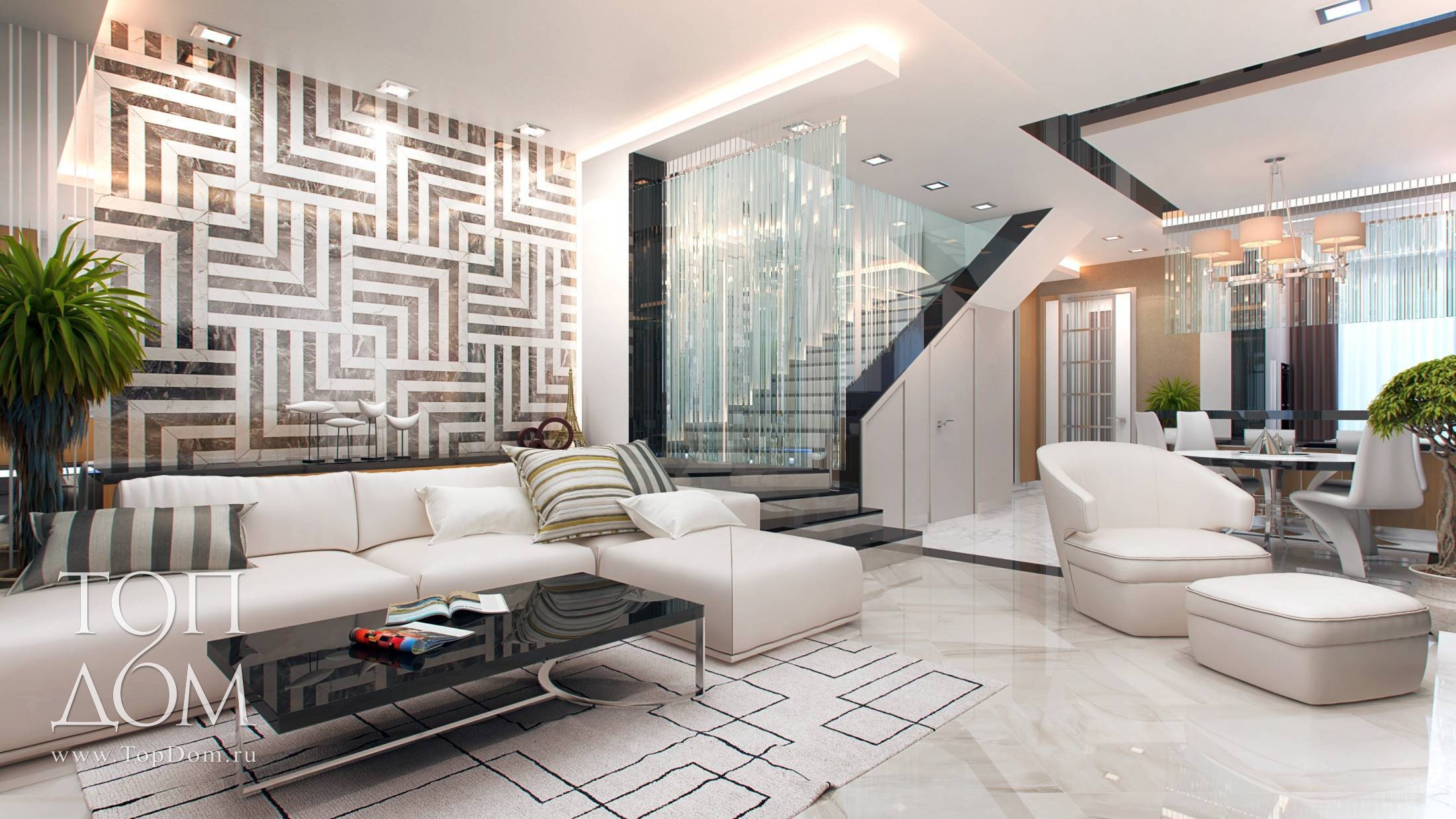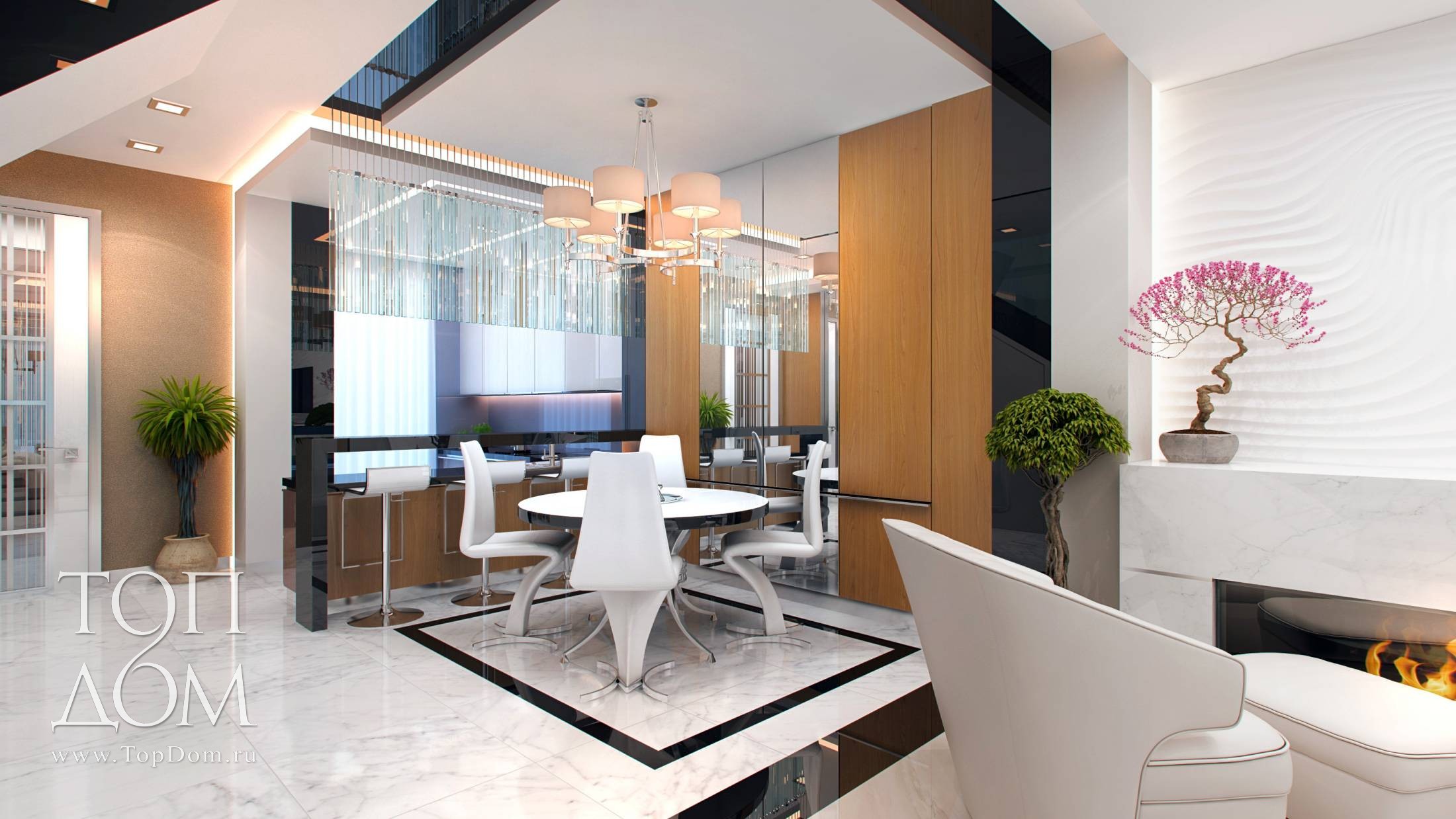 Дизайн-проект интерьера дома строится на сочетании белых и черных лакированных поверхностей с прозрачными перегородками и зеркальными вставками, за счет чего создается ощущение открытого светлого пространства.