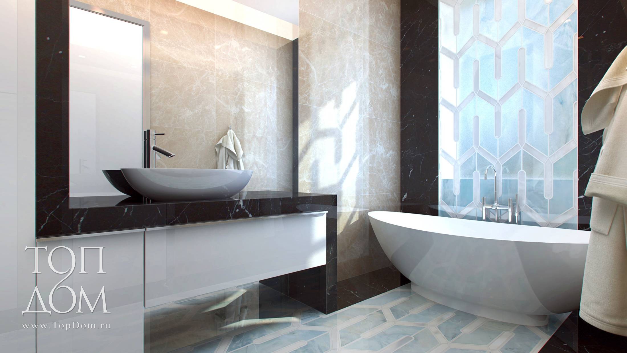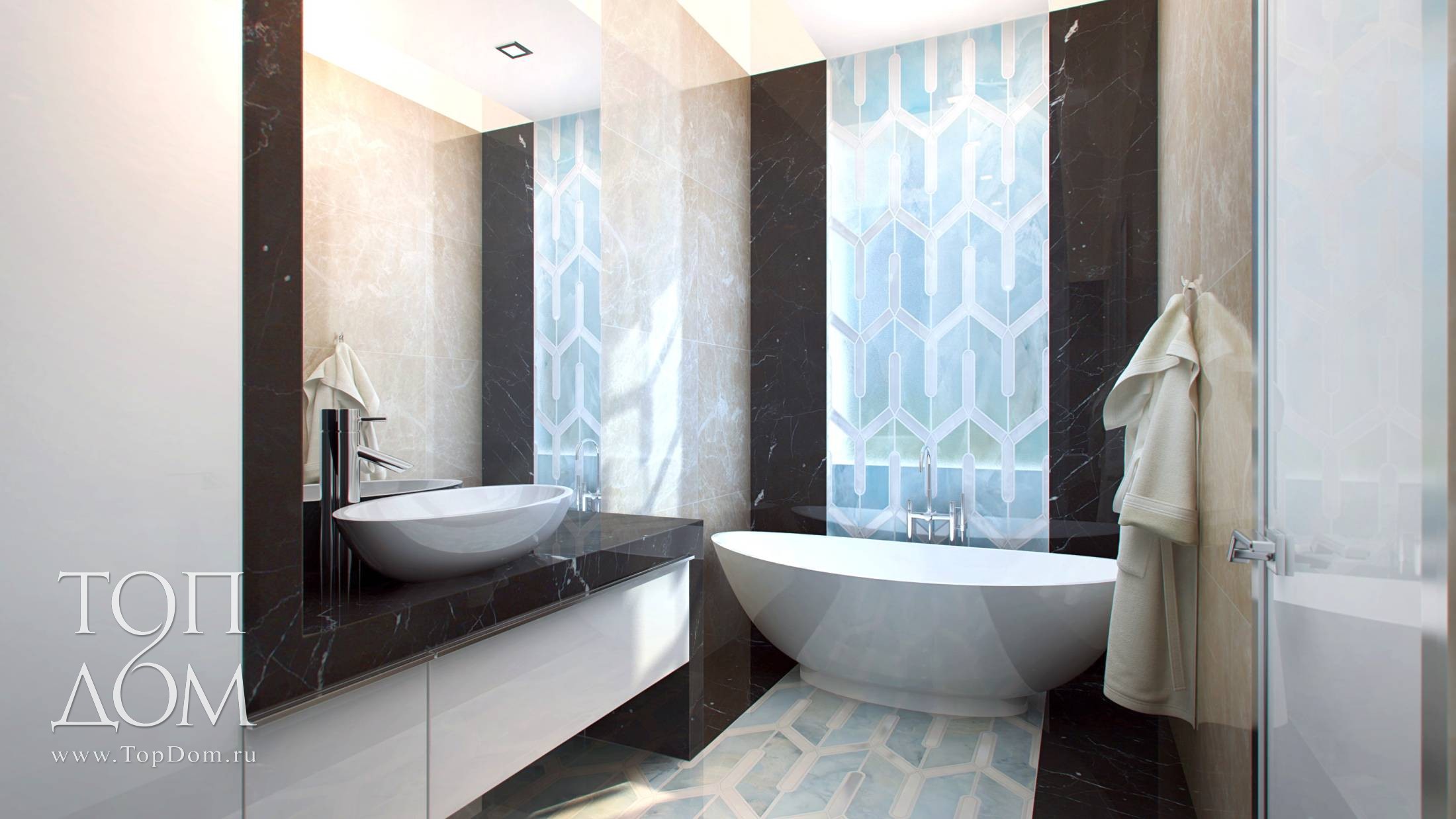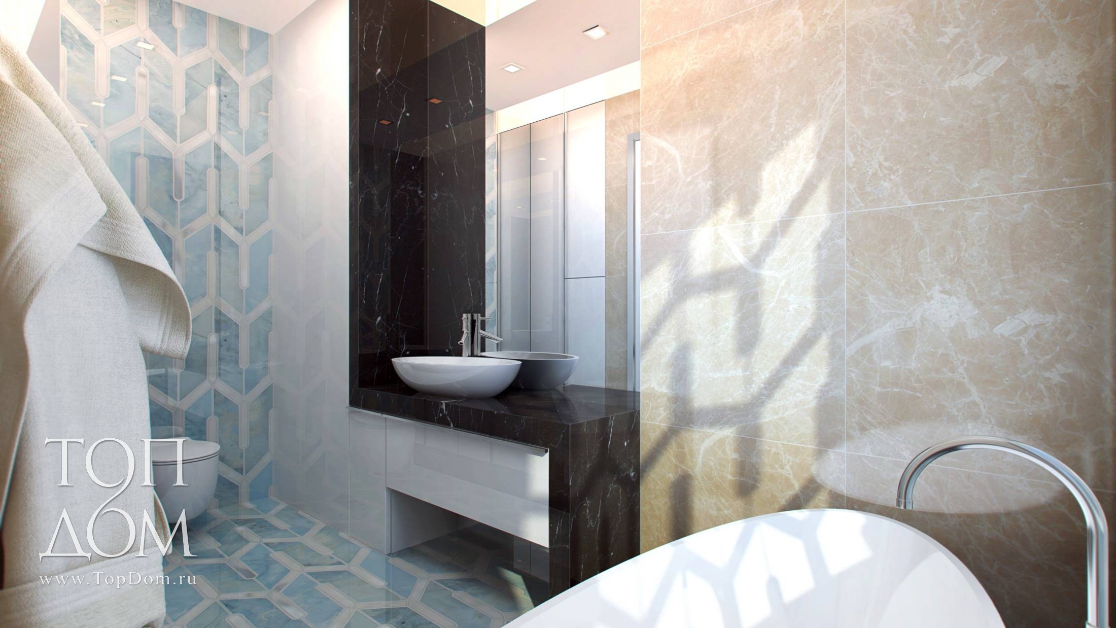 Широкая полоса из бежево-голубой плитки с крупным геометрическим орнаментом, которой облицованы стены и пол, зонирует помещение. Со стороны оконного проема использованы полупрозрачные фрагменты, поэтому в комнату проникает рассеянный солнечный свет. Светлую гамму поддерживают бежевые стены и белые фасады консоли под раковиной. Мощный контрастный акцент – черная мраморная столешница.