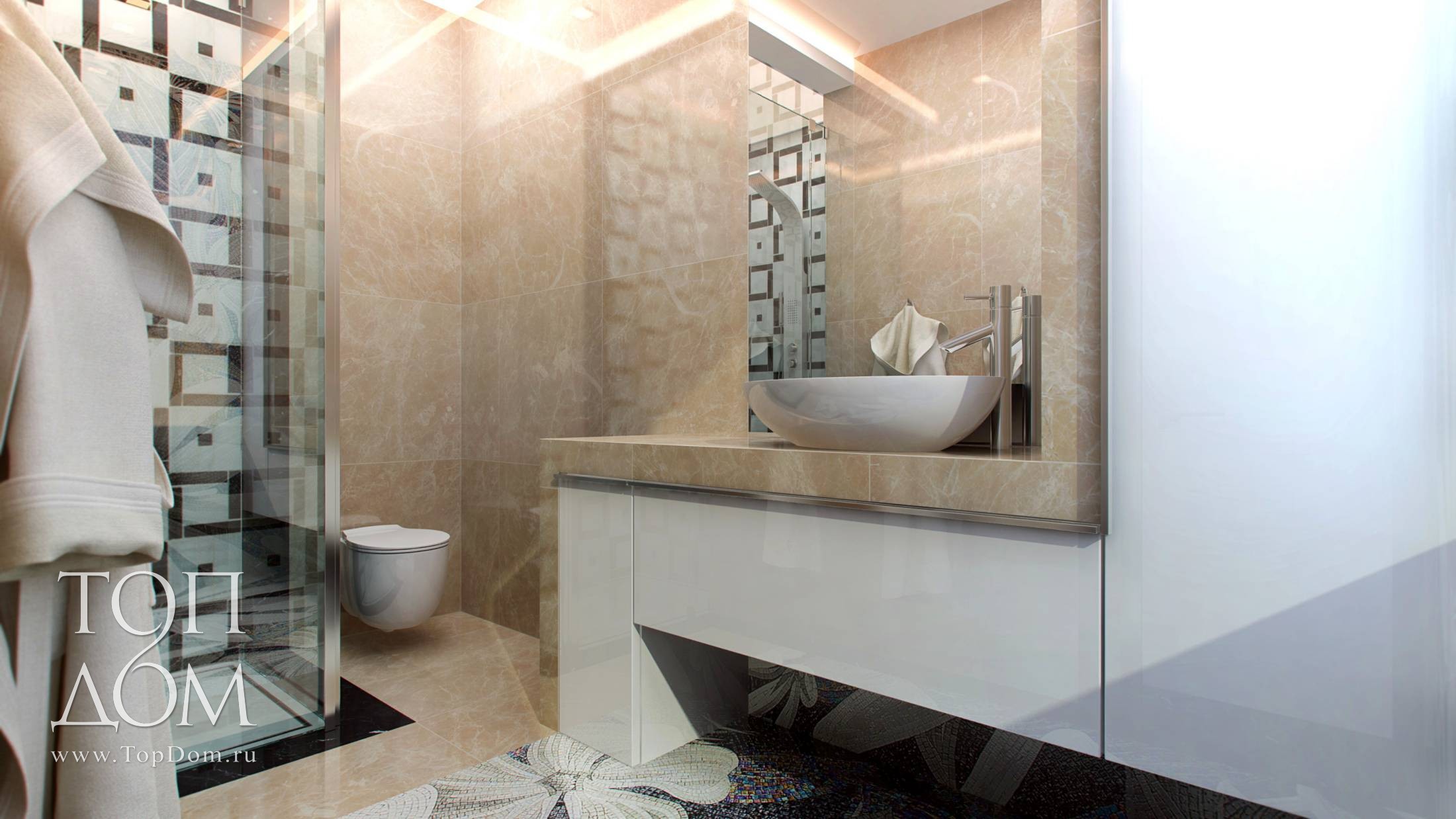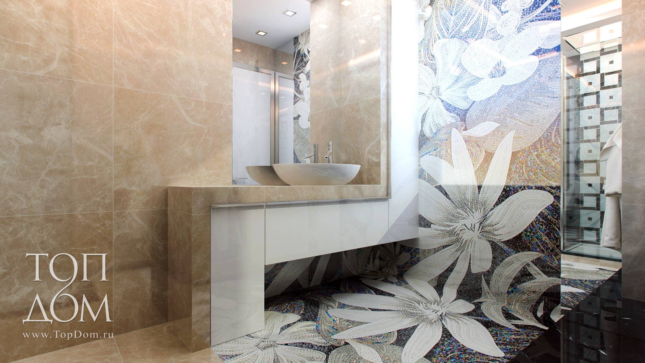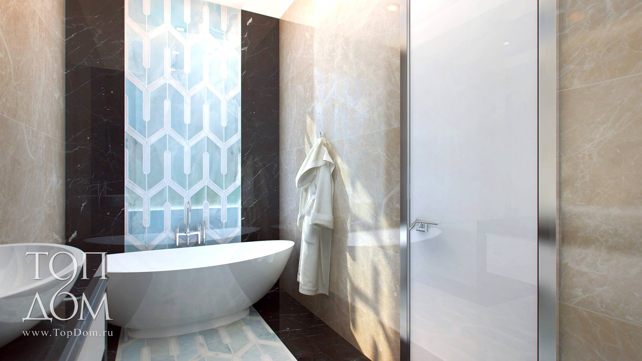 Широкая полоса из бежево-голубой плитки с крупным геометрическим орнаментом, которой облицованы стены и пол, зонирует помещение. Со стороны оконного проема использованы полупрозрачные фрагменты, поэтому в комнату проникает рассеянный солнечный свет. Светлую гамму поддерживают бежевые стены и белые фасады консоли под раковиной. Мощный контрастный акцент – черная мраморная столешница.