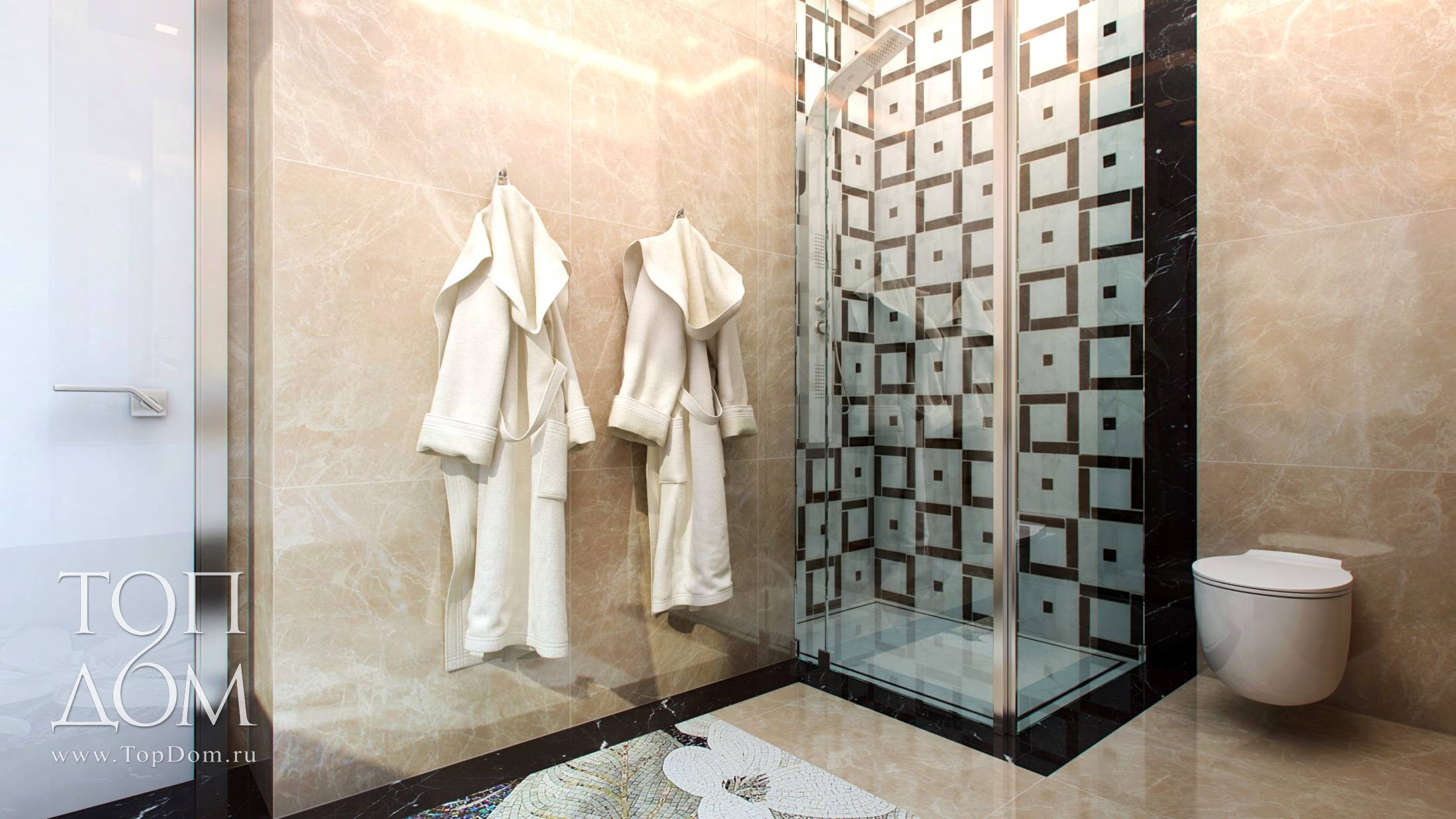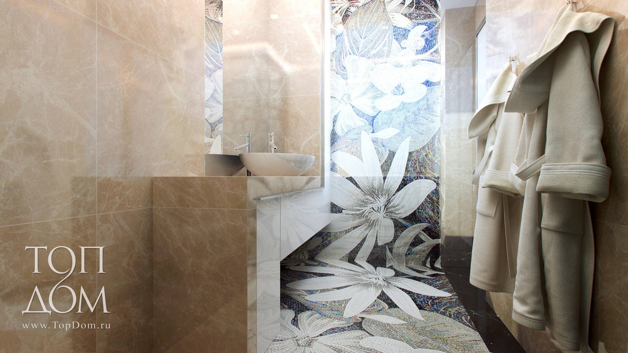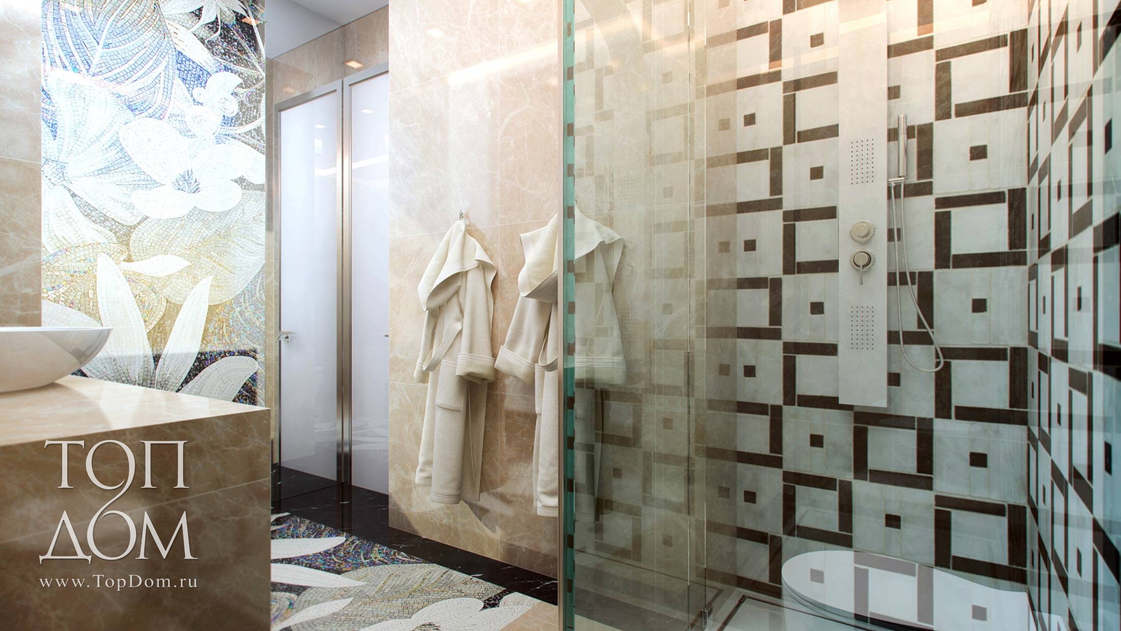 Фоном здесь служит бежевая плитка на стенах и полу, она задает спокойную расслабляющую атмосферу. Активную цветовую комбинацию в интерьер туалета вводит мозаика с растительным рисунком, а также плитка с контрастным геометрическим узором в зоне душевой кабины.