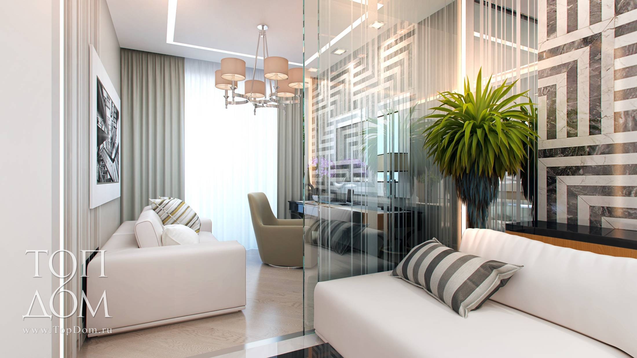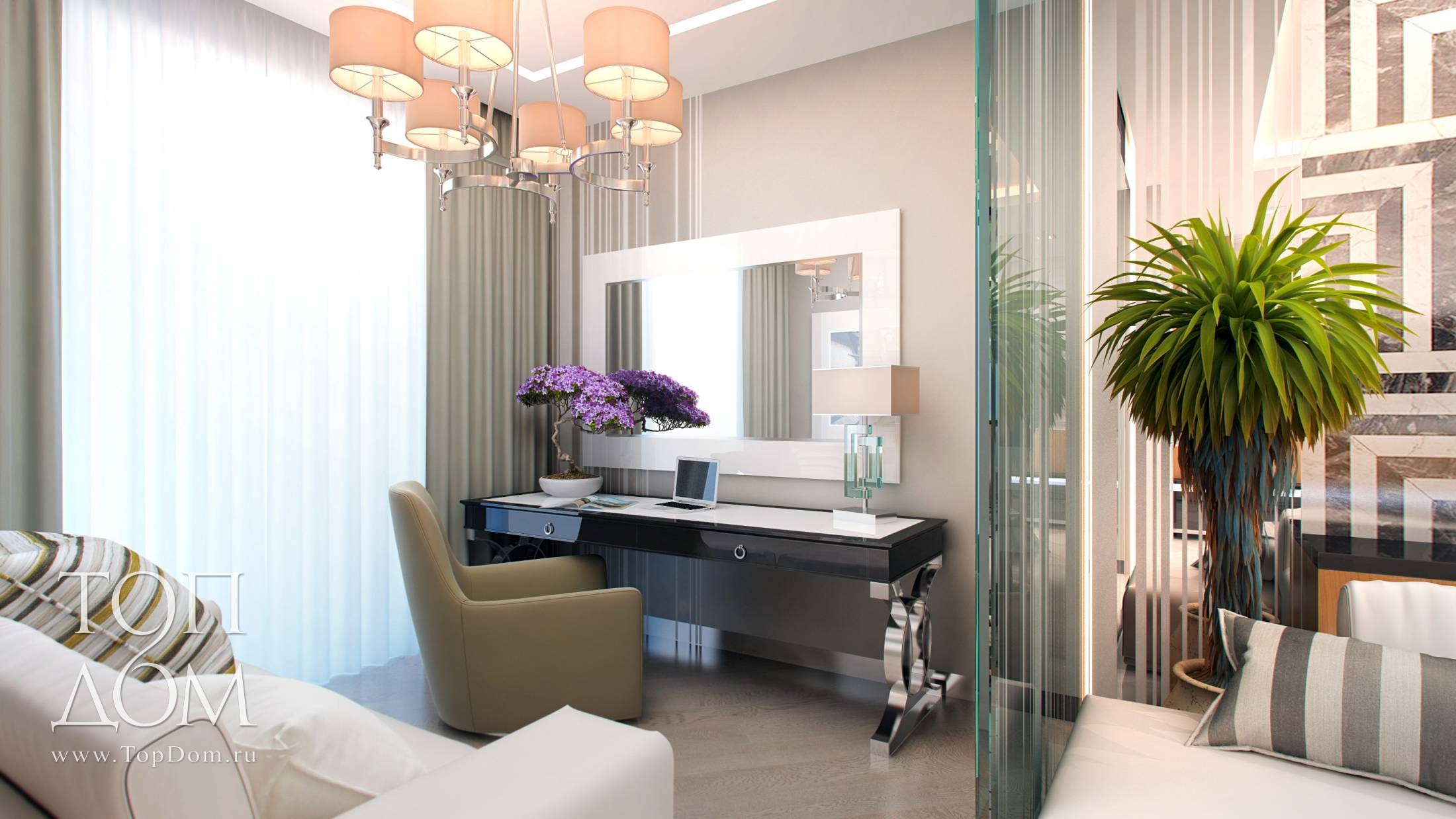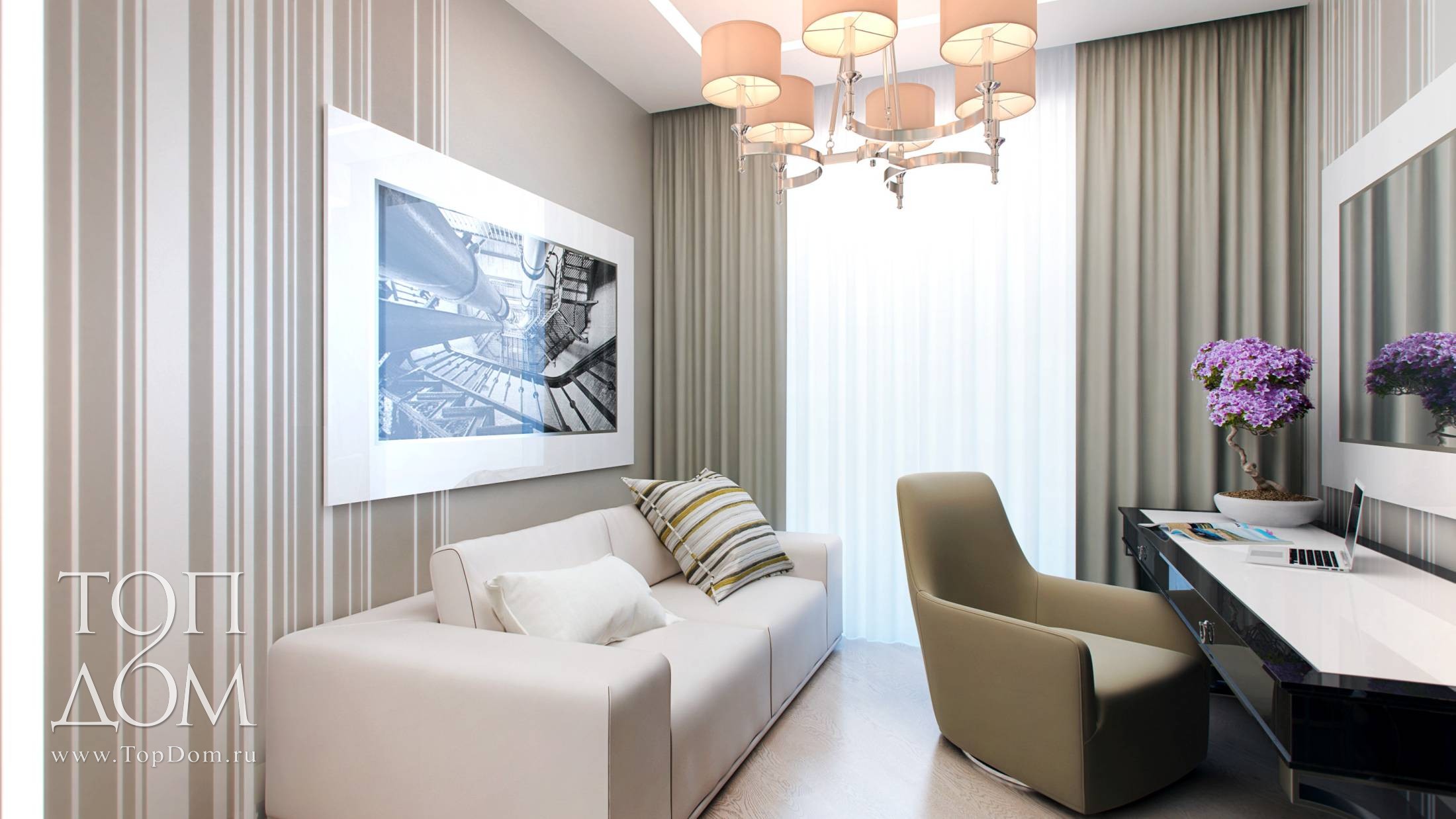 Стекло перегородки украшено пескоструйным узором в виде вертикальных полос разной ширины. Такой же ритм повторяется в обоях нейтрального серого цвета, колористически их поддерживают шторы и кресло. Рабочее место декорировано широким зеркалом в белом глянцевом паспарту, в такое же паспарту заключена черно-белая фотография над диваном. Комната получилась небольшая по площади, но благодаря грамотному зонированию здесь есть все необходимое, а цветовое оформление в спокойные серые краски настраивает на деловой лад.