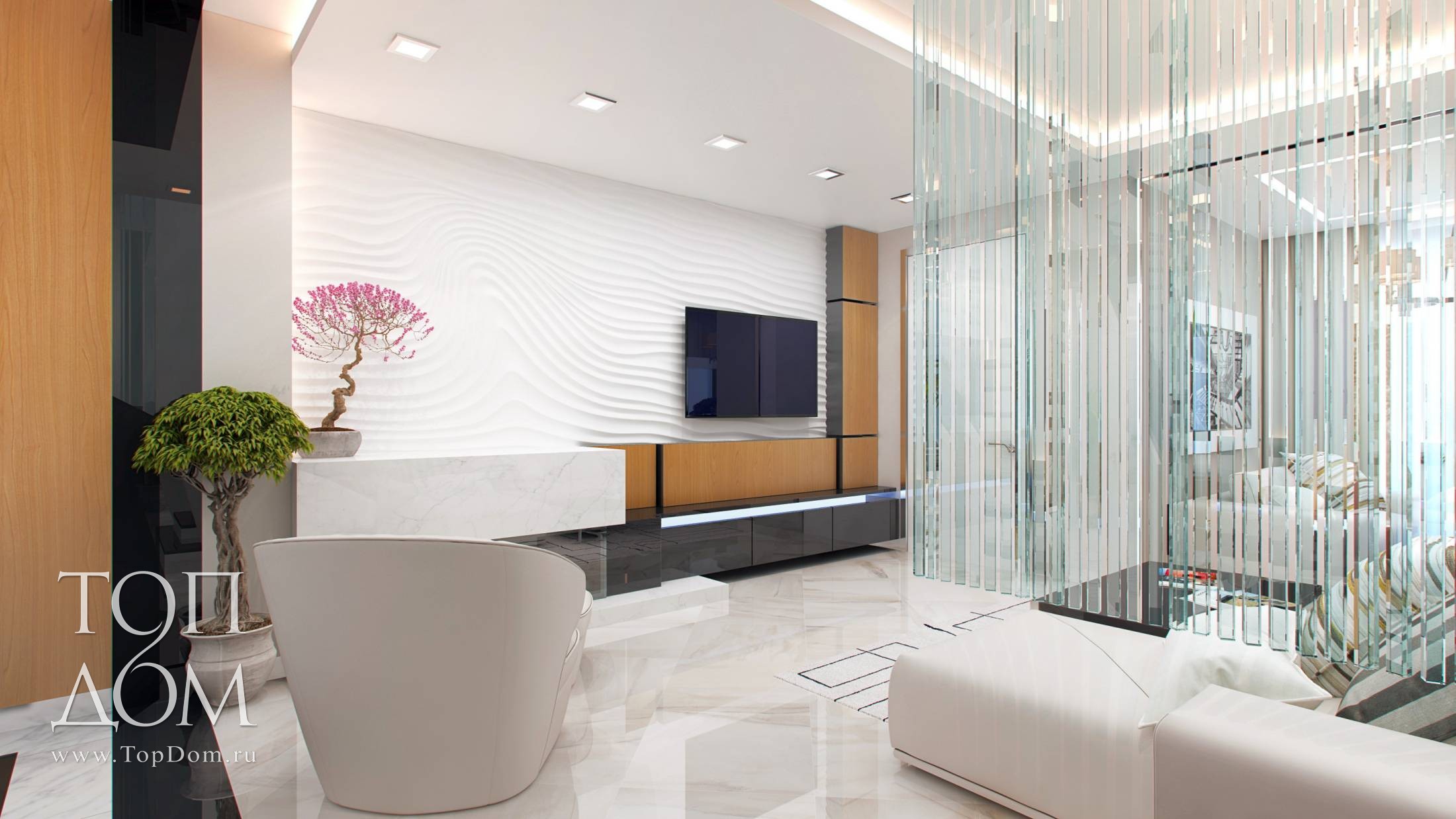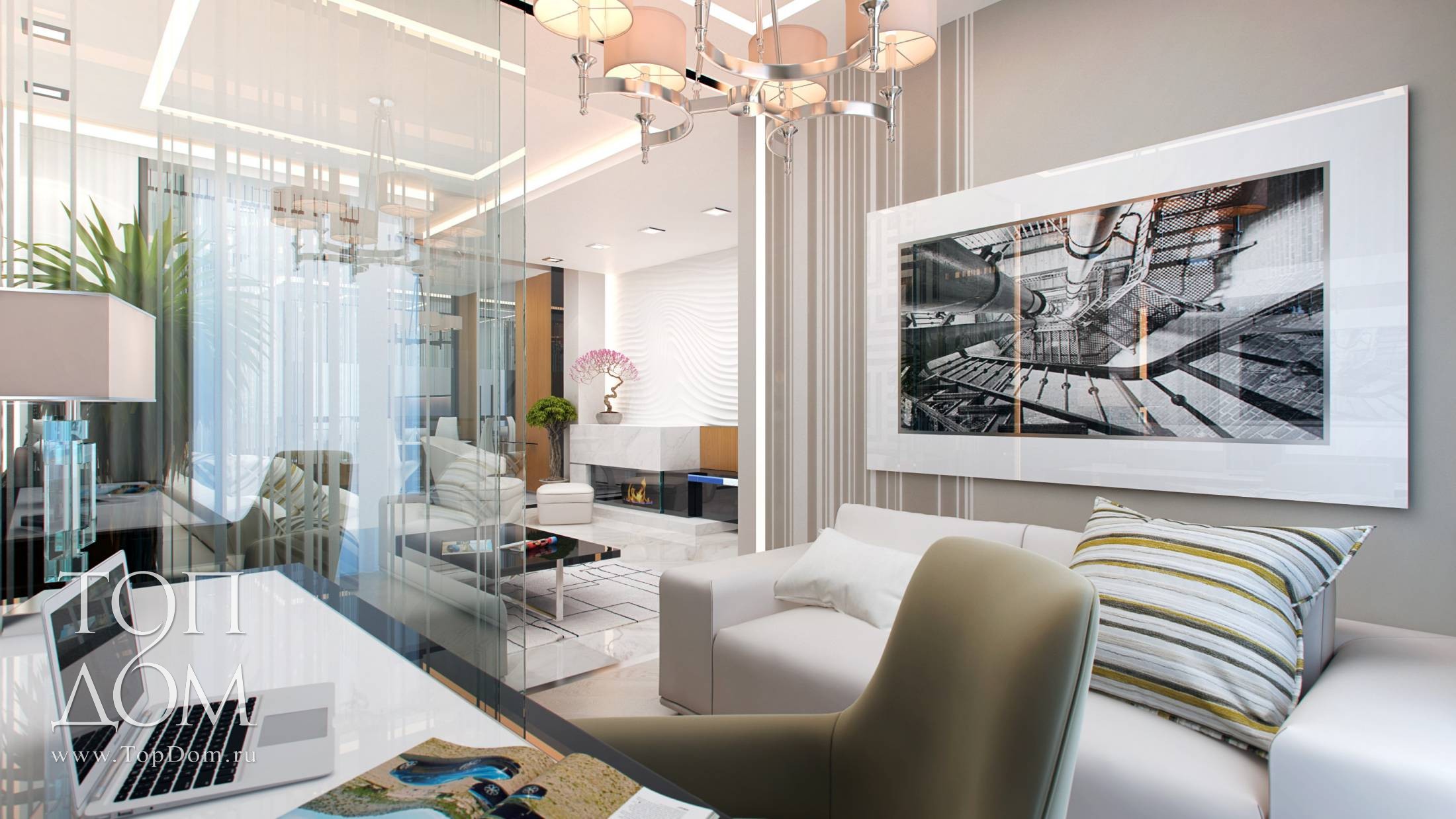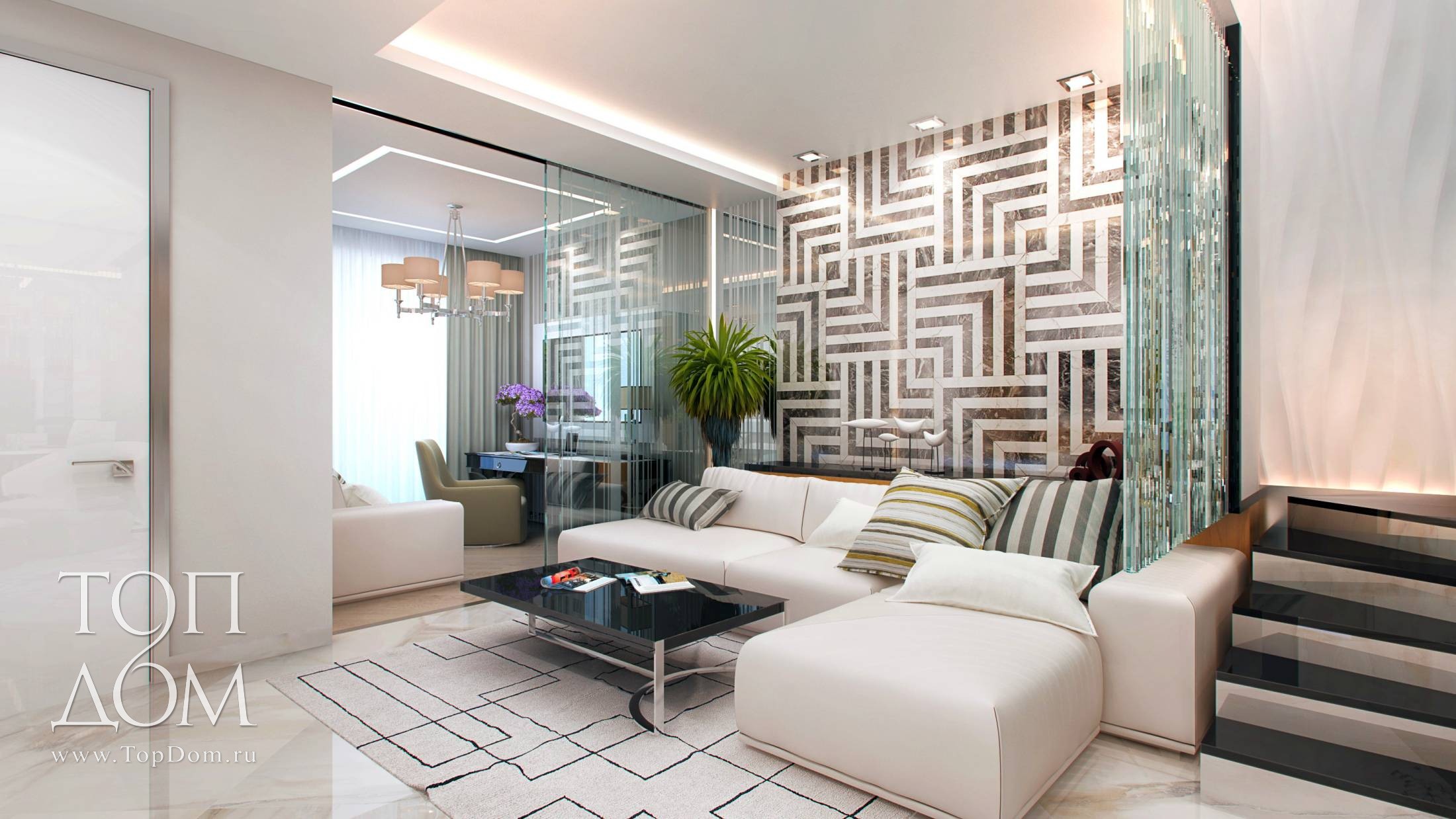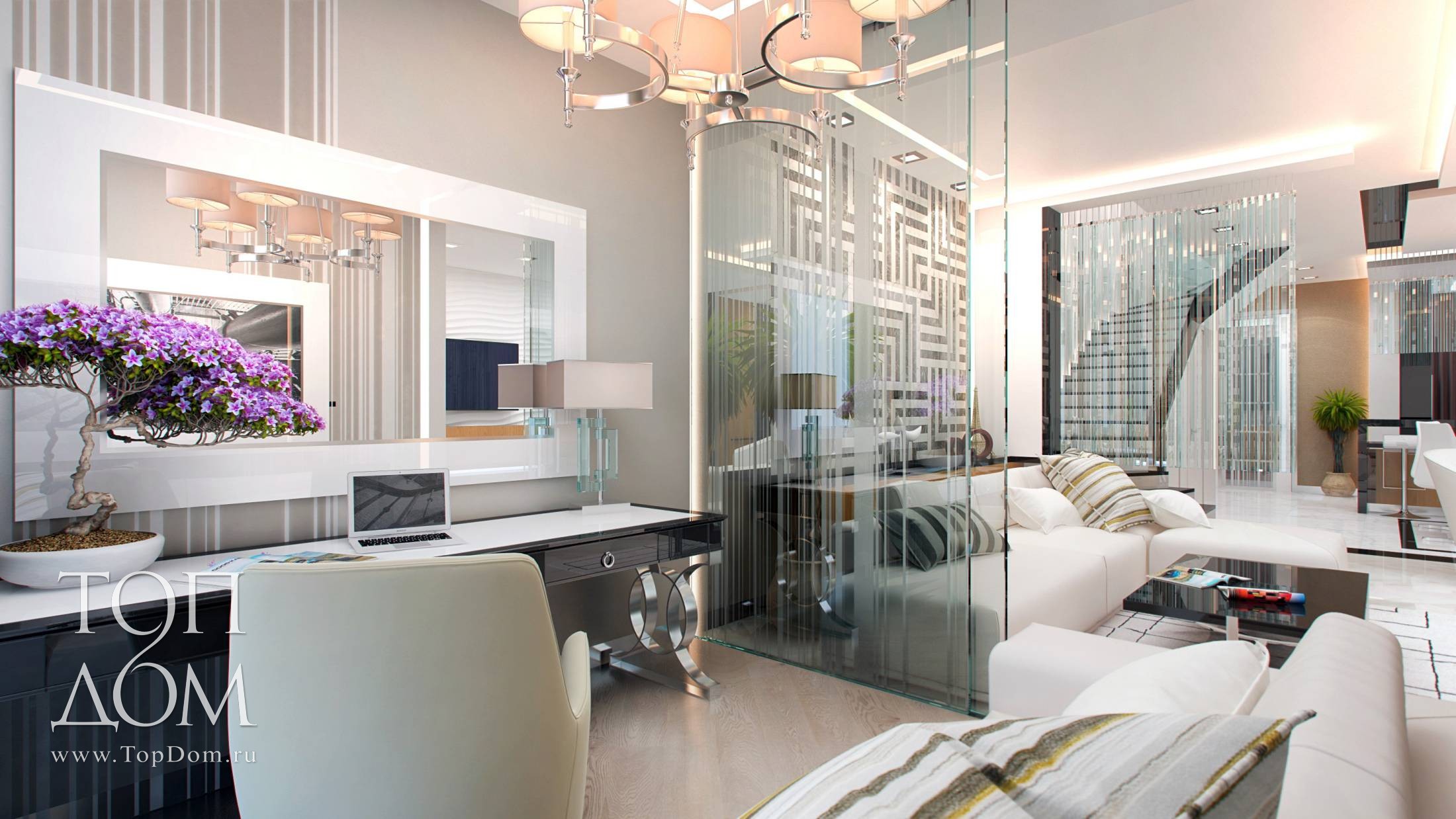 Место отдыха меблировано белым диваном. Со стороны лестницы он прикрыт подвесной декоративной перегородкой из прозрачных пластин, на ее гранях красиво играет свет от закарнизной подсветки и встроенных в потолок источников. Стена за диваном акцентирована геометрическим панно, тема которого продолжена в рисунке ковра и диванных подушек. Ближе к кабинету стена облицована зеркальным полотном, зрительно объединенным с прозрачной раздвижной перегородкой рабочей зоны.
