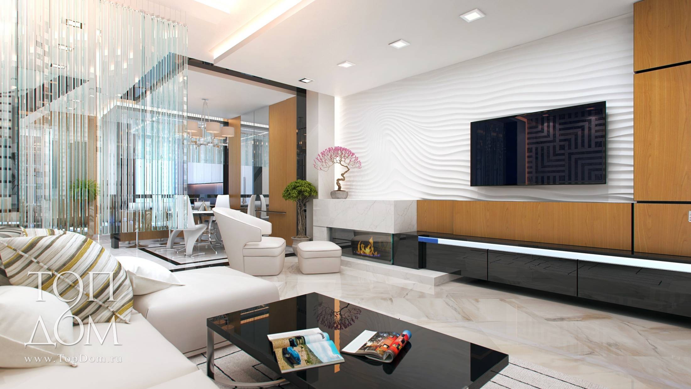 Зона ТВ оформлена объемной гипсовой росписью, изображающей волны. Такой же росписью, только с вертикально ориентированными волнами, украшена стена лестничного марша.