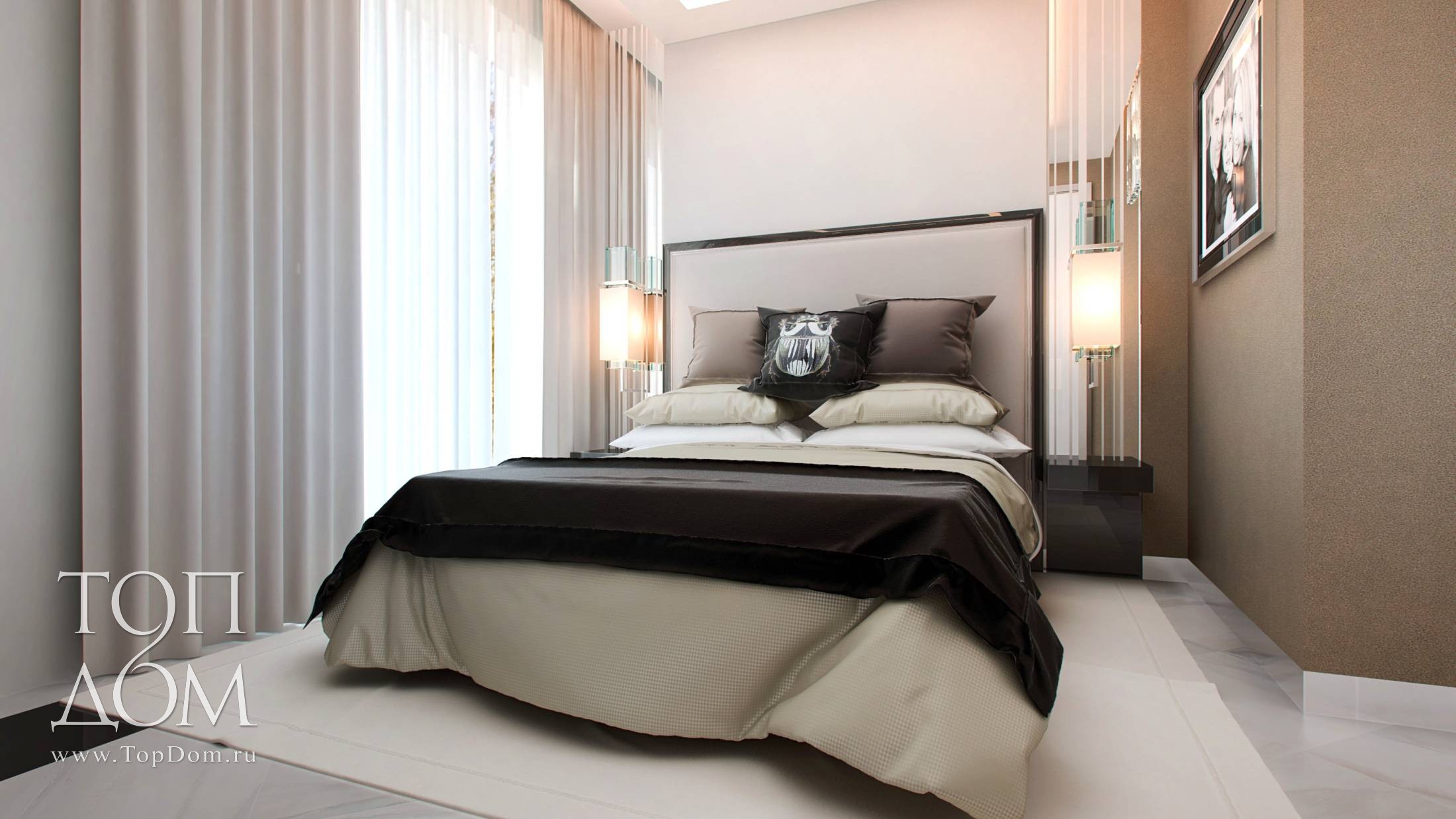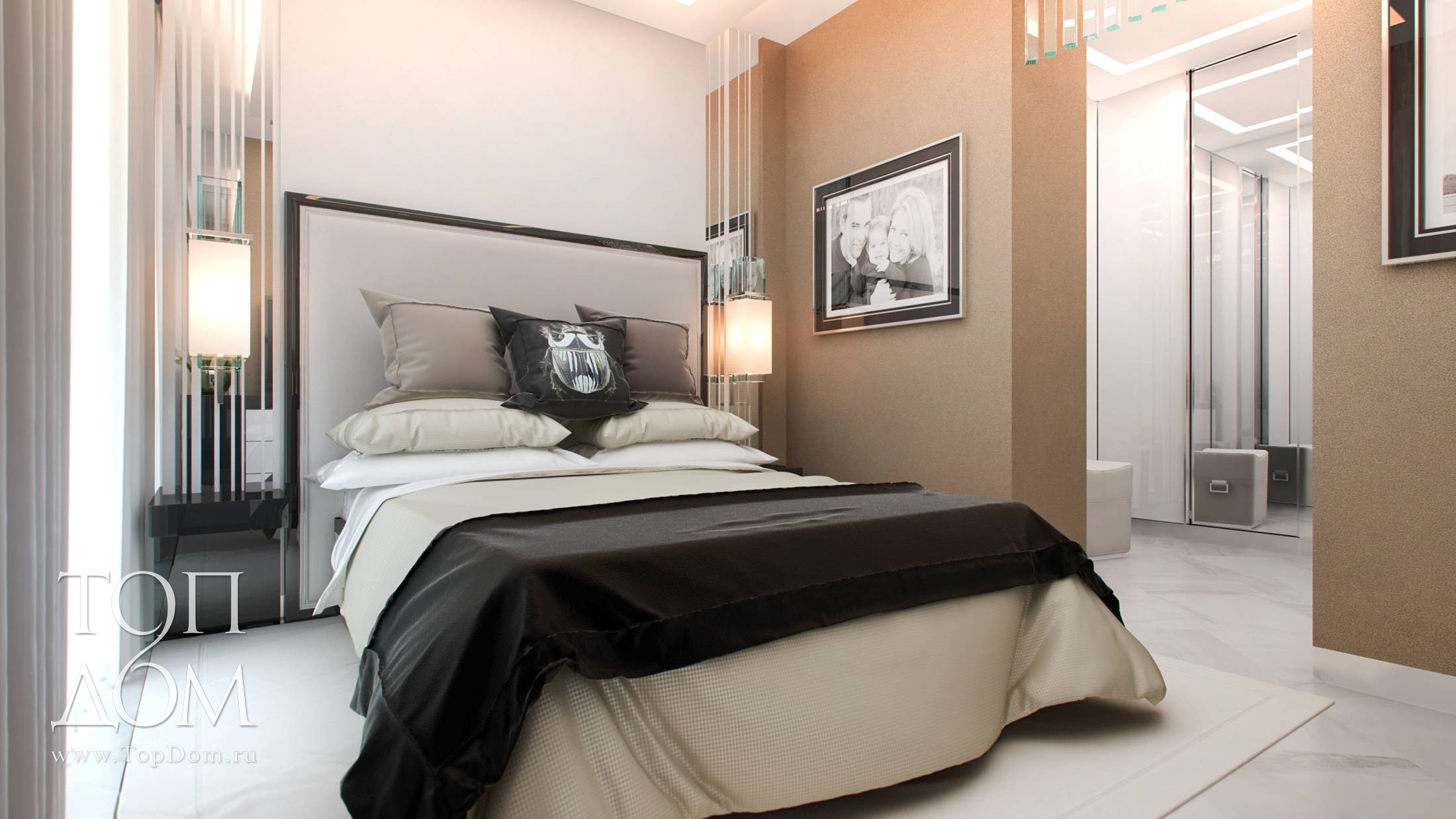 В оформлении спальни повторяются элементы из интерьера гостиной: вертикальные зеркальные полотна на стене за кроватью, молочная плитка на полу с черными полосами, декоративная штора из пластин. Спокойным коричнево-серым оттенком акцентируется внимание на стене между спальной зоной и гардеробной.