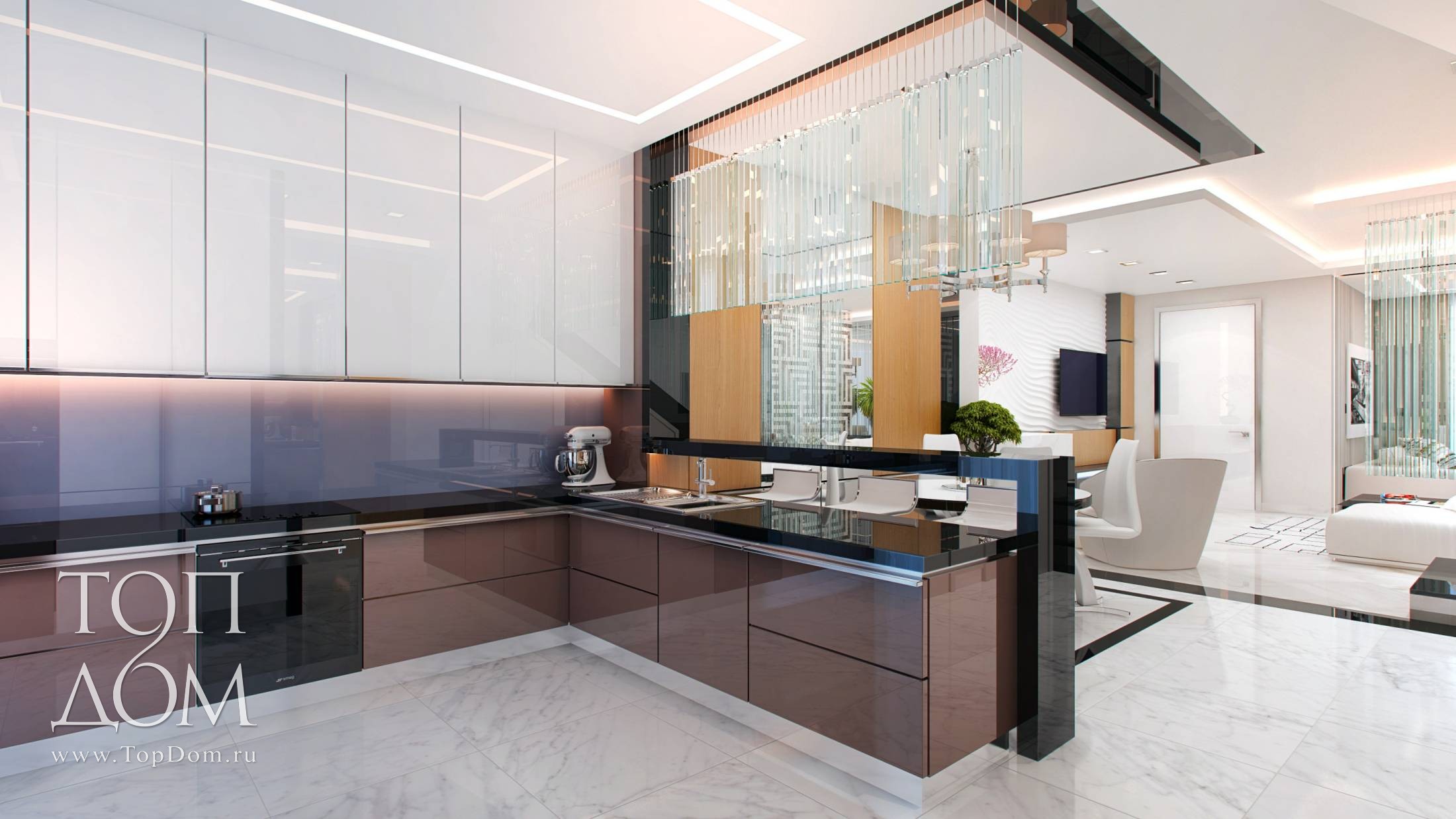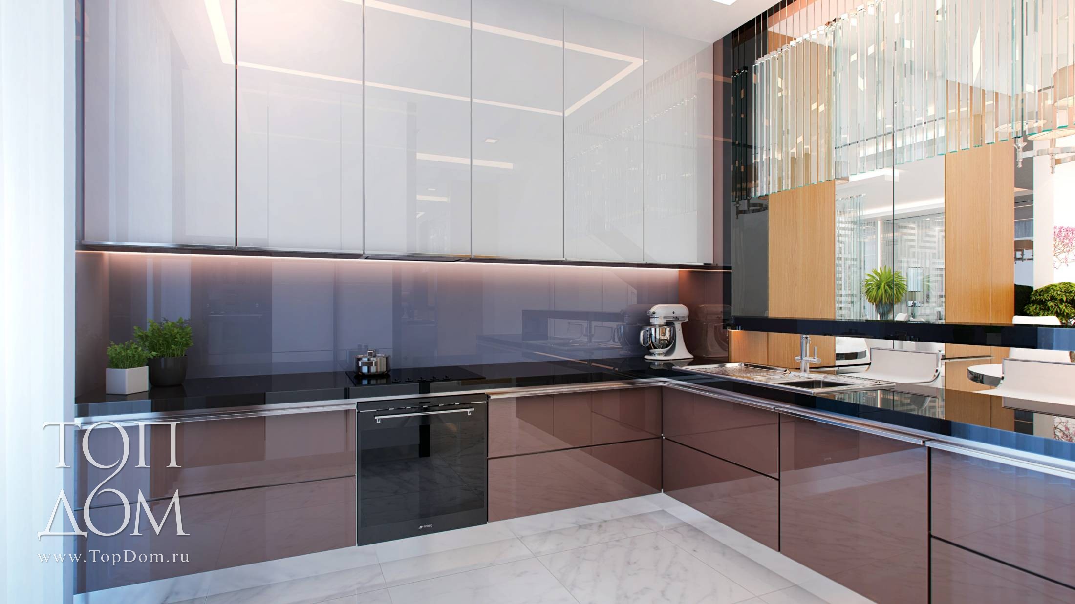 Кухня имеет Г-образное расположение с контрастным цветовым решением. Поверху идут подвесные шкафы с глянцевыми белыми фасадами, нижние ящики и шкафы – кофейного оттенка, такие же глянцевые. Фартук выполнен из закаленного стекла коричневого тона.