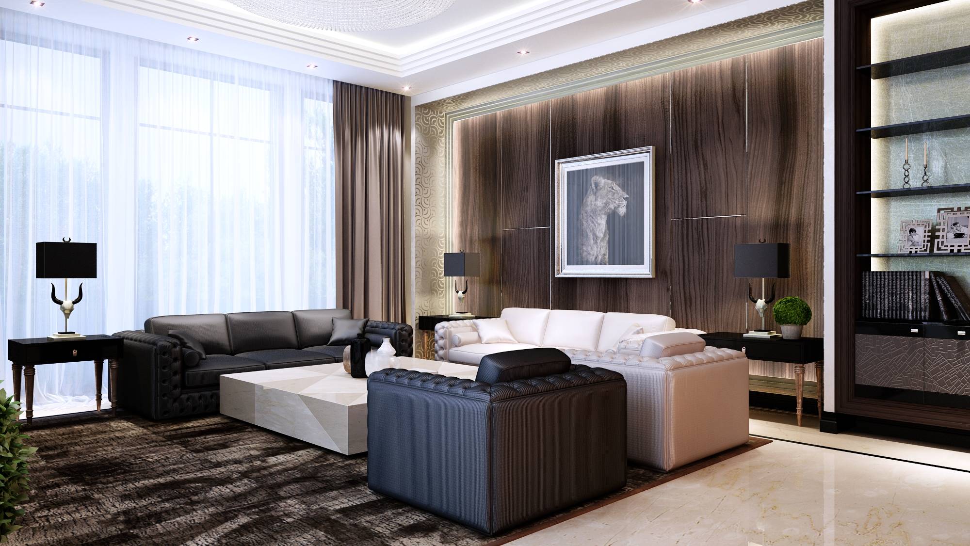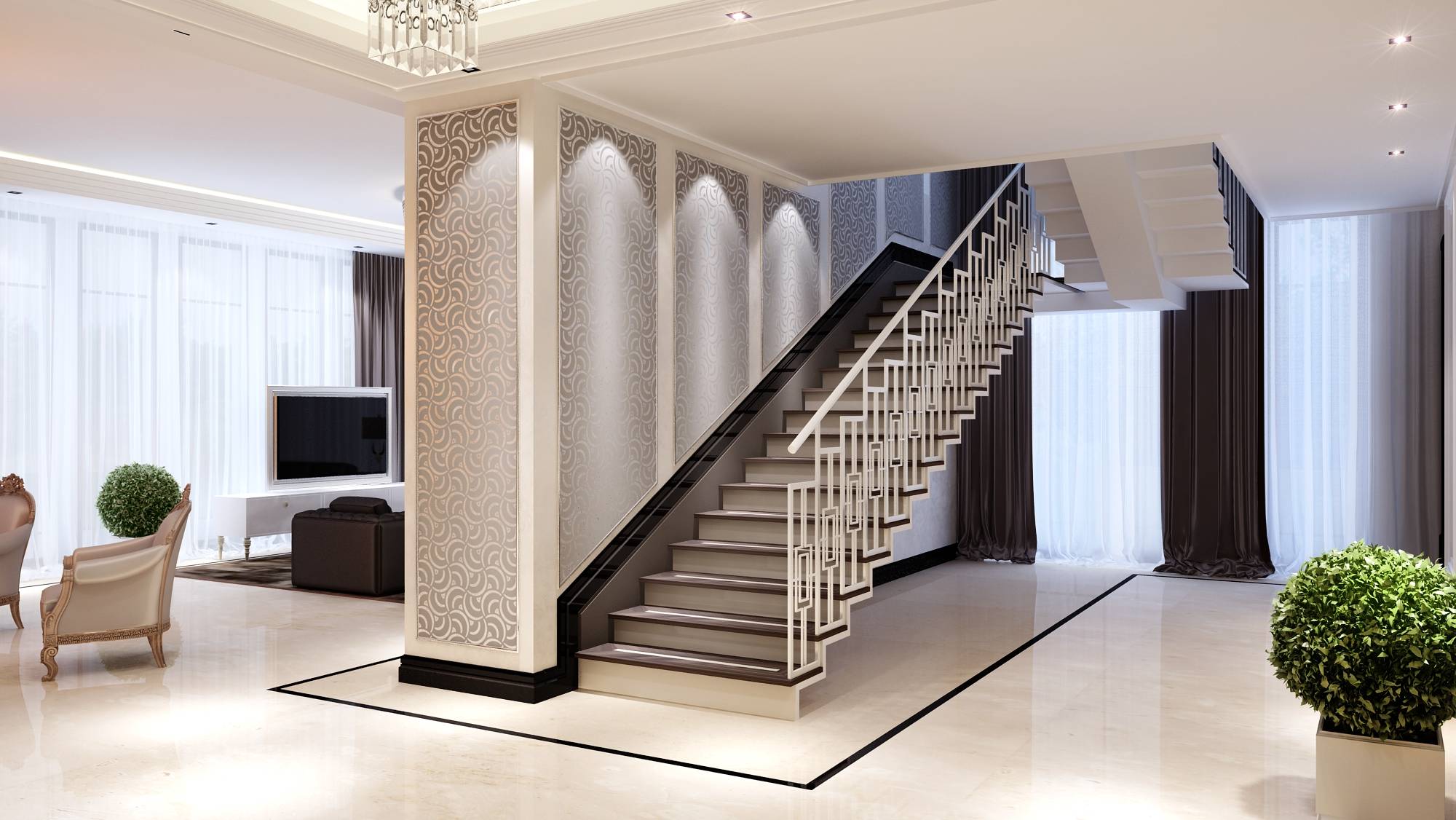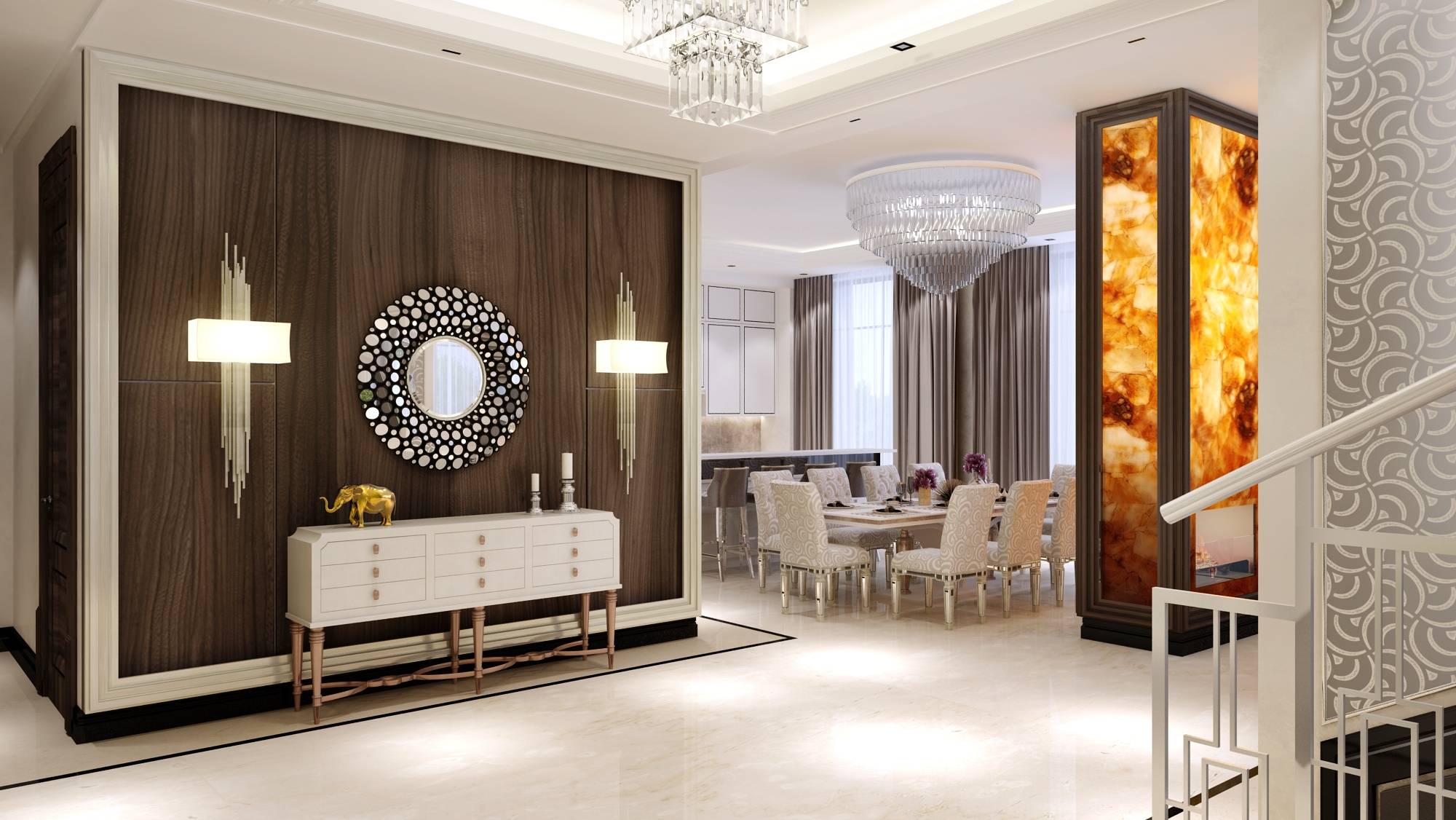 Контрастные цветовые сочетания в дизайне холла, гостиной, столовой смягчены теплой фактурой деревянных панелей, огненными всполохами декоративной перегородки. Дополнили идеальную обстановку роскошные люстры с подвесками, зеркала в стильных рамах, серебряные подсвечники и обои с геометрическим орнаментом.