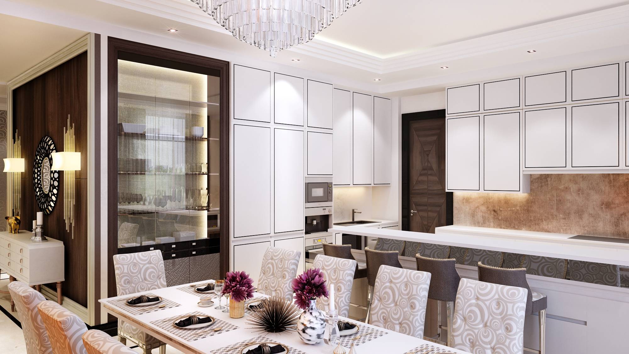 Интерьер зоны очень наряден и торжествен. За этот эффект отвечают белые глянцевые поверхности: столешница обеденного стола, барная стойка, фасады подвесных шкафов, украшенные контрастными черными кантами. Рисунок обивки обеденных и барных стульев, с множеством повторяющихся округлых элементов, перекликается с узором обоев в гостиной и холле. Такой прием помогает зрительно собрать студийное пространство общественной части.
