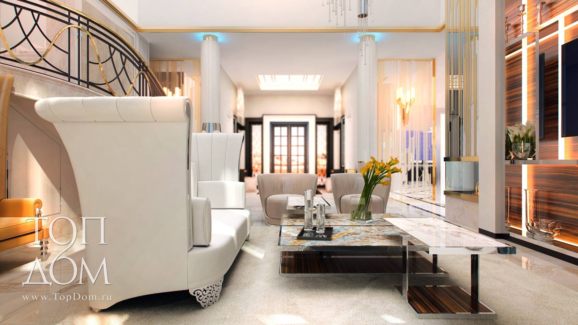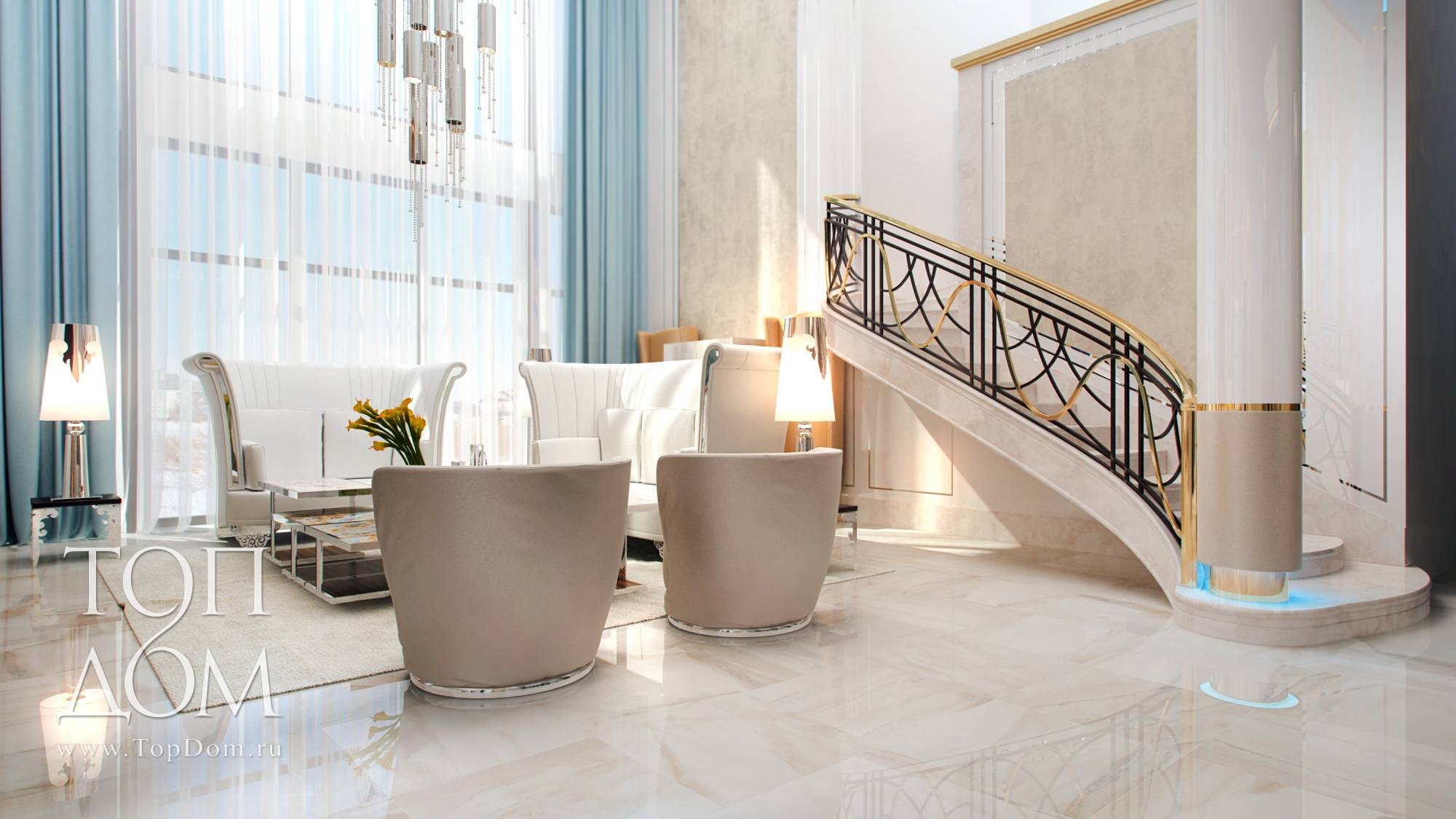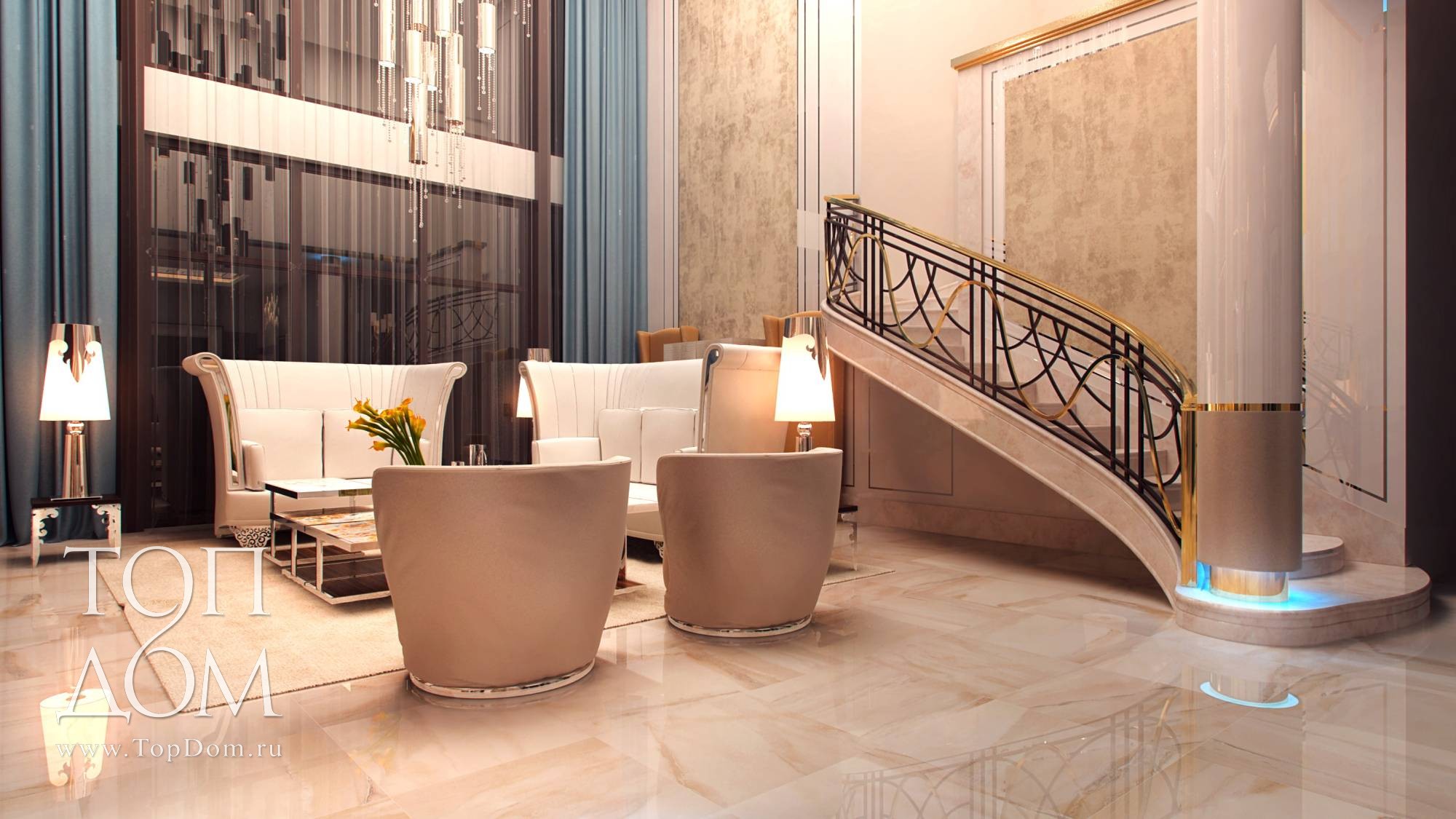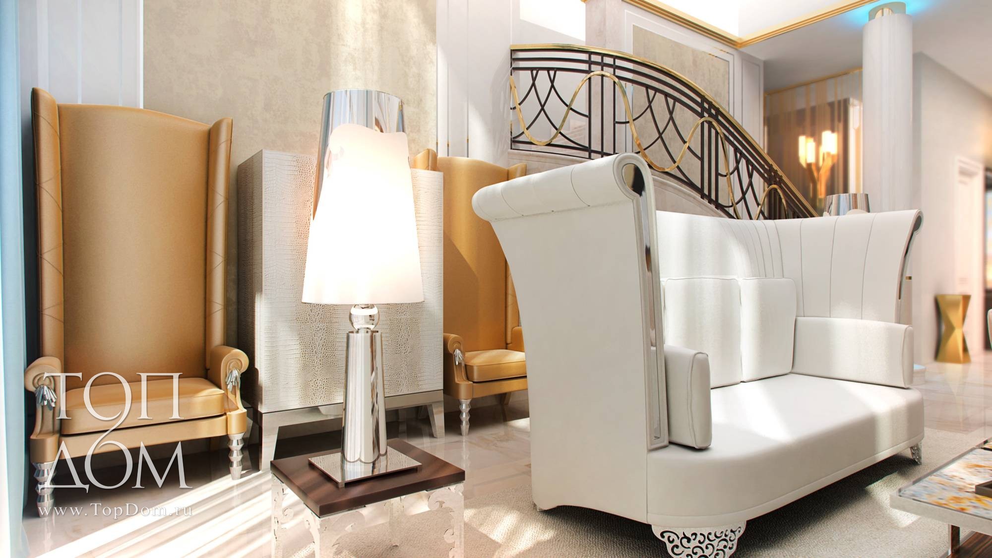 На мягкой мебели сделан главный акцент. В центре – композиция из двух диванов и кресел. Диваны оригинальной формы с цельной высокой спинкой и боковинами напоминают раскрывающийся цветочный бутон. Они украшены блестящими хромированными вставками и резными передними ножками. Высокая спинка отгораживает от лишнего шума и взглядов, для сидящих на диване людей формируется своя, очень уютная атмосфера. У стены ближе к лестнице организовано еще одно место отдыха с двумя высокими креслами наподобие трона. Их обивка цвета темного золота и блестящие ножки продолжают воплощать идею великолепия.