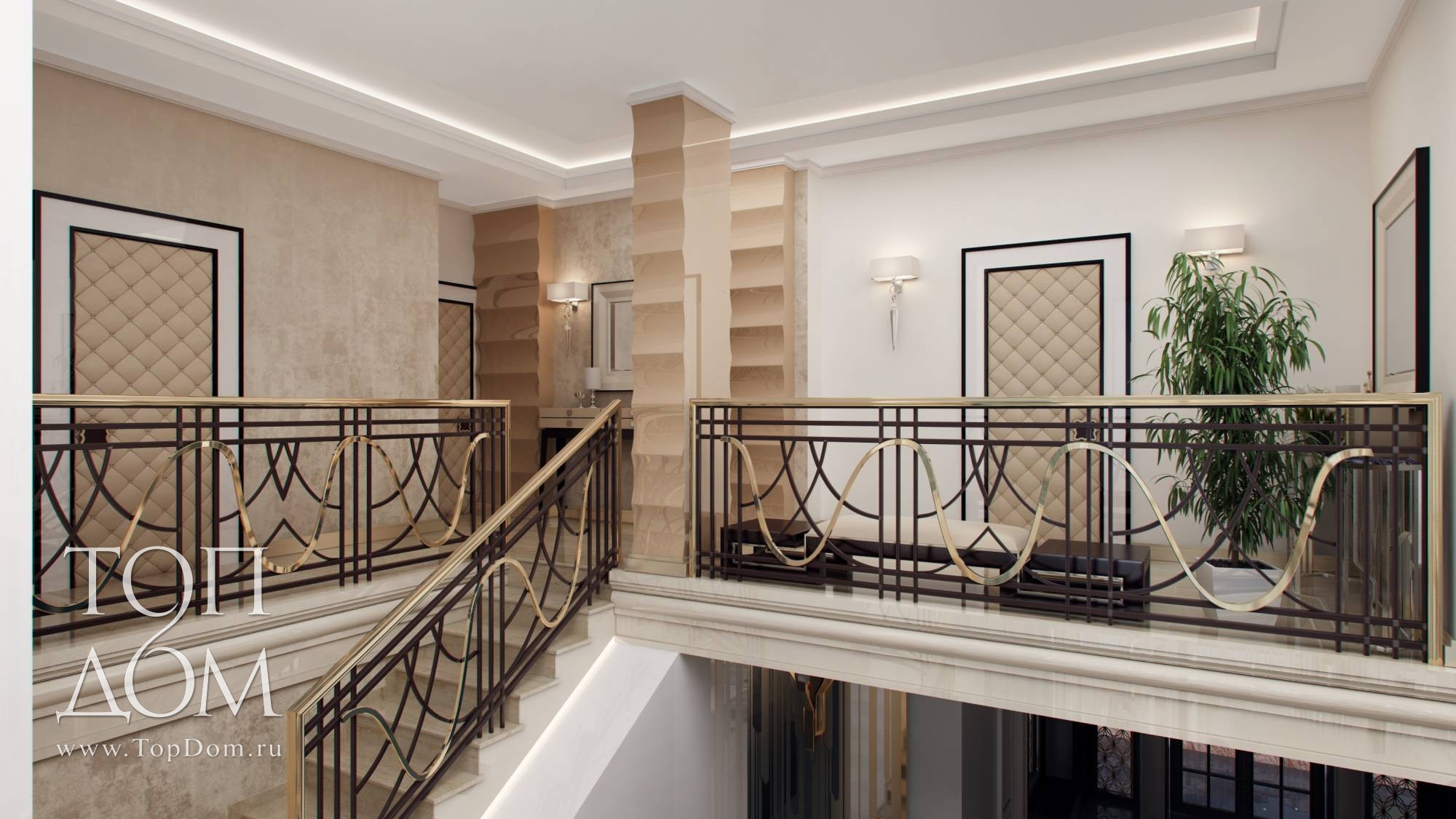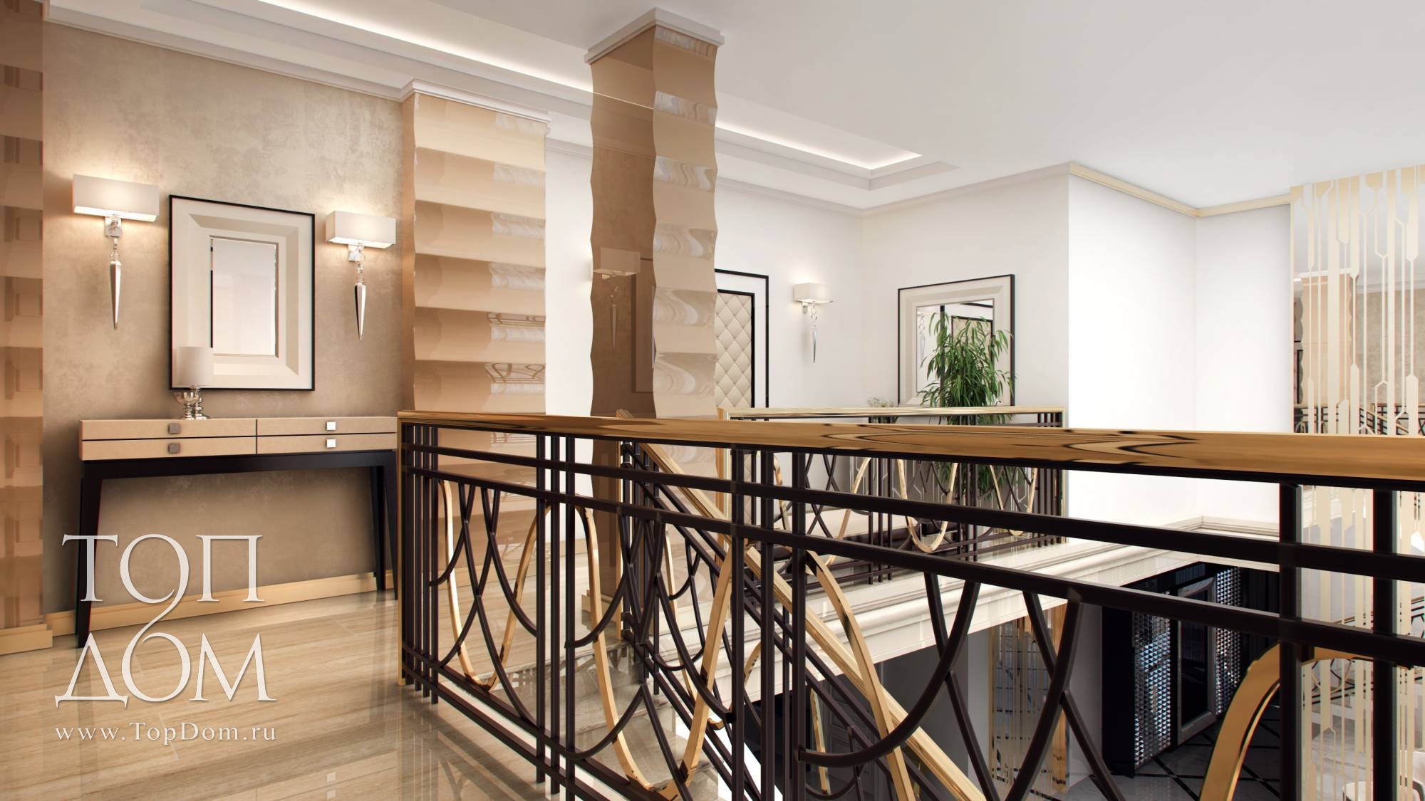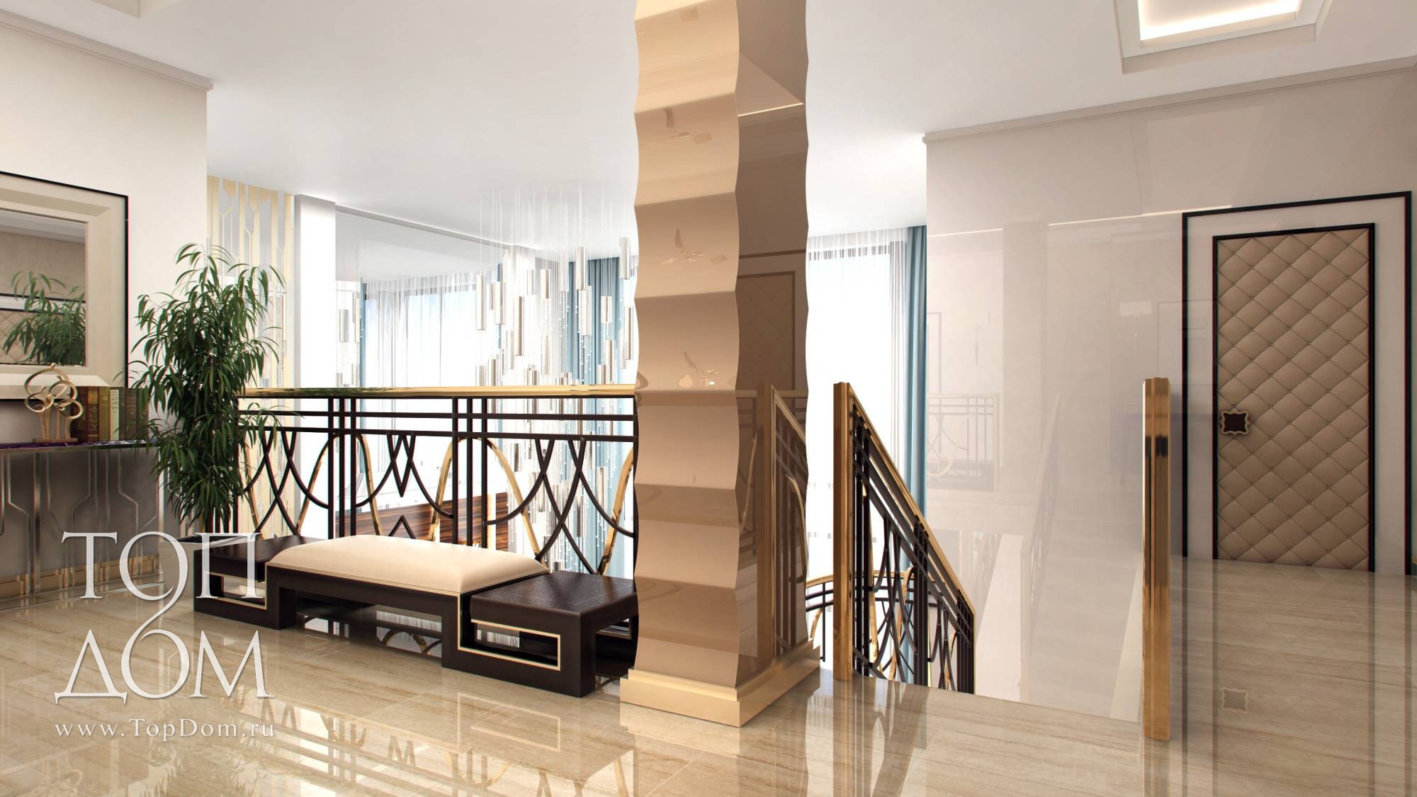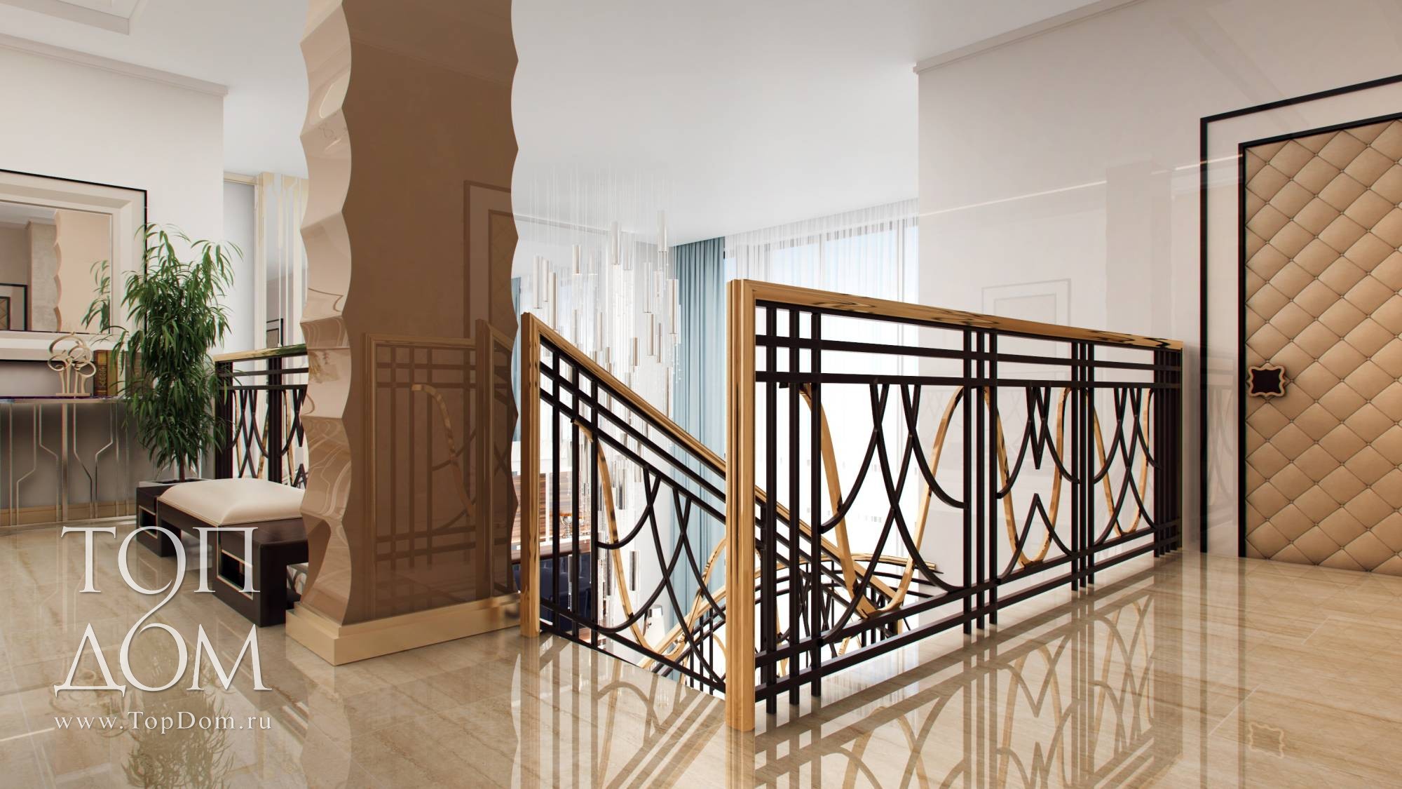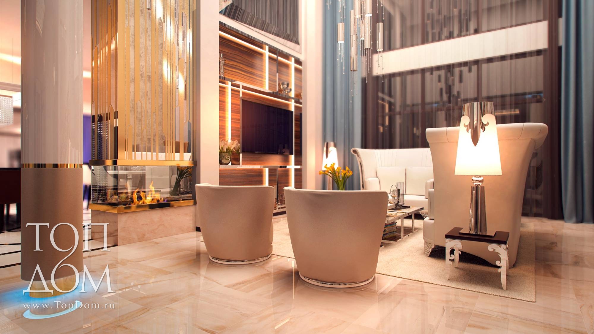 На мягкой мебели сделан главный акцент. В центре – композиция из двух диванов и кресел. Диваны оригинальной формы с цельной высокой спинкой и боковинами напоминают раскрывающийся цветочный бутон. Они украшены блестящими хромированными вставками и резными передними ножками. Высокая спинка отгораживает от лишнего шума и взглядов, для сидящих на диване людей формируется своя, очень уютная атмосфера. У стены ближе к лестнице организовано еще одно место отдыха с двумя высокими креслами наподобие трона. Их обивка цвета темного золота и блестящие ножки продолжают воплощать идею великолепия.