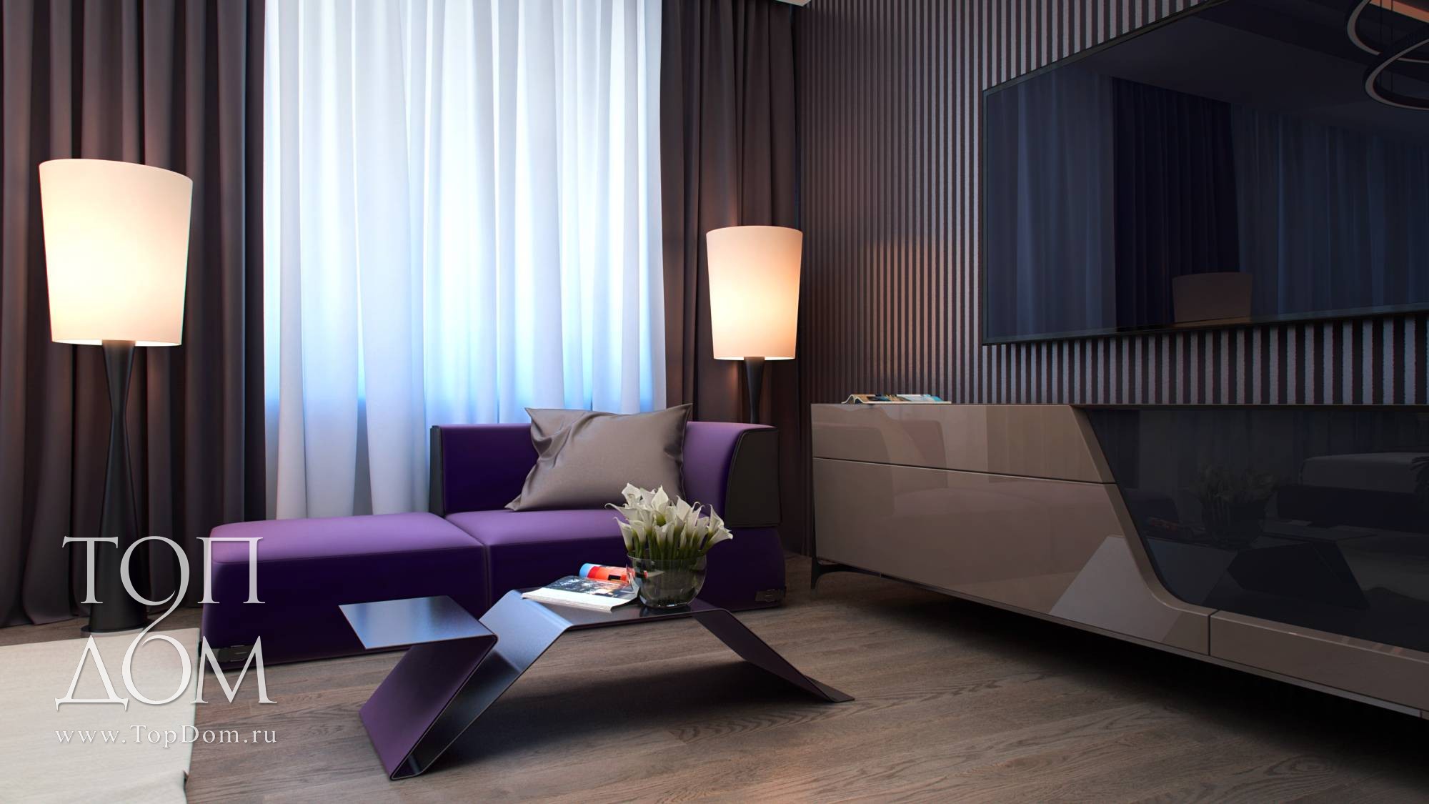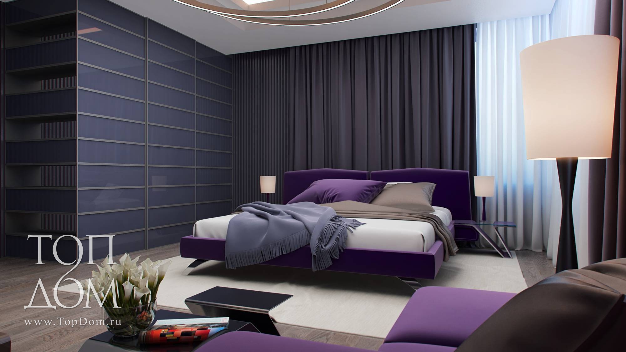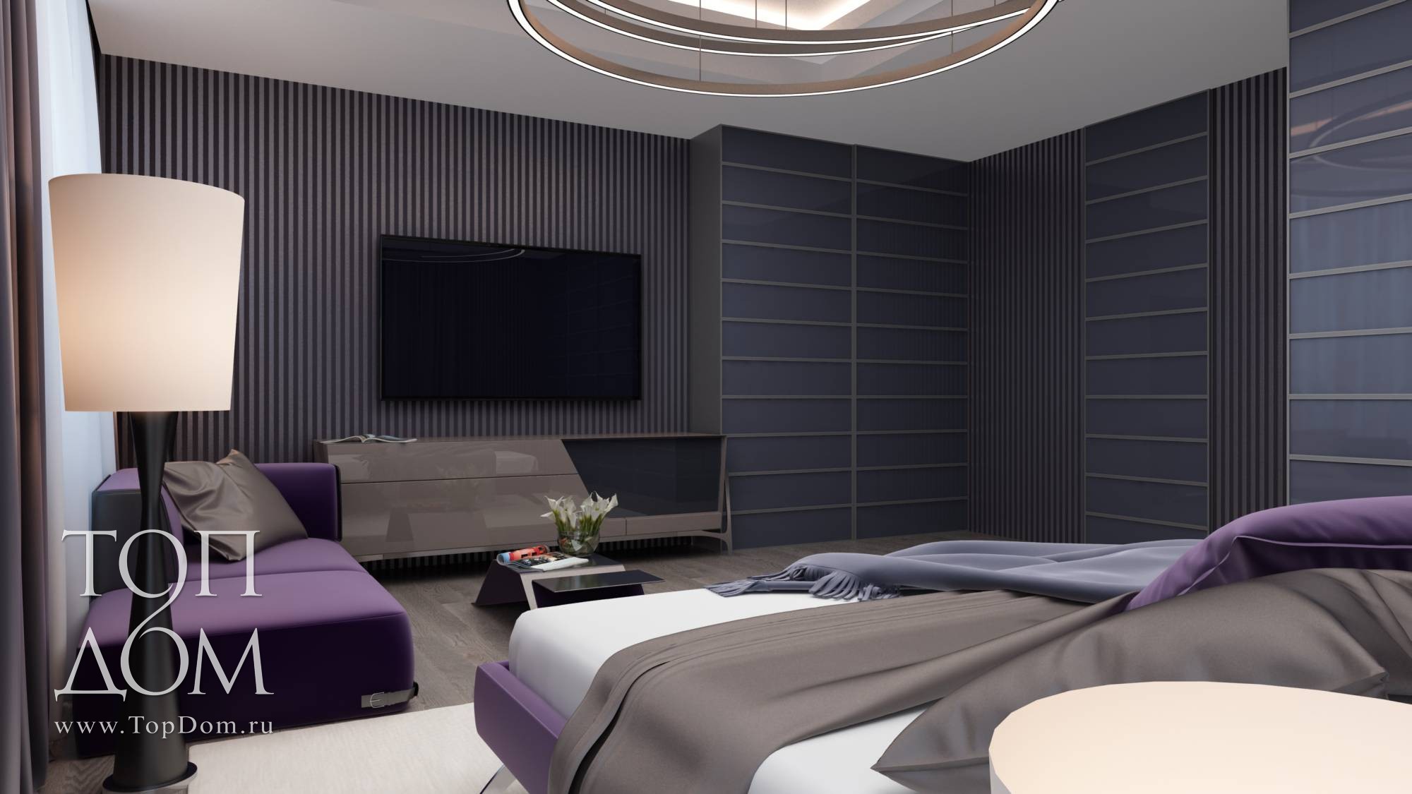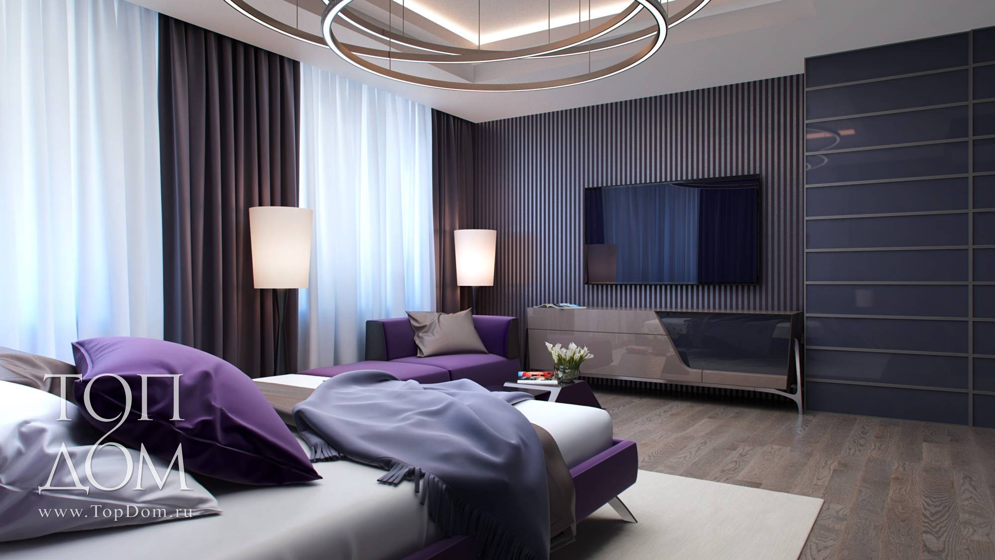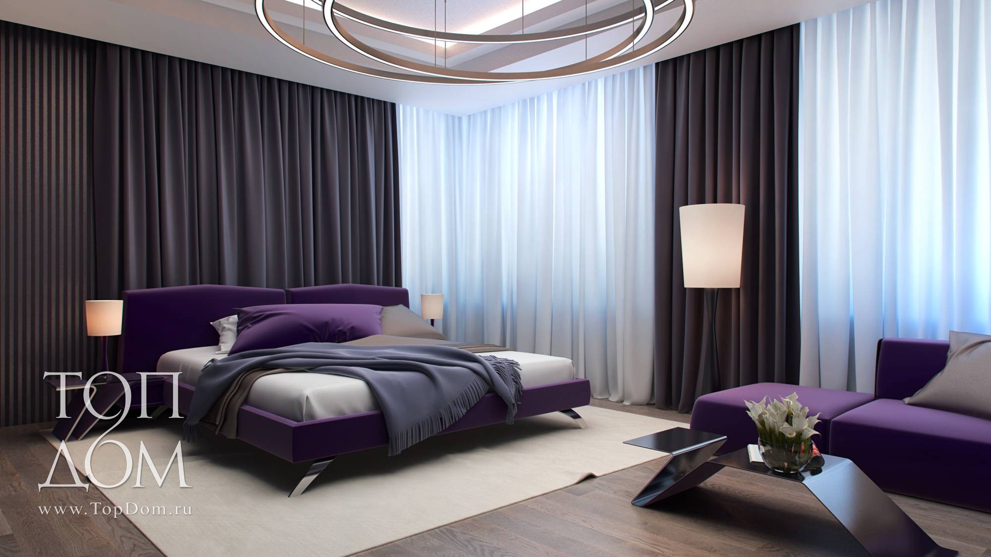 Интерьер более темный, насыщен фиолетовыми и серыми оттенками (обои на стенах, шторы, фасады шкафов). Необычной формой с ломаными линиями привлекают внимание журнальный и прикроватные столики. Весьма оригинален основной светильник из нескольких крупных колец на подвесах.