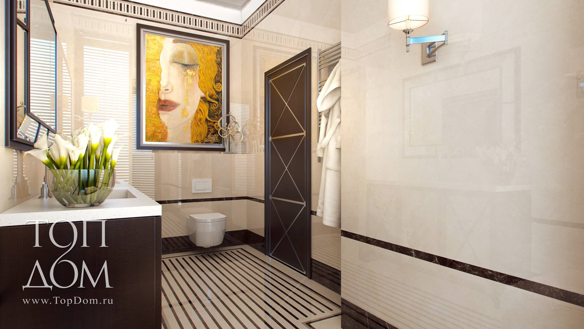 Комната имеет французское окно с деревянными жалюзи. Темно-коричневым цветом выделен полосатый пол, плинтусы, потолочные фризы. Яркая деталь – картина в желтых тонах.