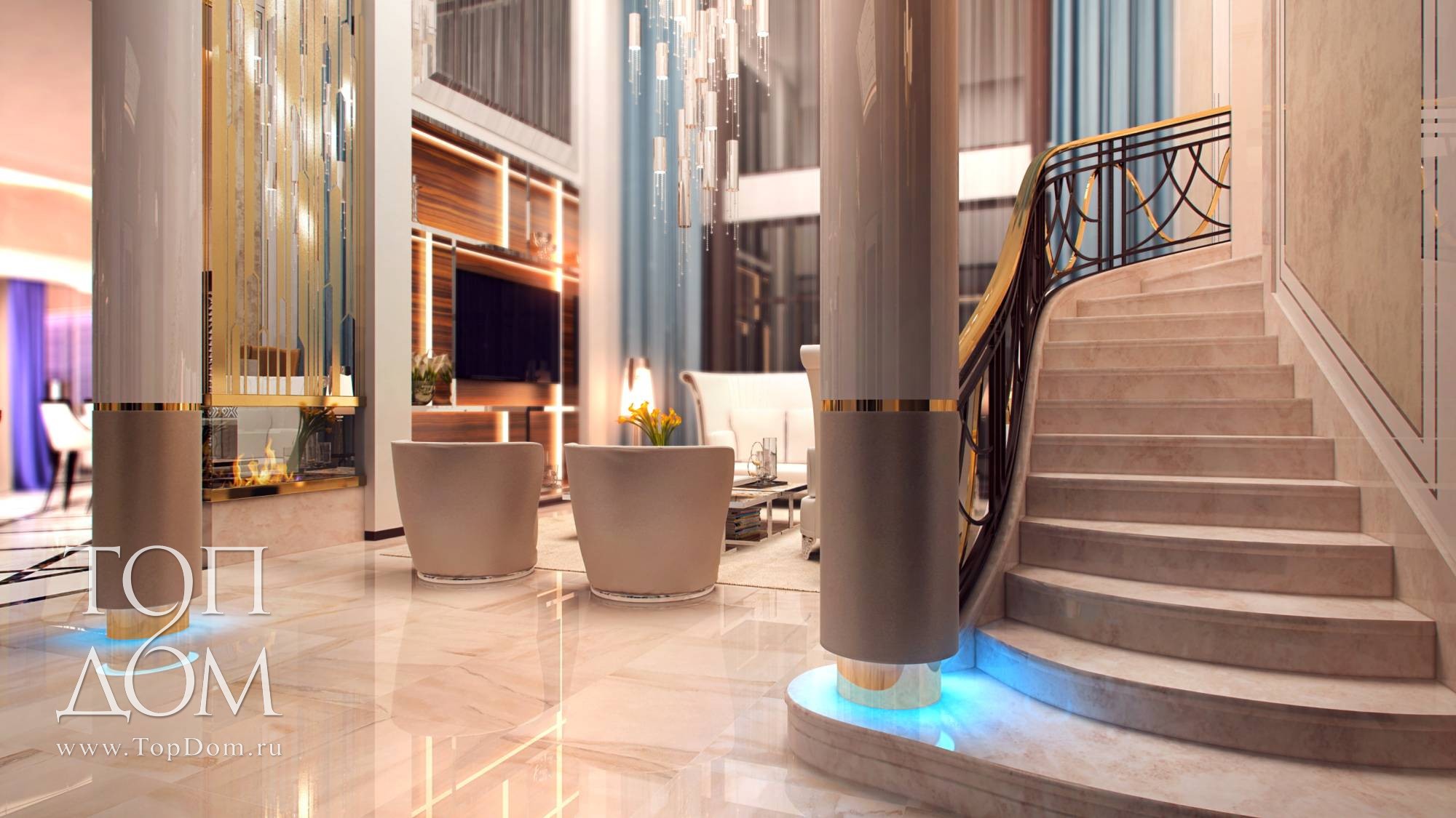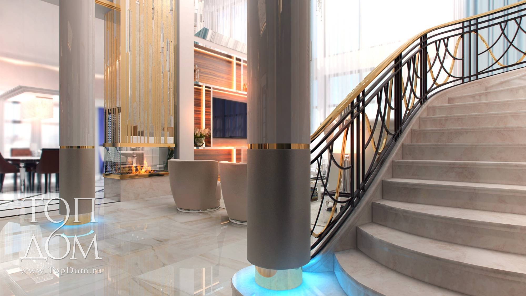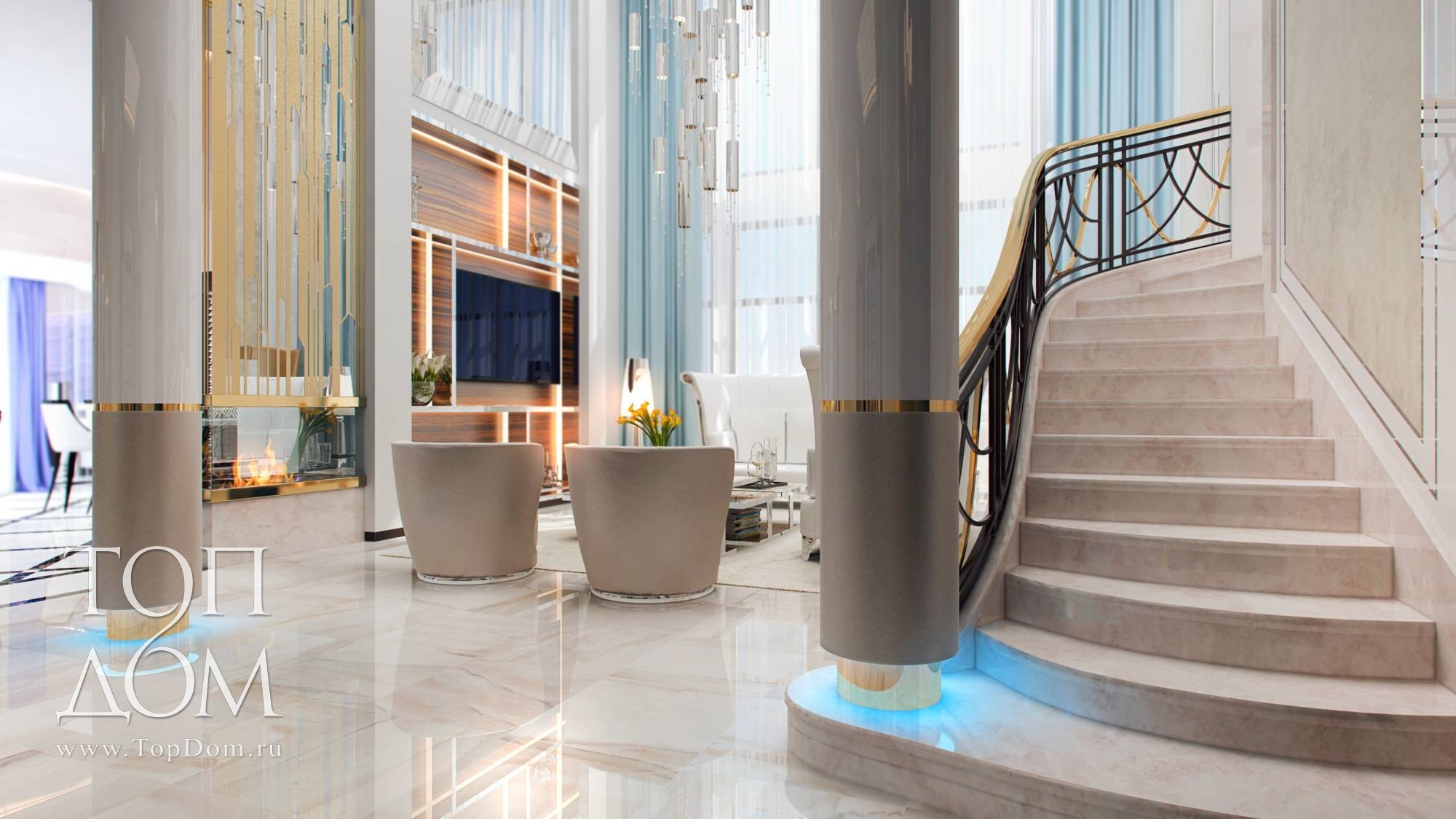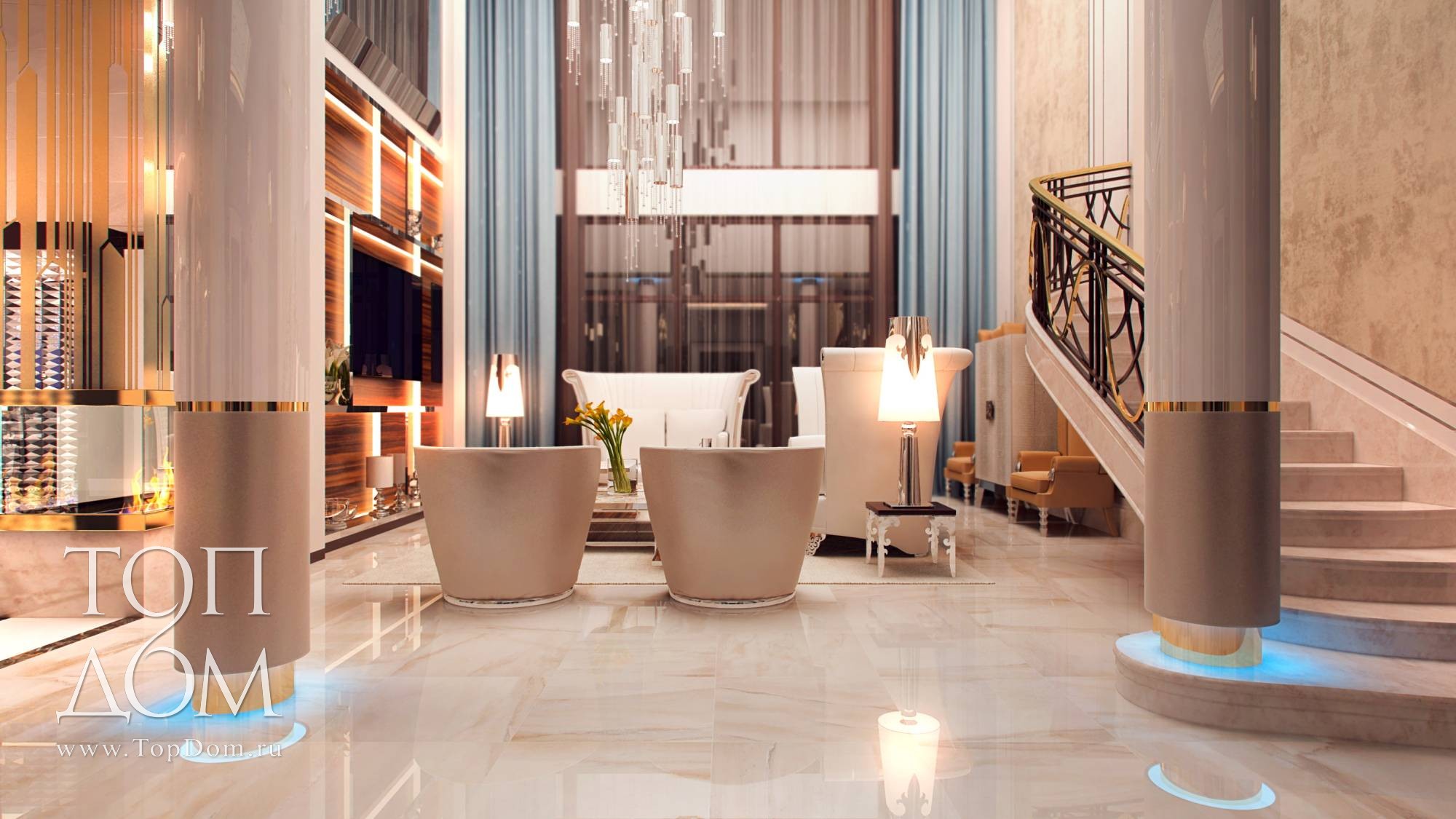 На входе в гостиную установлены круглые колонны с голубой подсветкой сверху и под основанием. Красивый голубой оттенок, созвучный со шторами на окнах, разбавляет колористику интерьера.
