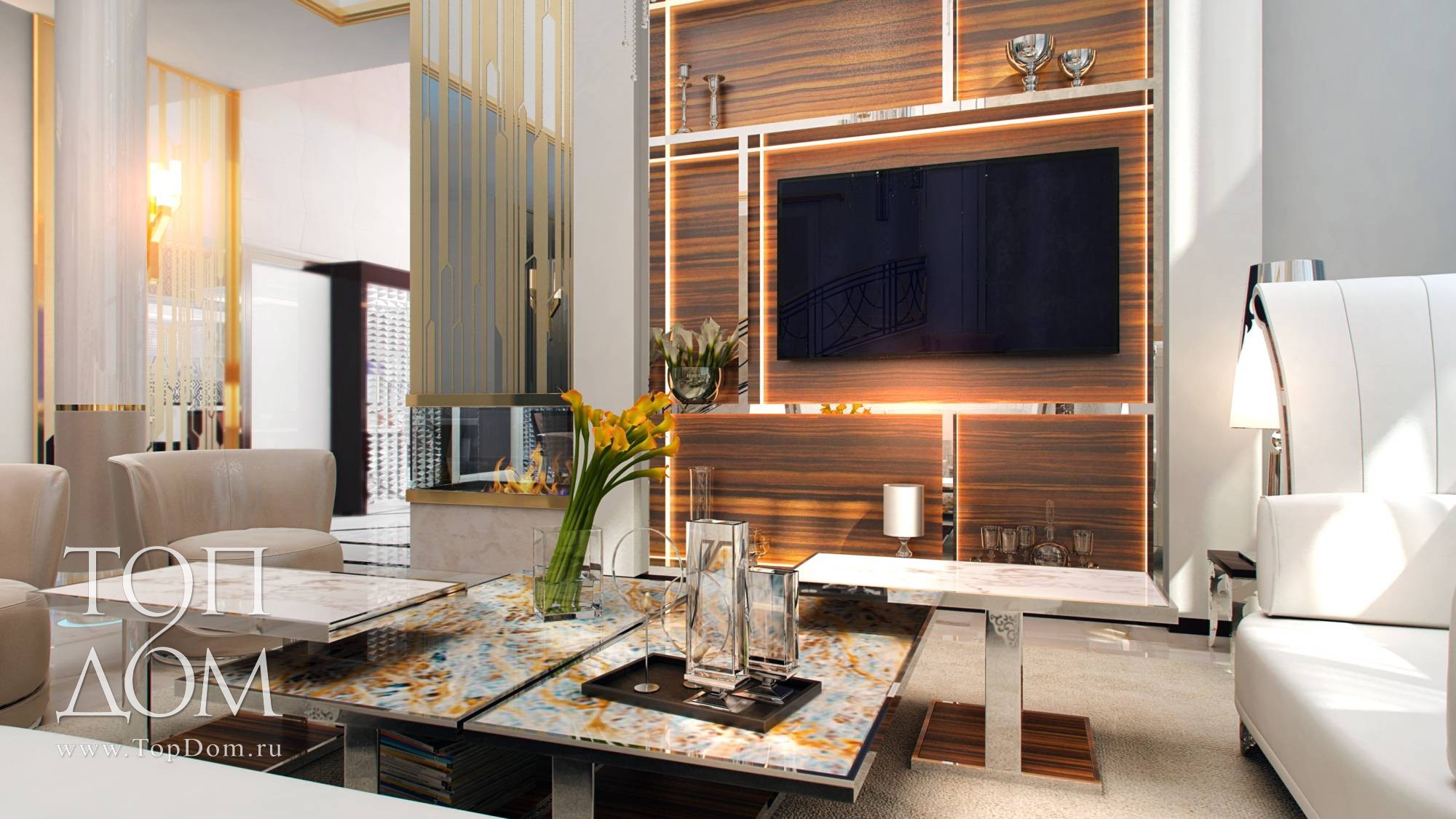 Зона ТВ обшита шпоном зебрано в коричнево-желтой гамме. Рельеф задают блестящие профили-полки с подсветкой. Слева примыкает портал биокамина, его украшает огромная зеркальная панель с золотым рисунком.