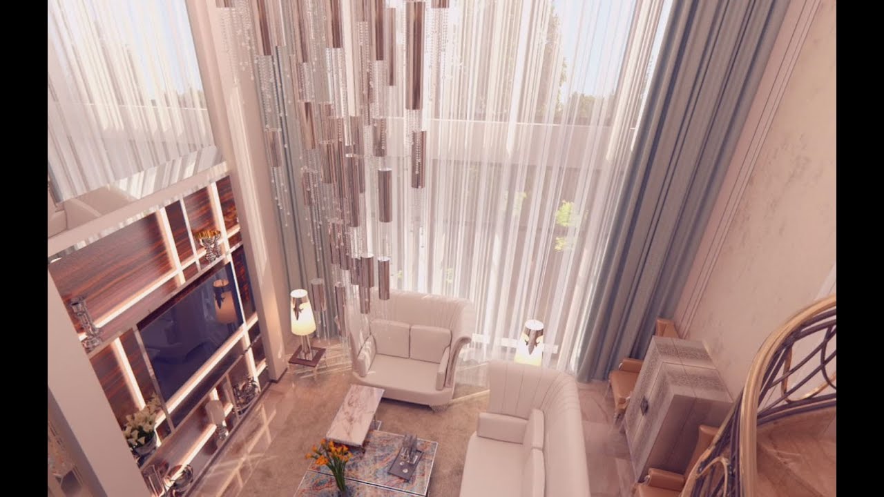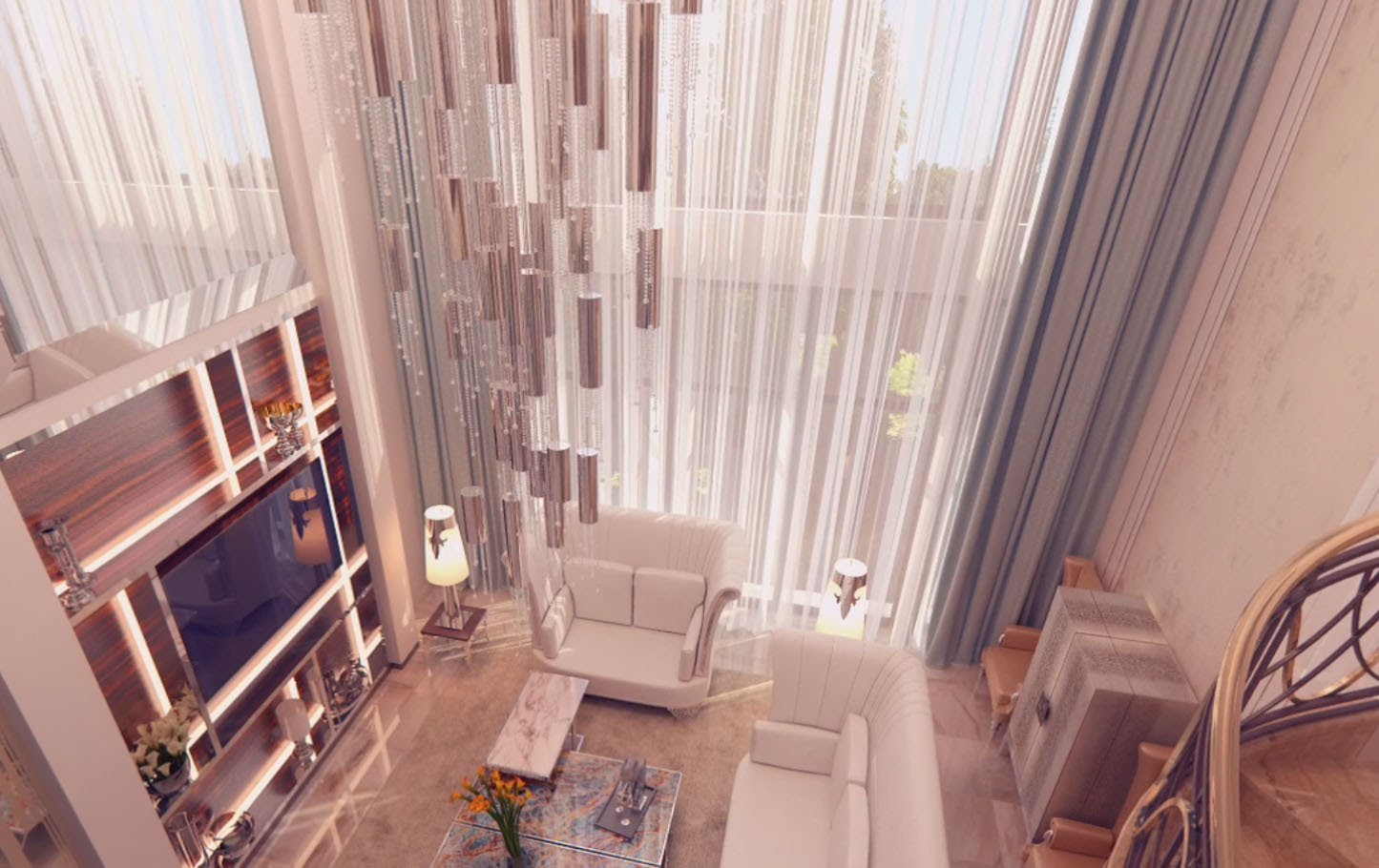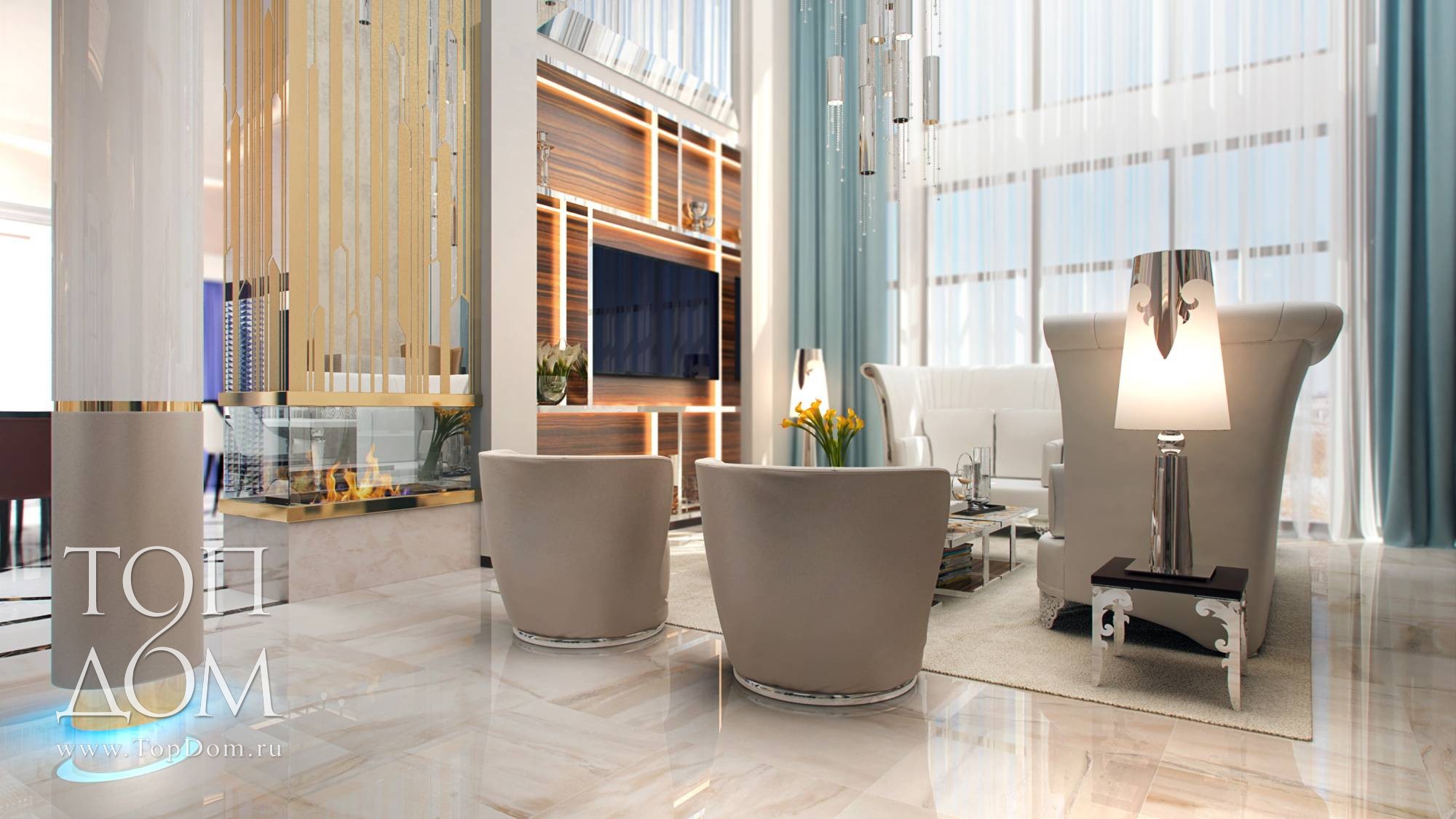 О пространстве двусветной гостиной можно сказать, что оно сияет. Такой эффект достигается выбором белоснежной мягкой мебели, гладкими белыми стенами, светло-бежевым керамогранитным полом, а также хромированными профилями (в серебре и золоте) в отделке зоны ТВ.