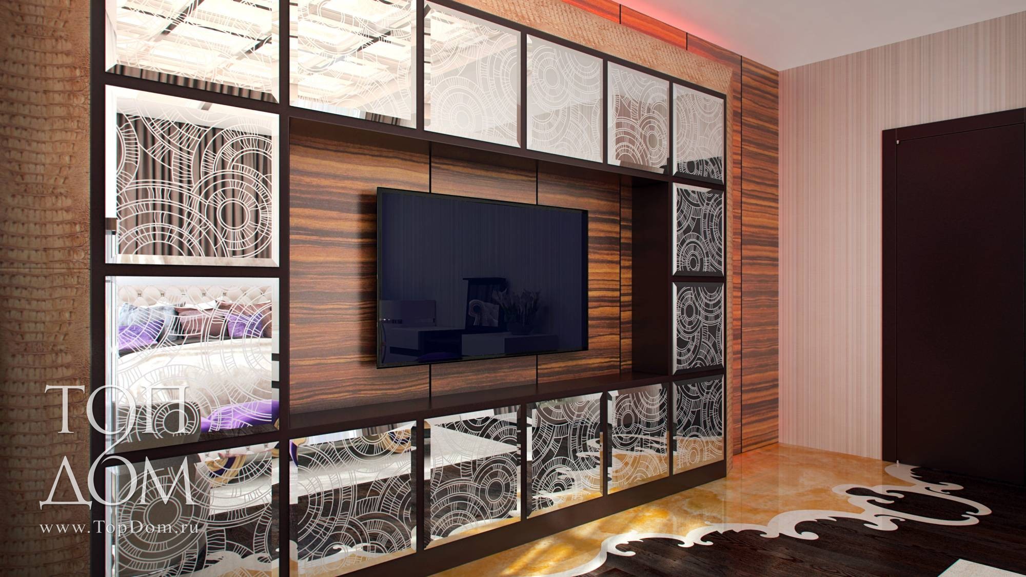 Зона ТВ оформлена выносной консолью с множеством зеркальных панелей с филигранным рисунком. По периметру она отделана фактурной плиткой, подсвеченной красным цветом.