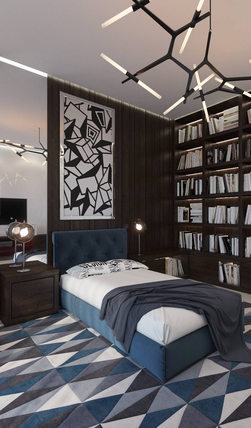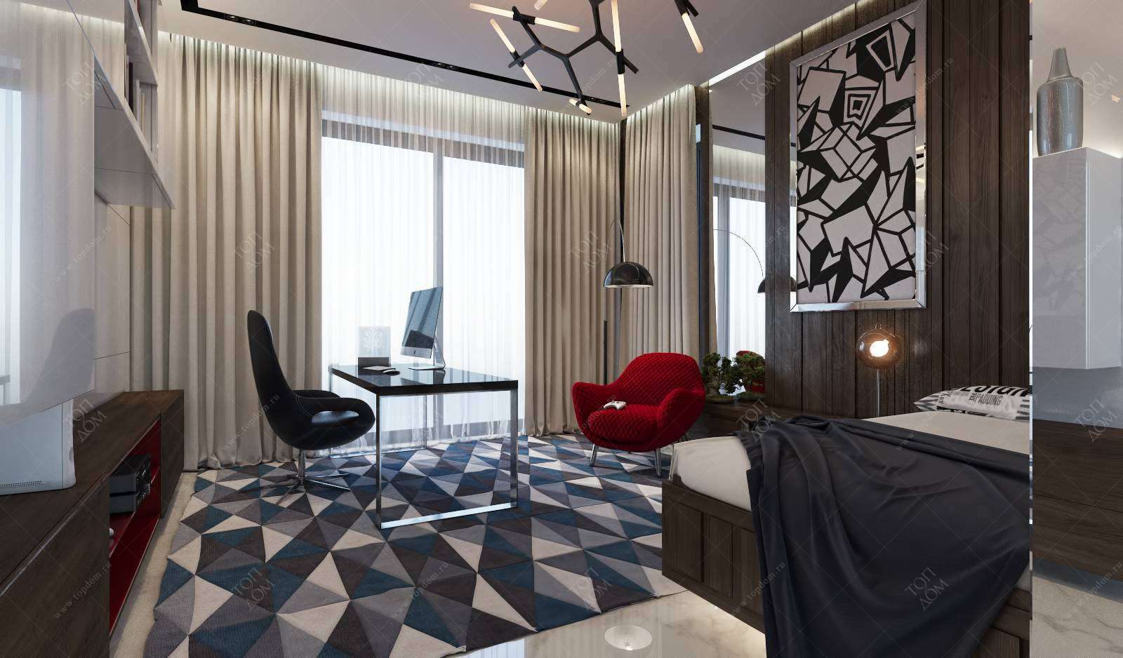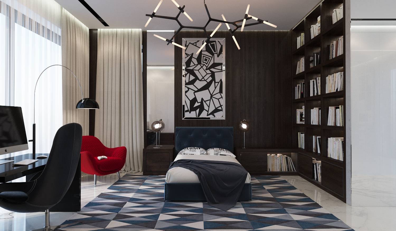 Это комната для молодого человека. Кровать располагается в углу с книжным стеллажом, прикроватная тумба тоже выполняет функцию полки. Цвета подобраны строгие: серые, коричневые, синие. Исключение – ярко-красное кресло, с которым компилируется темно-красная ниша в центральной тумбе.