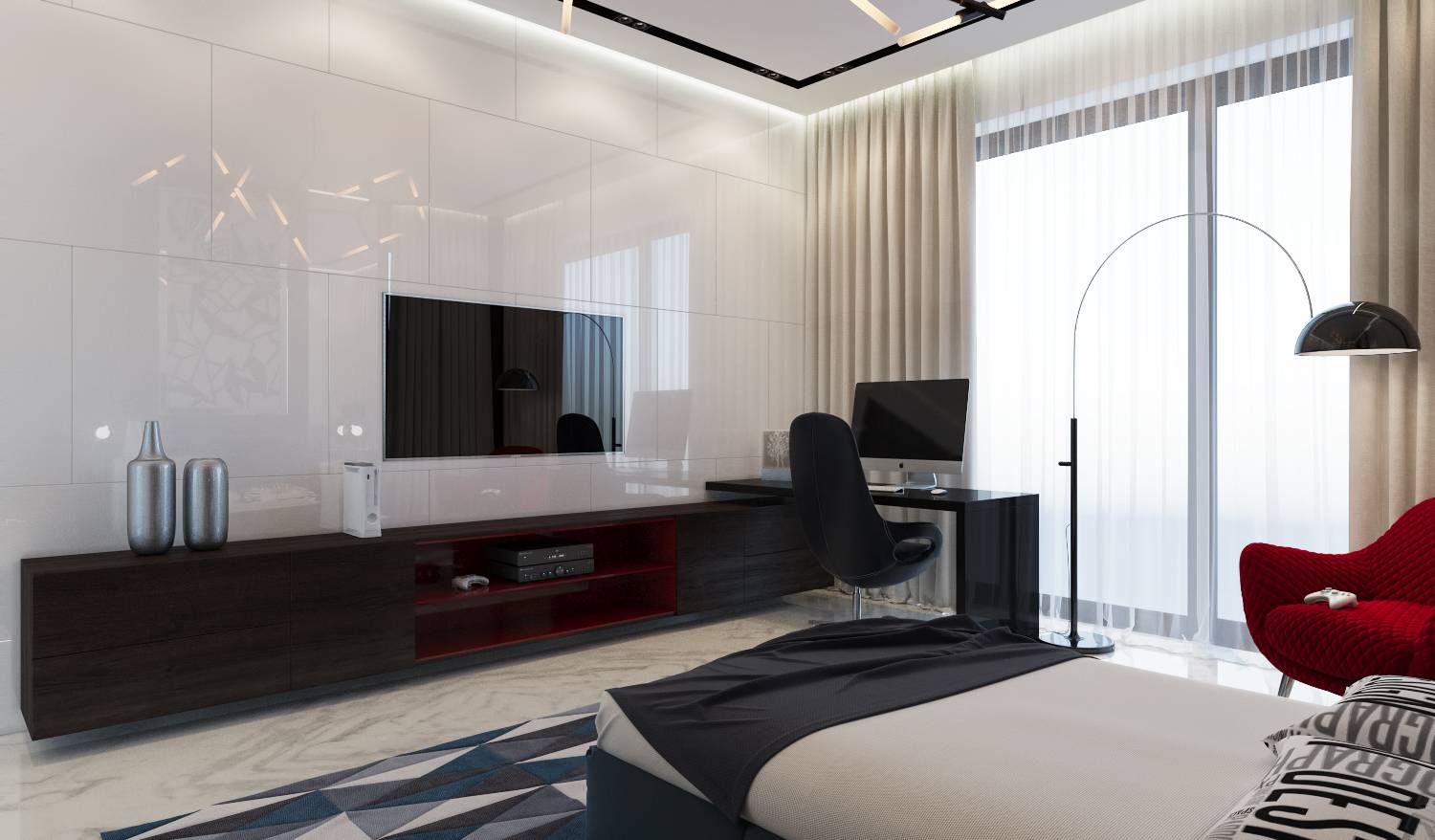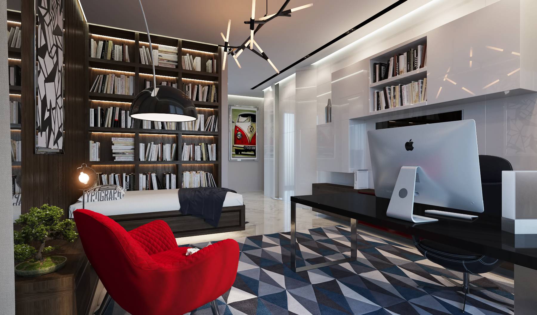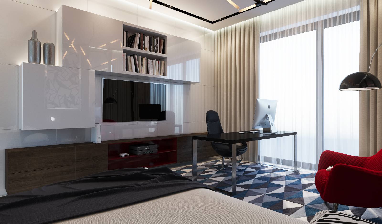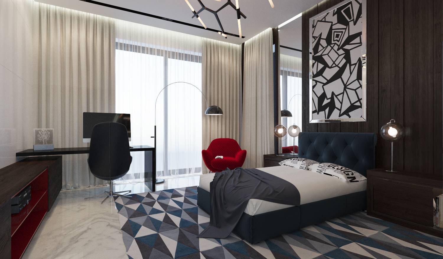 Это комната для молодого человека. Кровать располагается в углу с книжным стеллажом, прикроватная тумба тоже выполняет функцию полки. Цвета подобраны строгие: серые, коричневые, синие. Исключение – ярко-красное кресло, с которым компилируется темно-красная ниша в центральной тумбе.