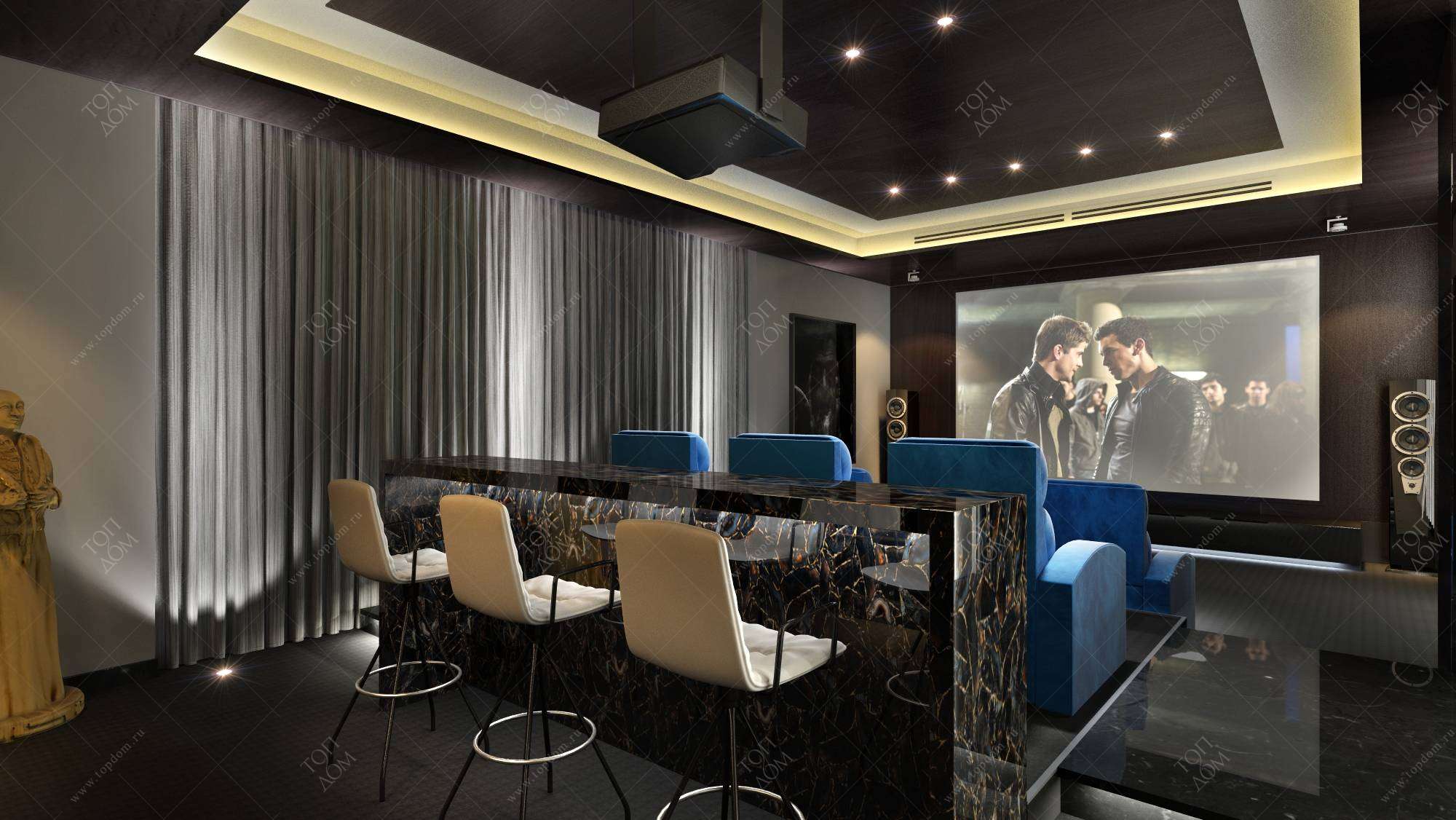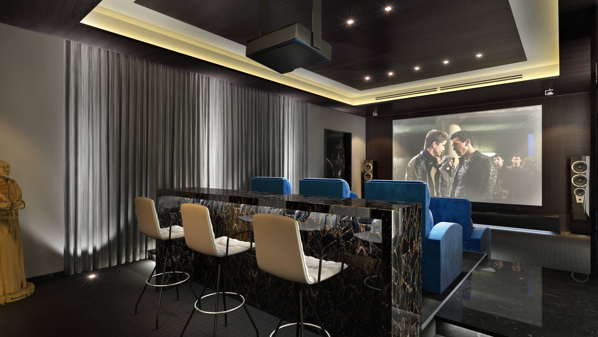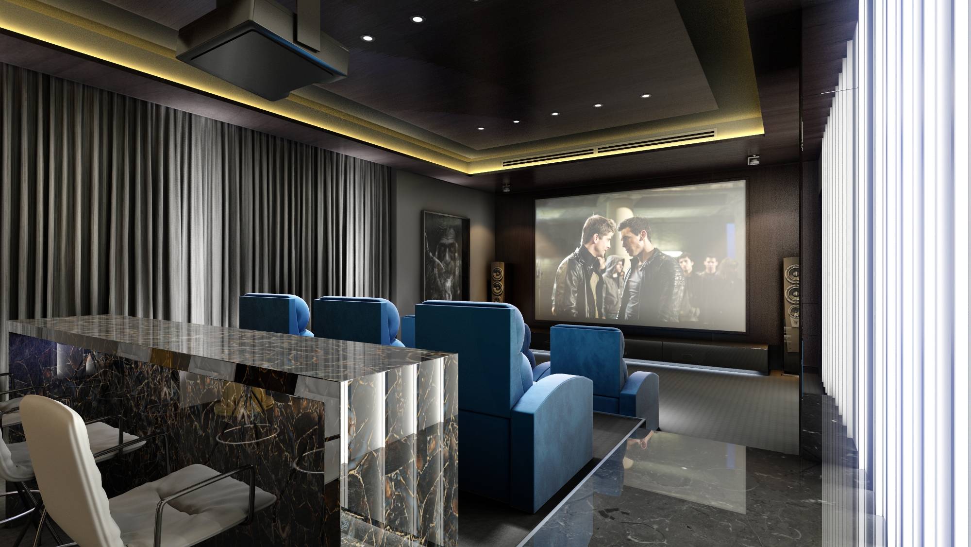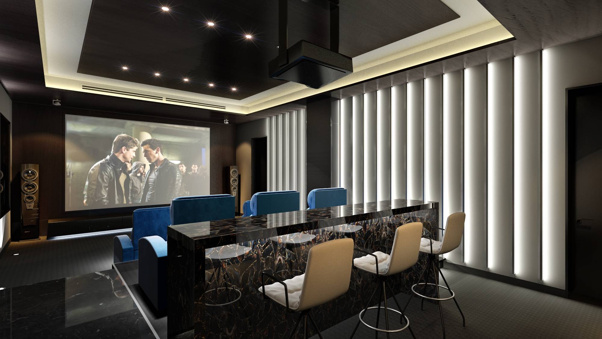 Дизайн кинозала выдержан в темно-серой гамме с акцентом на синие кресла. Барная стойка из натурального камня располагается позади сидений, плиткой под мрамор отделан подиум со ступенями. Основные материалы винотеки: дерево, декоративный камень. Организованы два места для дегустации: барная стойка в виде перевернутого конуса и зона телевизора.