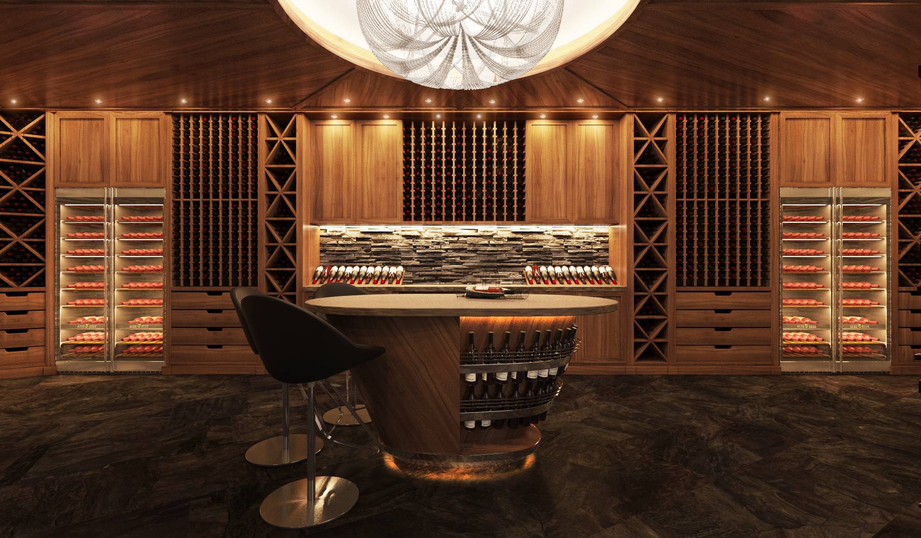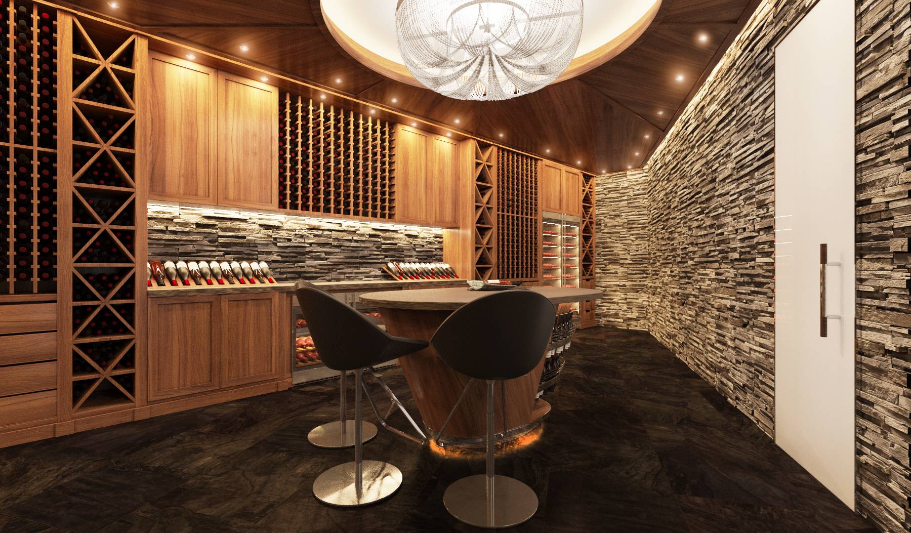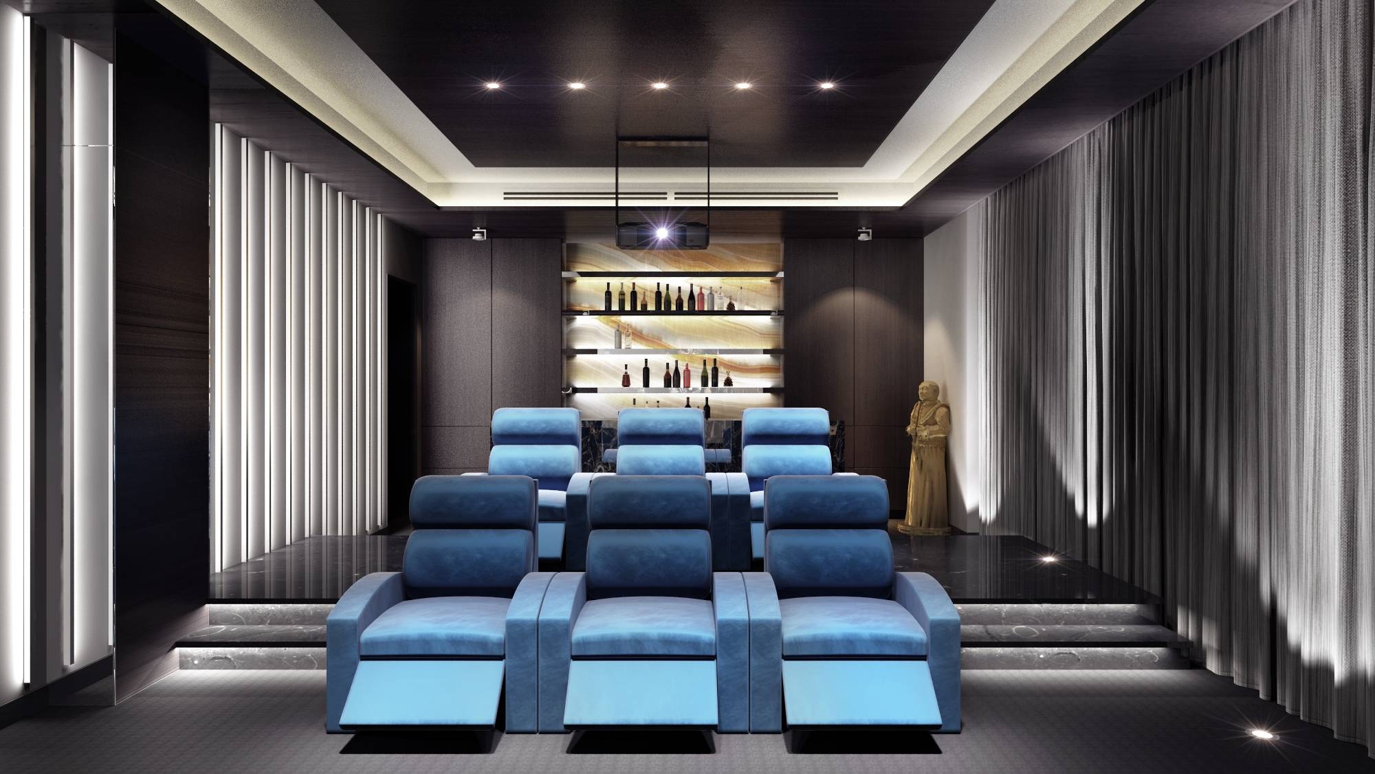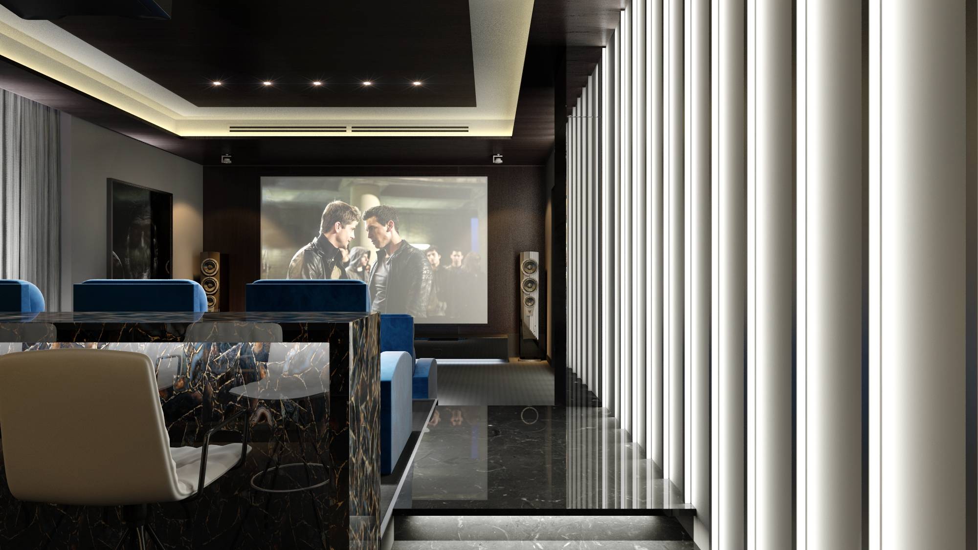 Дизайн кинозала выдержан в темно-серой гамме с акцентом на синие кресла. Барная стойка из натурального камня располагается позади сидений, плиткой под мрамор отделан подиум со ступенями. Основные материалы винотеки: дерево, декоративный камень. Организованы два места для дегустации: барная стойка в виде перевернутого конуса и зона телевизора.
