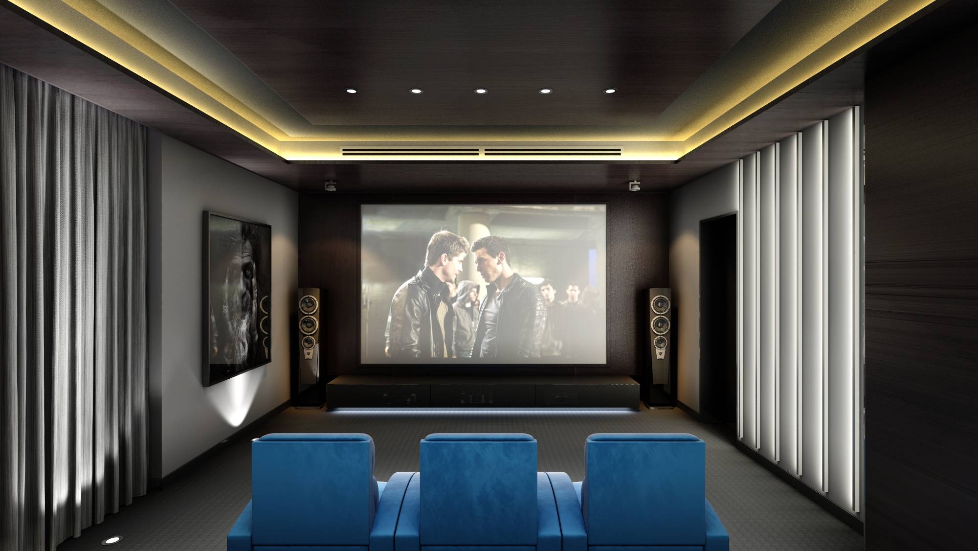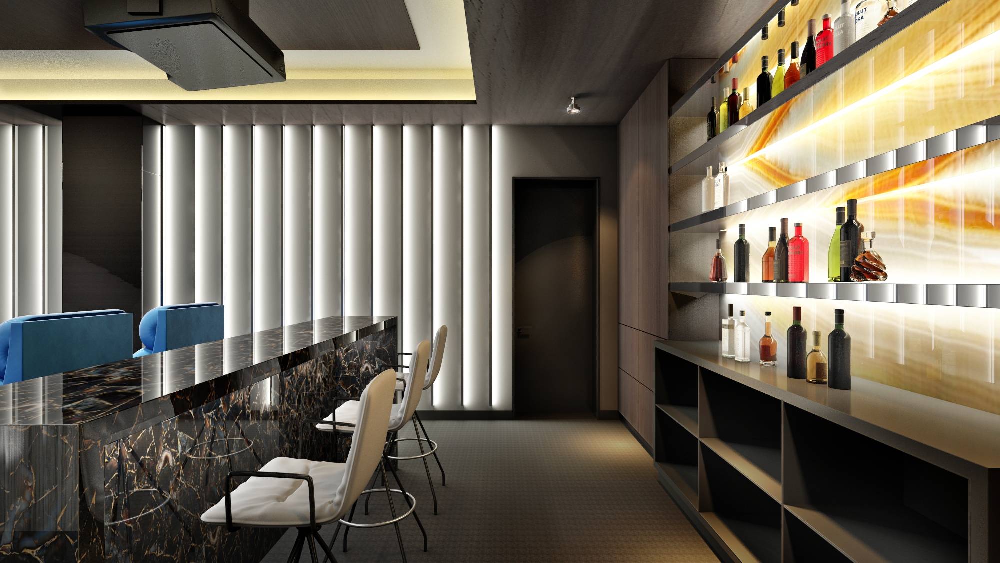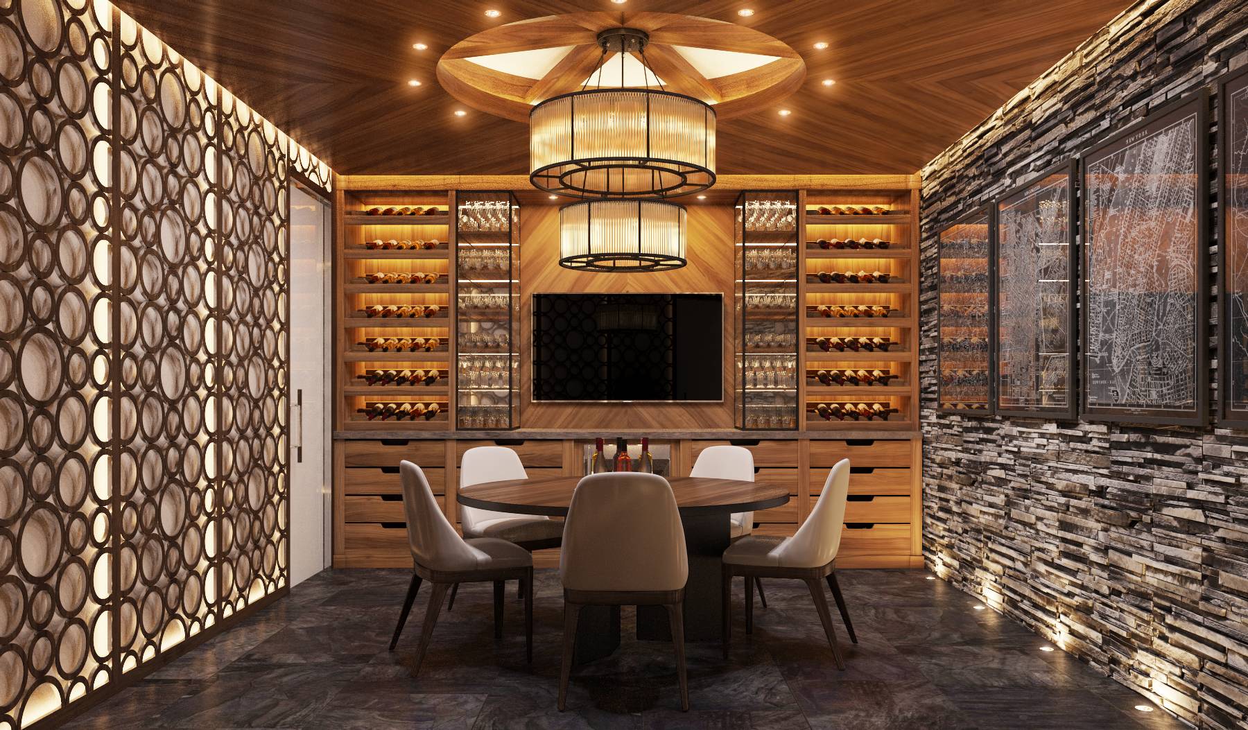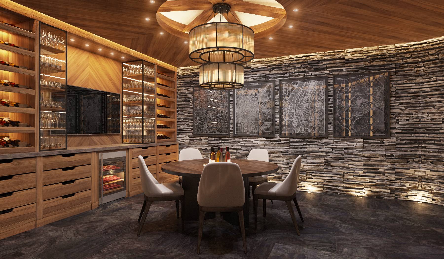 Дизайн кинозала выдержан в темно-серой гамме с акцентом на синие кресла. Барная стойка из натурального камня располагается позади сидений, плиткой под мрамор отделан подиум со ступенями. Основные материалы винотеки: дерево, декоративный камень. Организованы два места для дегустации: барная стойка в виде перевернутого конуса и зона телевизора.