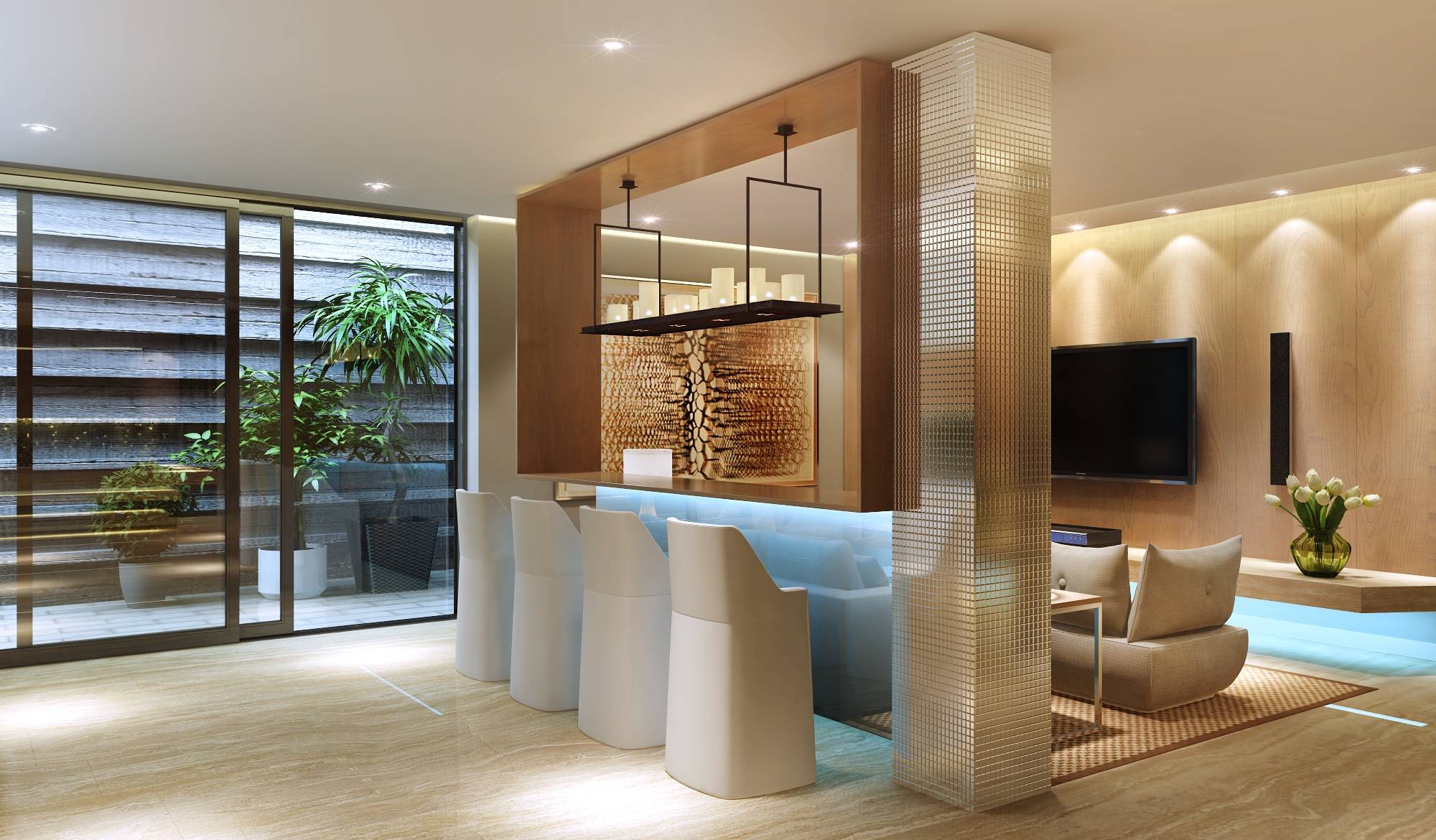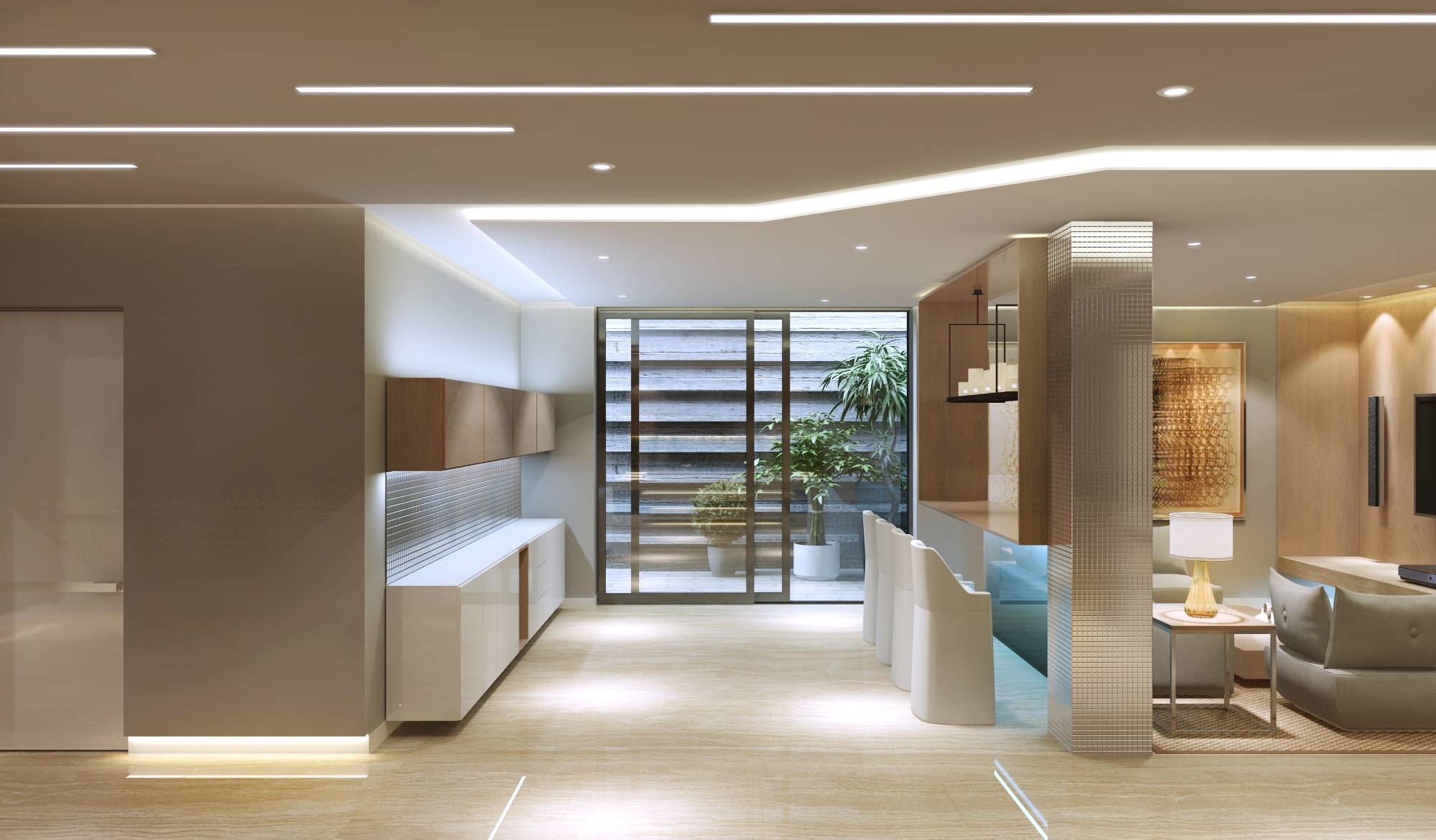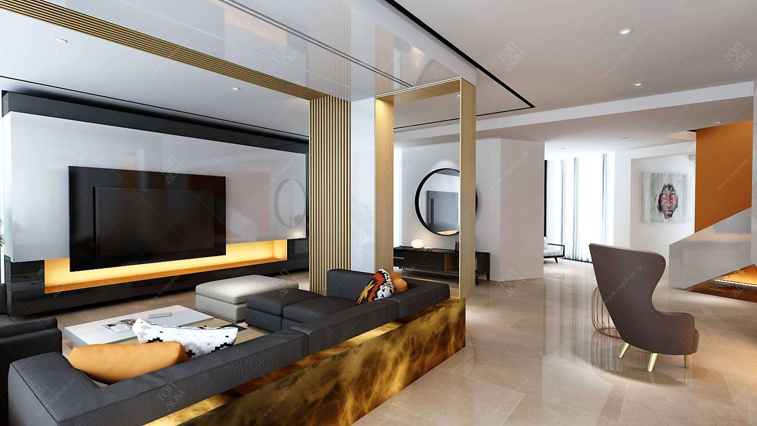 С подсветкой перекликаются солнечные тона оникса, из которого выполнена горизонтальная перегородка по периметру диванной группы, и деревянные рейки, переходящие с потолка к несущей колонне. Со стороны холла место отдыха символически отделяет рама из досок.