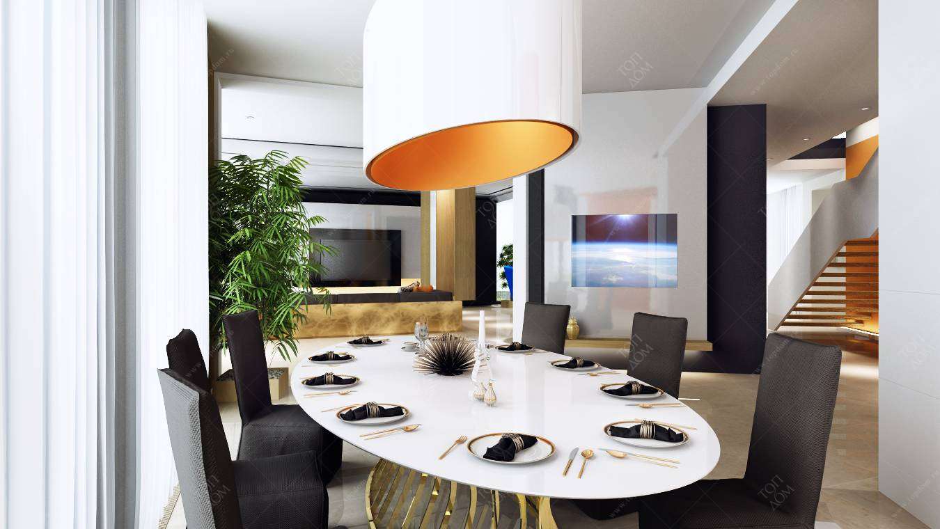 Располагается на пути из кухни в гостиную и служит для званых приемов. Ее изысканный дизайн интерьера подчеркнут золотым подстольем, белым глянцем столешницы и светильника. Перегородка напротив выделена контрастом черной краски и белой декоративной панели. За счет подбора фотоизображения на этой панели можно добиться эффекта расширения пространства.