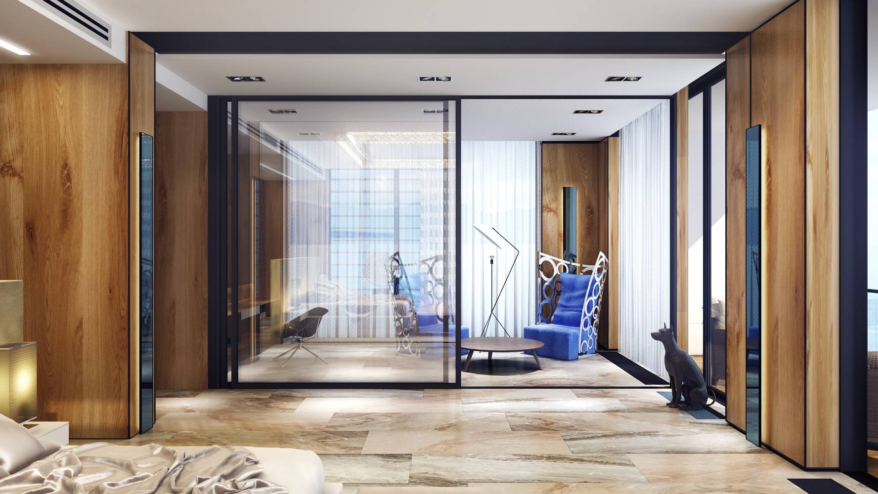 Здесь доминирует открытое пространство, разбитое на зоны гардероба, рабочее, спальное место. Перегородки между ними или вовсе отсутствуют, или представляют собой прозрачные раздвижные двери.