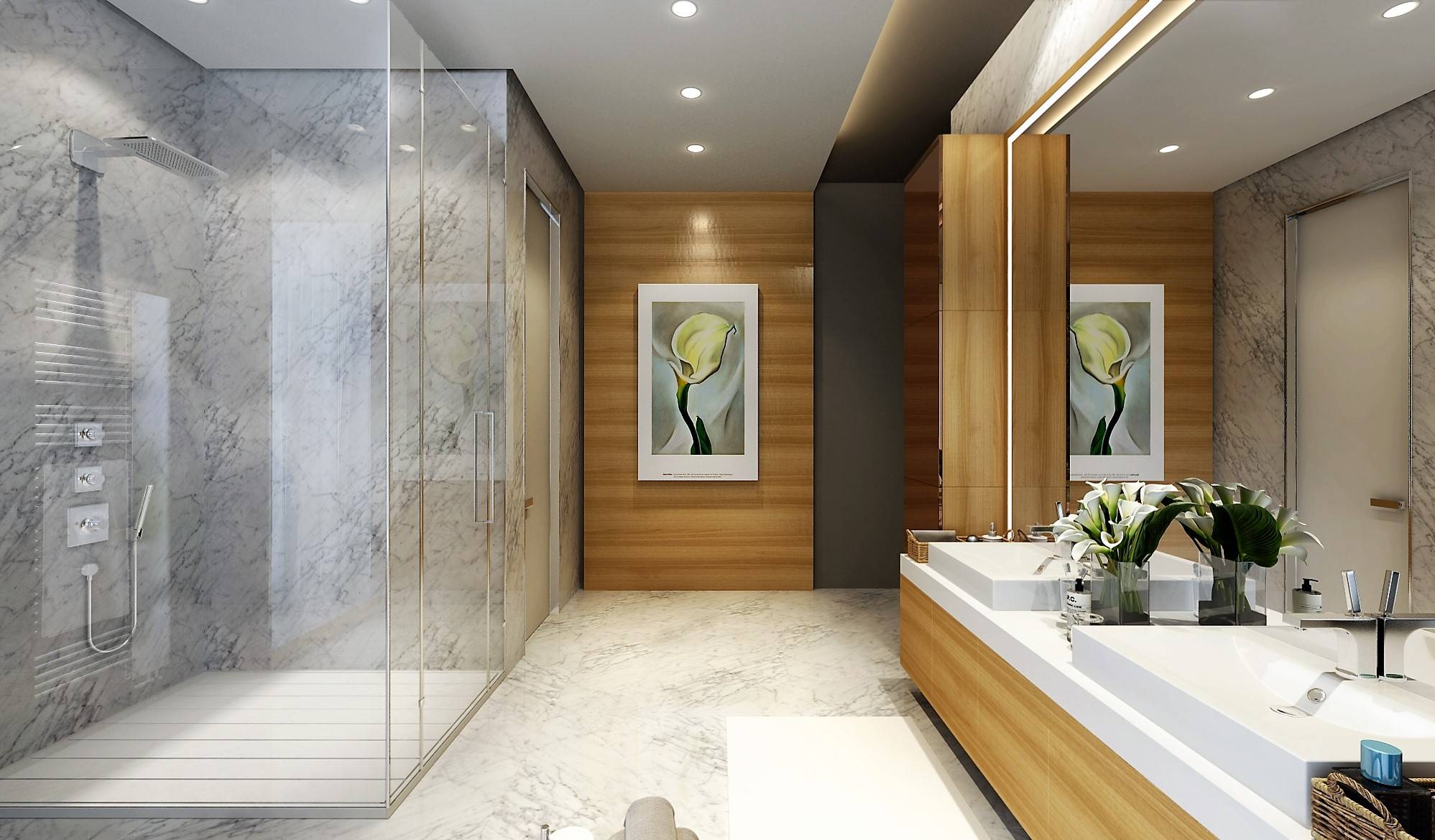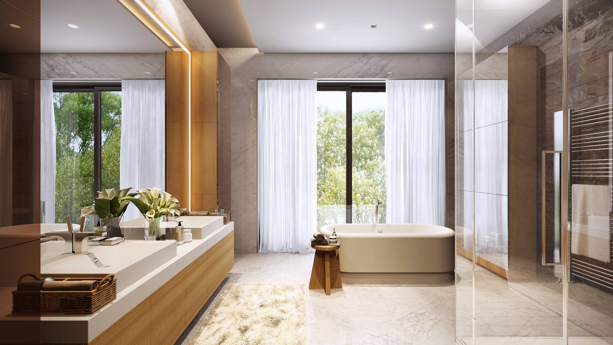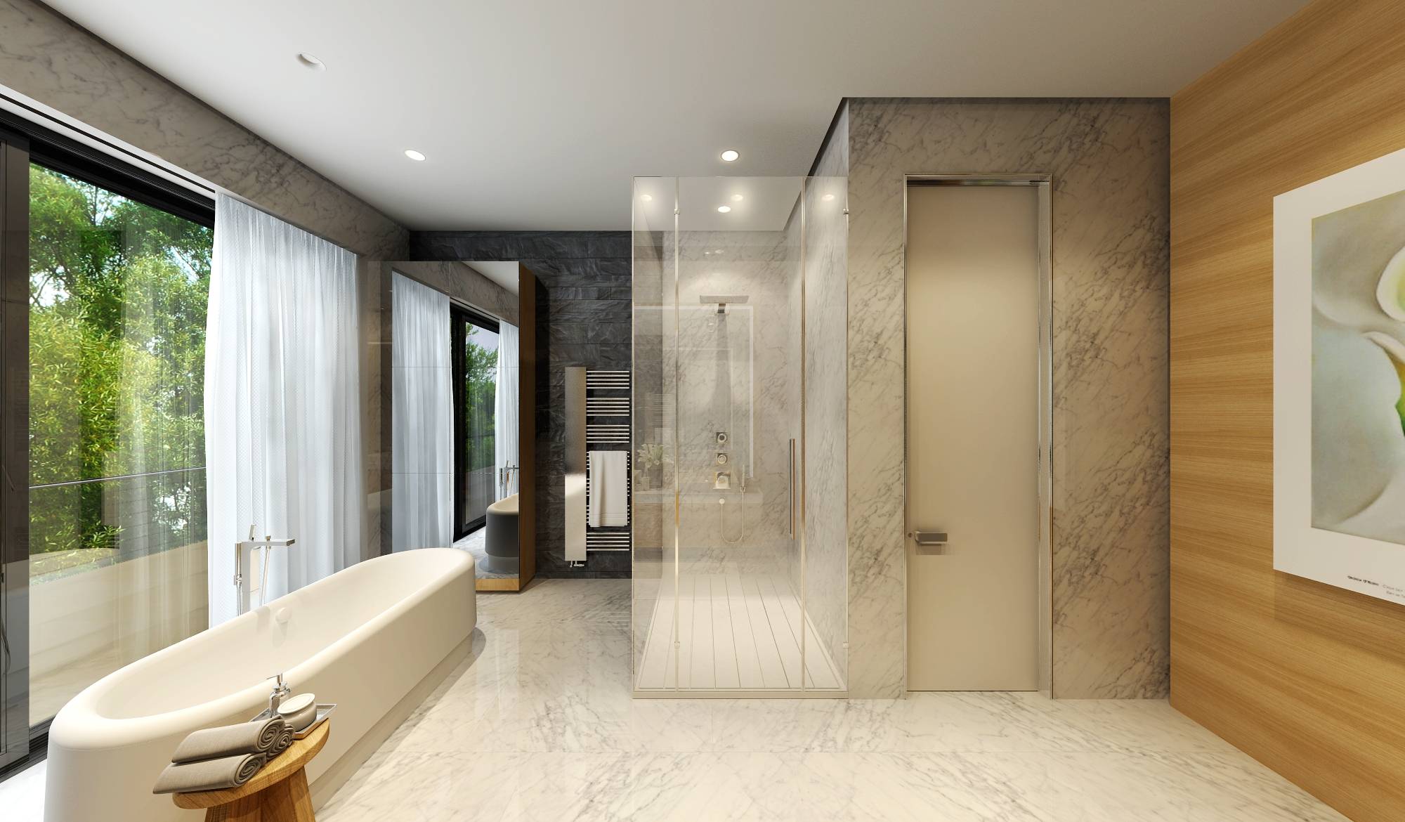 Просторное помещение с панорамным окном, вдоль которого установлена ванна. Угол отведен для душевой кабины: за счет прозрачных стенок и низкого поддона она практически сливается с окружением.