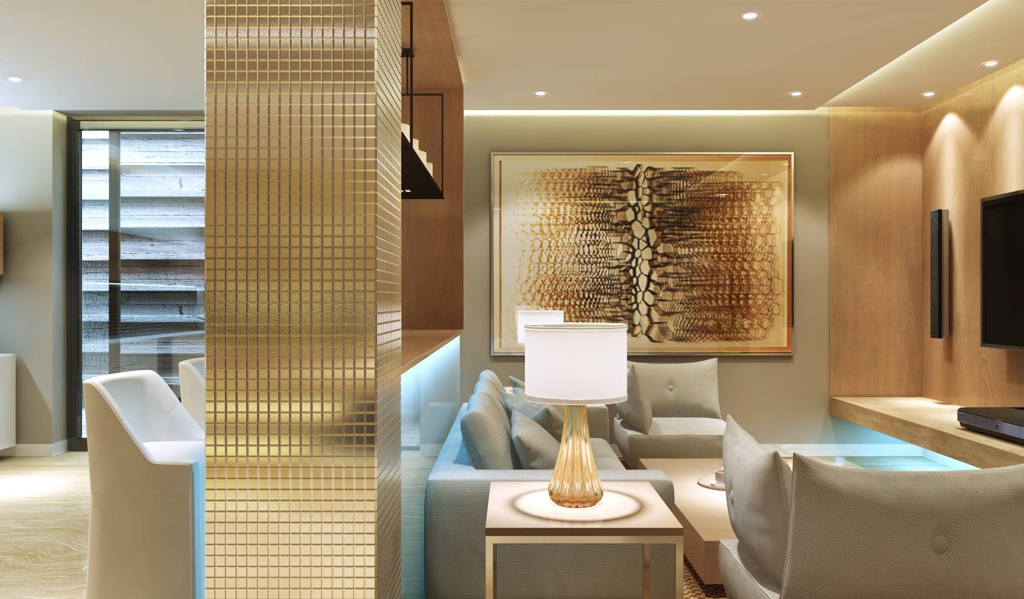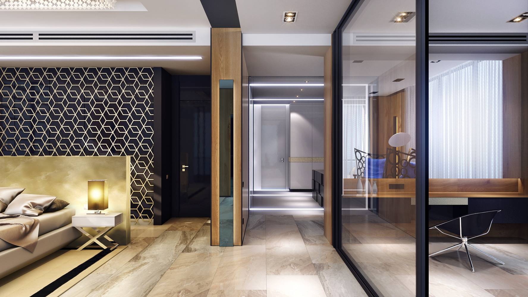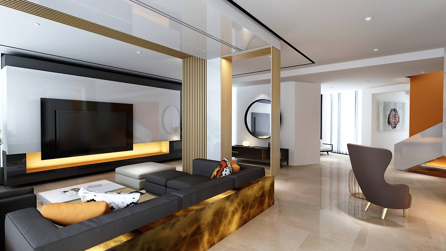 В основу дизайна заложены идеи конструктивизма: в оформлении преобладают крупные геометрические фигуры – прямоугольники, круги, квадраты. Контрастные цвета – белый, черный, серый – усиливают впечатления объемности и разноплановости пространства. Светло-коричневое дерево, которое активно используется в отделке, и золотые оттенки декора делают интерьер сияющим.