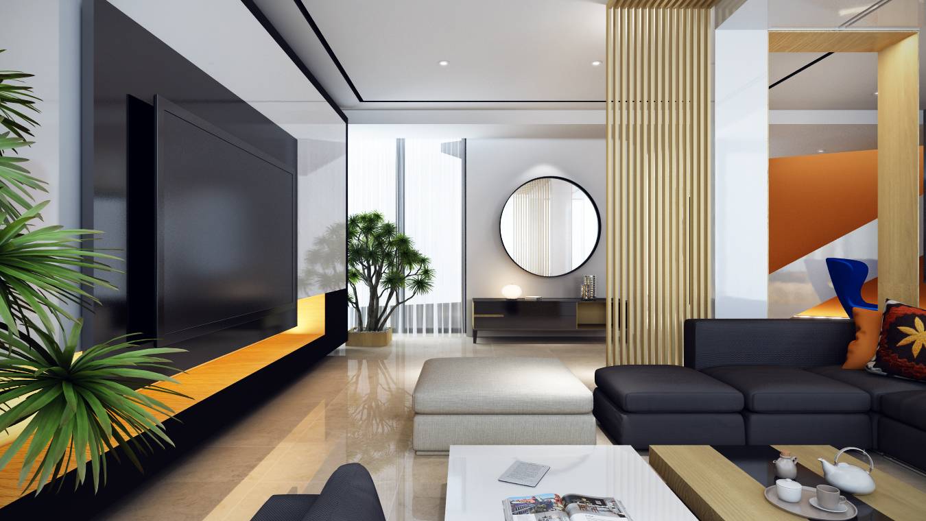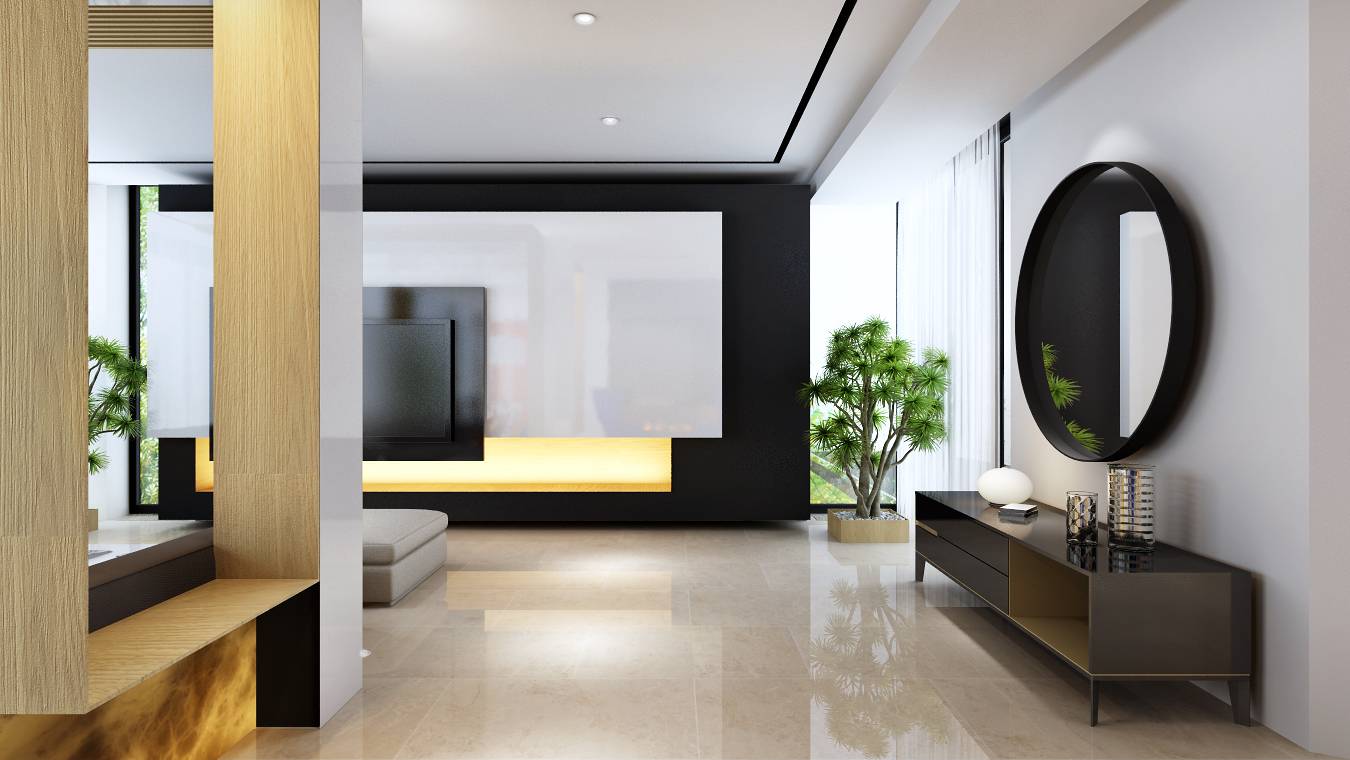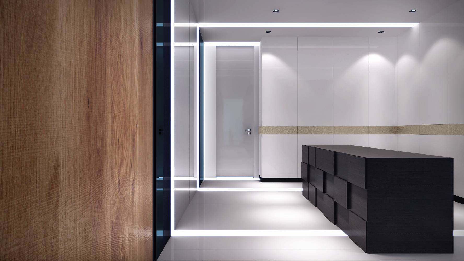 В основу дизайна заложены идеи конструктивизма: в оформлении преобладают крупные геометрические фигуры – прямоугольники, круги, квадраты. Контрастные цвета – белый, черный, серый – усиливают впечатления объемности и разноплановости пространства. Светло-коричневое дерево, которое активно используется в отделке, и золотые оттенки декора делают интерьер сияющим.