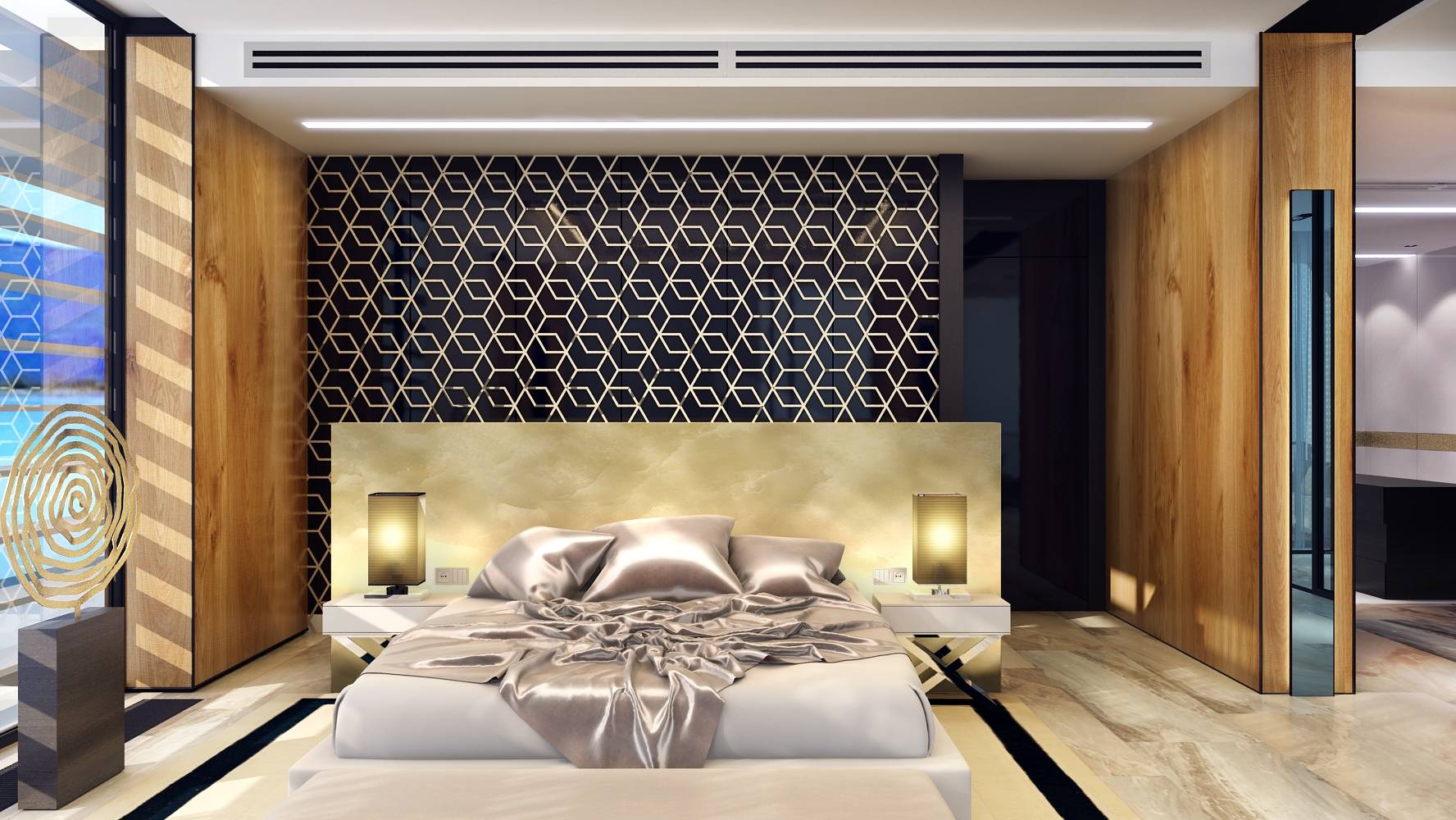 Напольная плитка под мрамор задает светлую основу интерьера. Прямоугольное изголовье кровати тоже оформлено под камень. Акцент орнаментом сделан на стену за кроватью и синие кресла с металлическим декором. Решетка встроенной в потолок системы кондиционирования смотрится естественной частью дизайна.