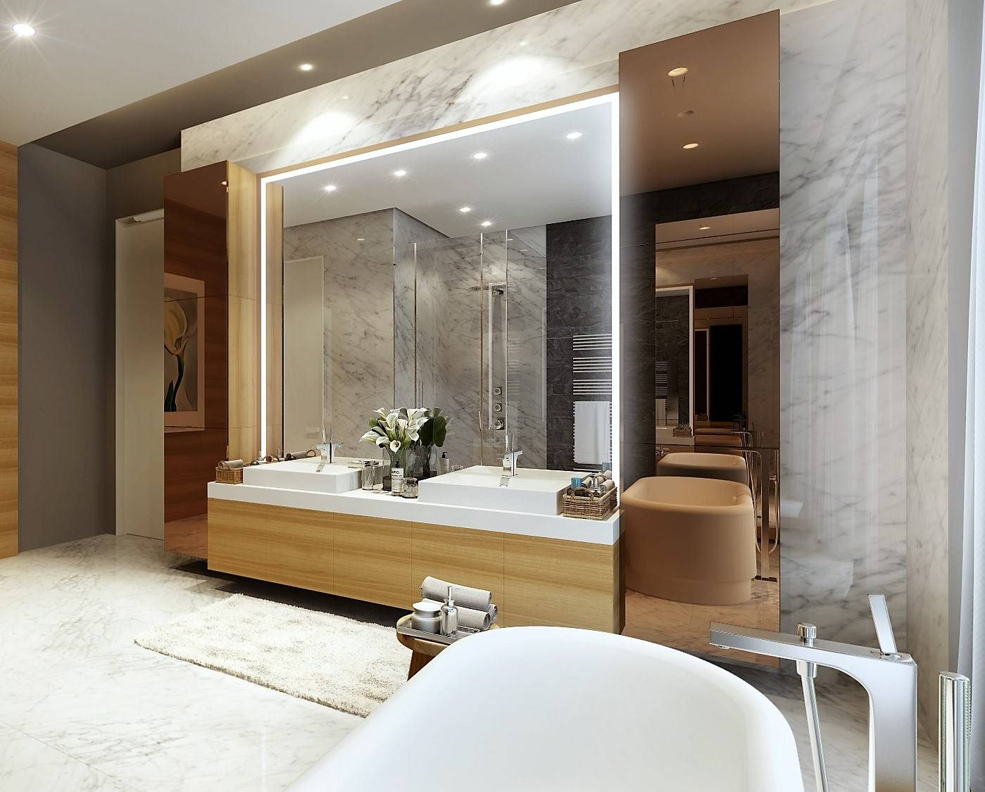 Интерьер частного дома активно работает с масштабом – крупными зеркалами, настенными панелями, светильниками. Большие плоскости выделены контрастными цветами. В дизайне мебели встречаются сложные хромированные конструкции, привлекающие внимание. Плитка и керамогранит светло-серых оттенков сочетаются с теплой палитрой дерева, золотой подсветкой, делая изысканный интерьер ярче и благороднее.