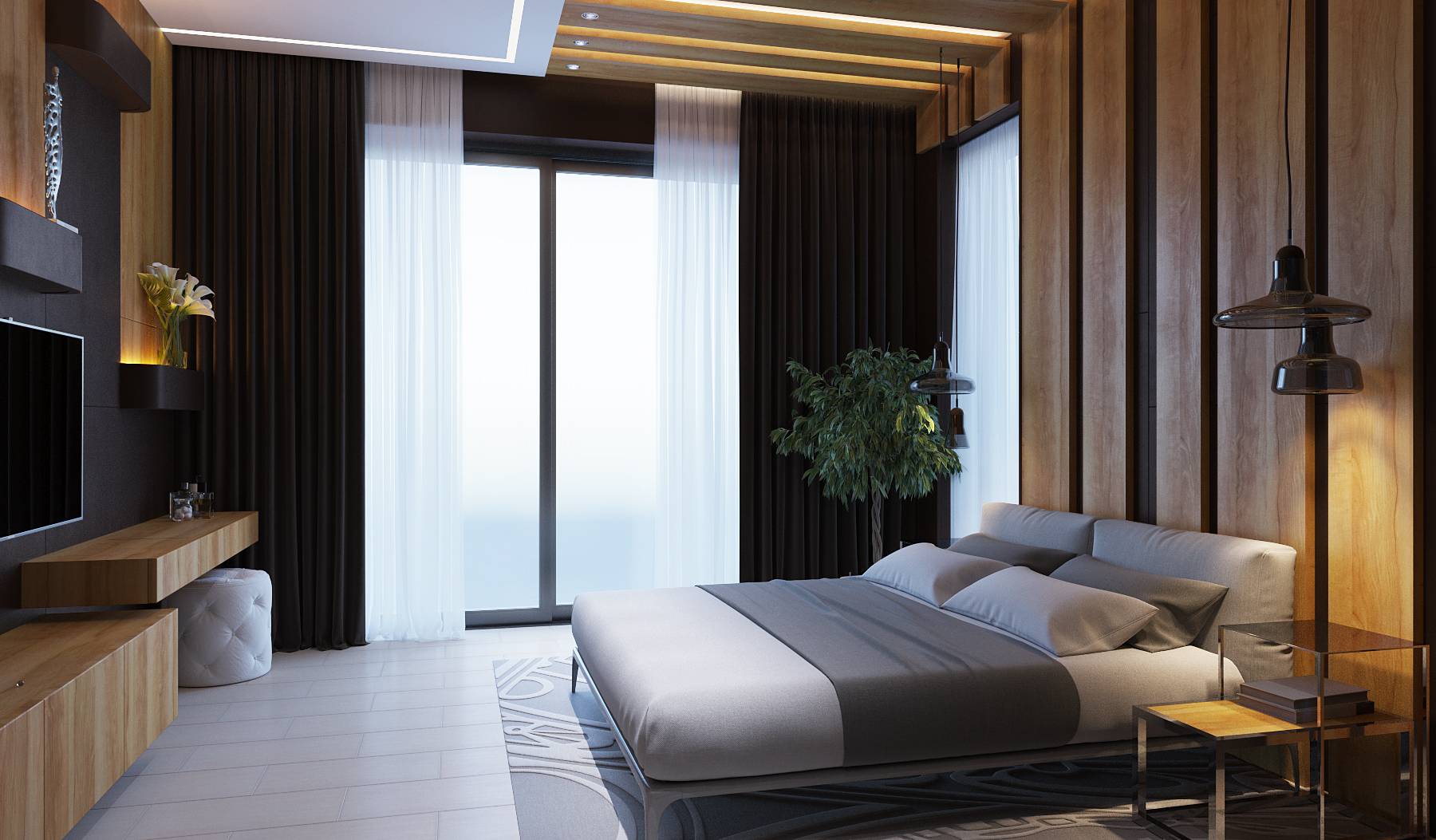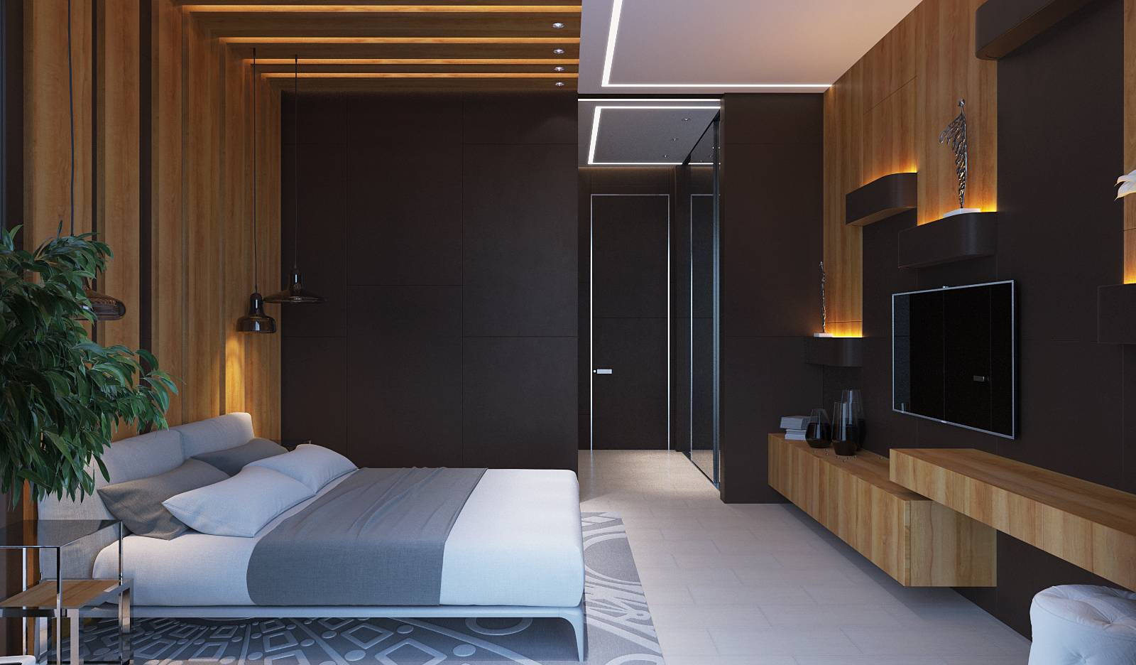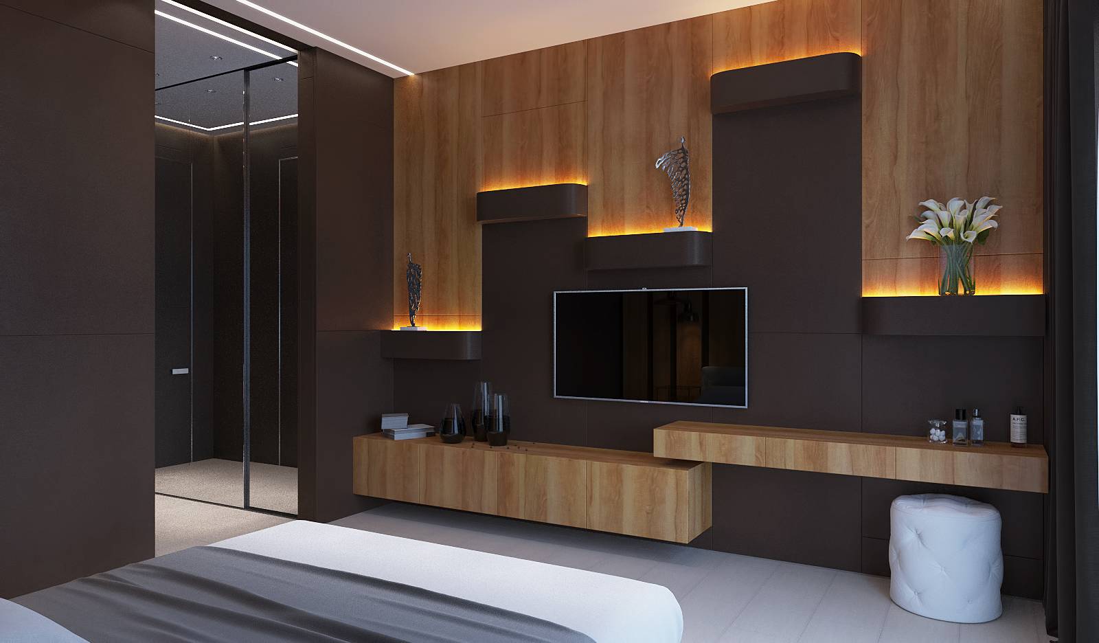 Темно-коричневые, почти черные, матовые стены комбинируются с деревянной обшивкой. Спальное место акцентировано декором из параллельных досок на стене и потолке. ТВ-зона оформлена инсталляцией из фигурных полок на разной высоте. Направленная вверх желтая подсветка создает ощущение, что стена многослойна. Туалетный столик оформлен в едином стиле с ТВ-тумбой, обе конструкции – подвесные.