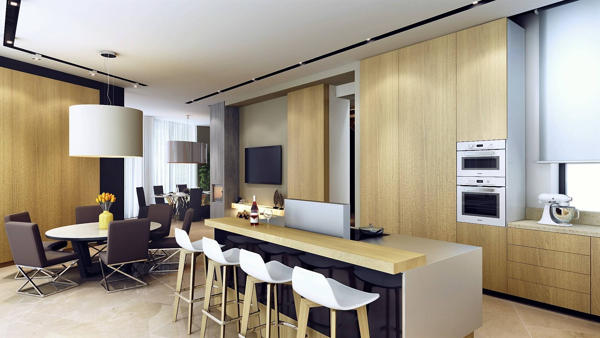 Кухонный фронт расположен углом вдоль панорамных окон. В центр помещения вынесен «остров» с плитой. С тыльной стороны к нему надстроена деревянная столешница, и «остров» одновременно выполняет функцию барной стойки.