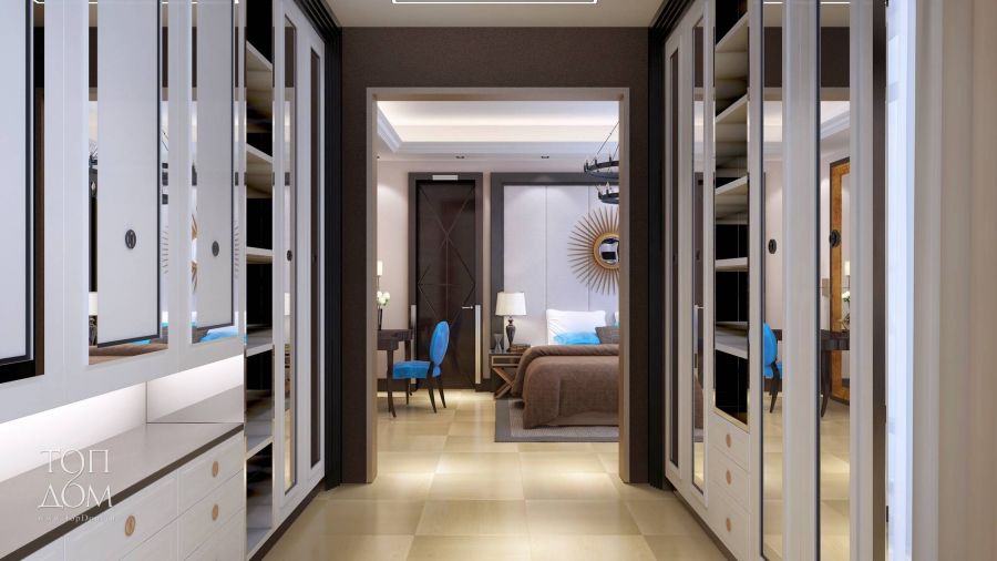Интересное решение найдено для спальни из проекта красивого интерьера коттеджа. Она совмещается с большой гардеробной зоной с естественным освещением. Часть шкафов встроена за перегородкой с телевизором. Светлая фоновая палитра помогает восприятию пространства как единого целого.