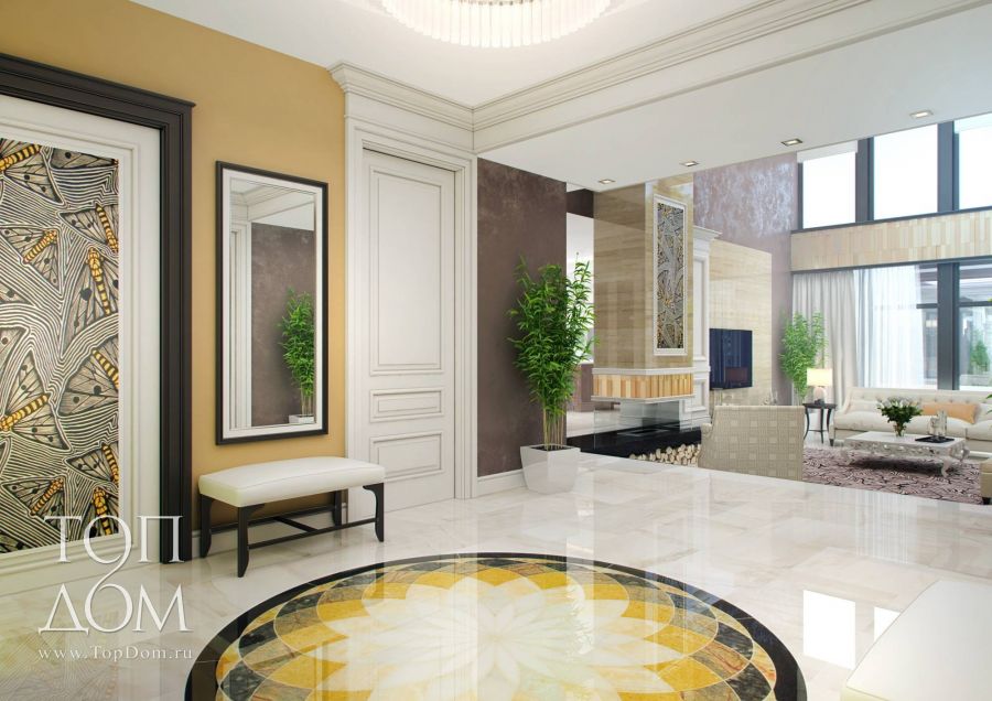 Широкий холл из проекта дизайнерских интерьеров коттеджа в п. Соверен – прекрасная точка обзора для гостиной, которая располагается чуть ниже. Зеркальные вставки на входных дверях выигрышно отражают свет из панорамных окон зоны отдыха.