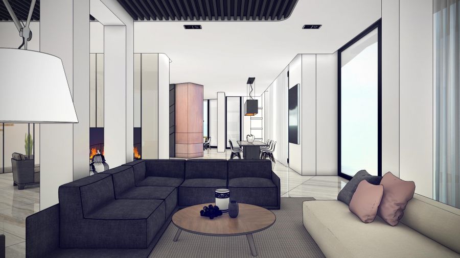 Современный интерьер жилого дома с открытыми объемами, нейтральными цветами и природными фактурами разработан в проекте стильного дизайна коттеджа в Крыму. Зоны гостиной, столовой и кухни размещены последовательно, их планировка формируется вокруг холла с камином.